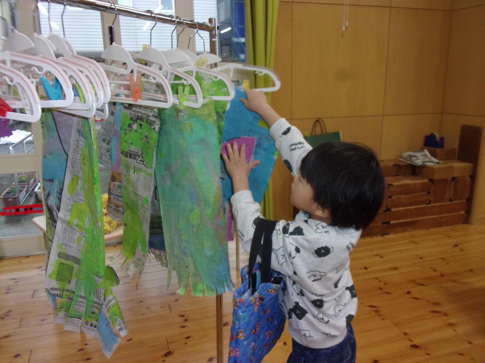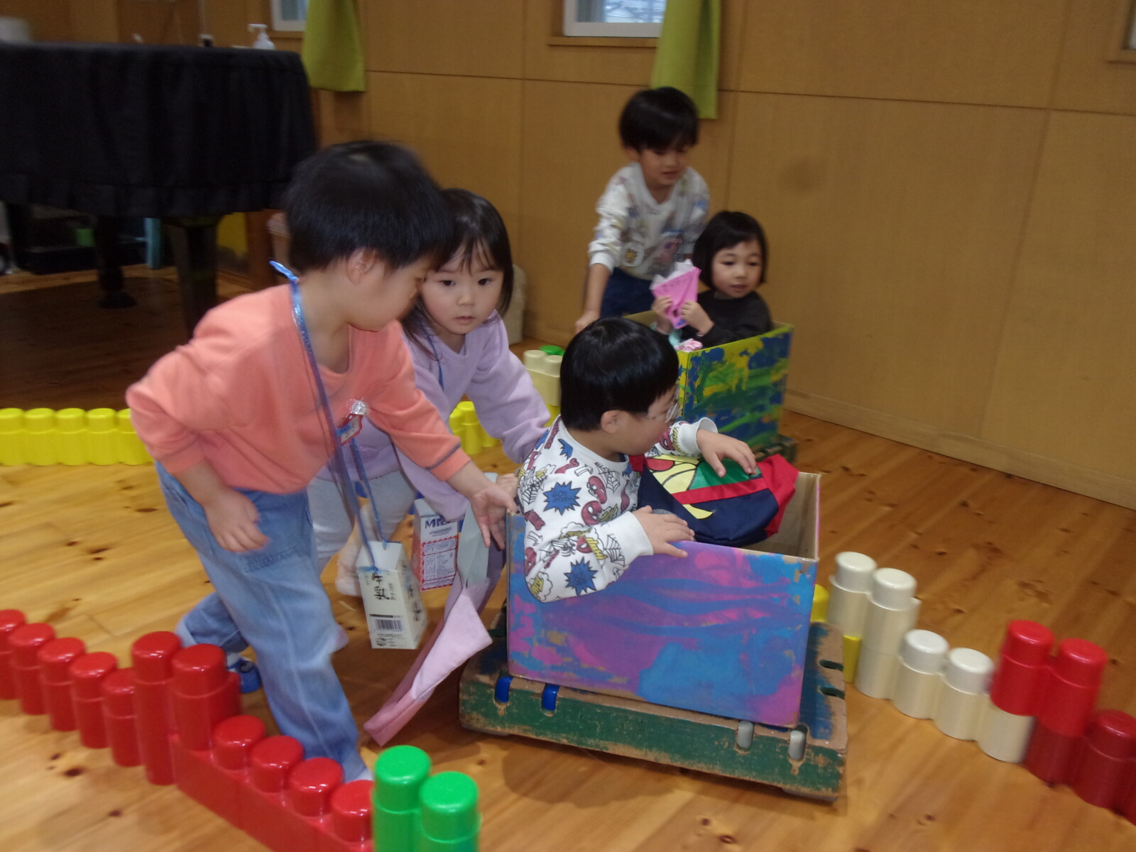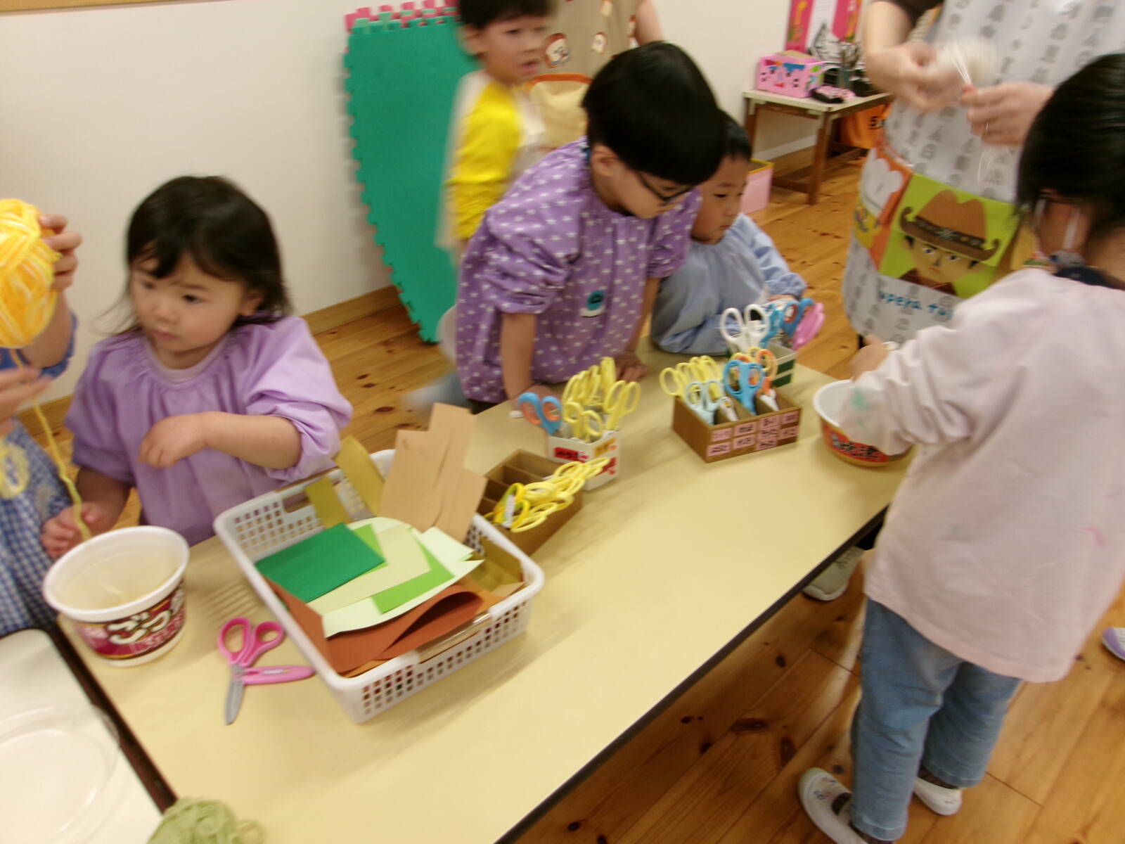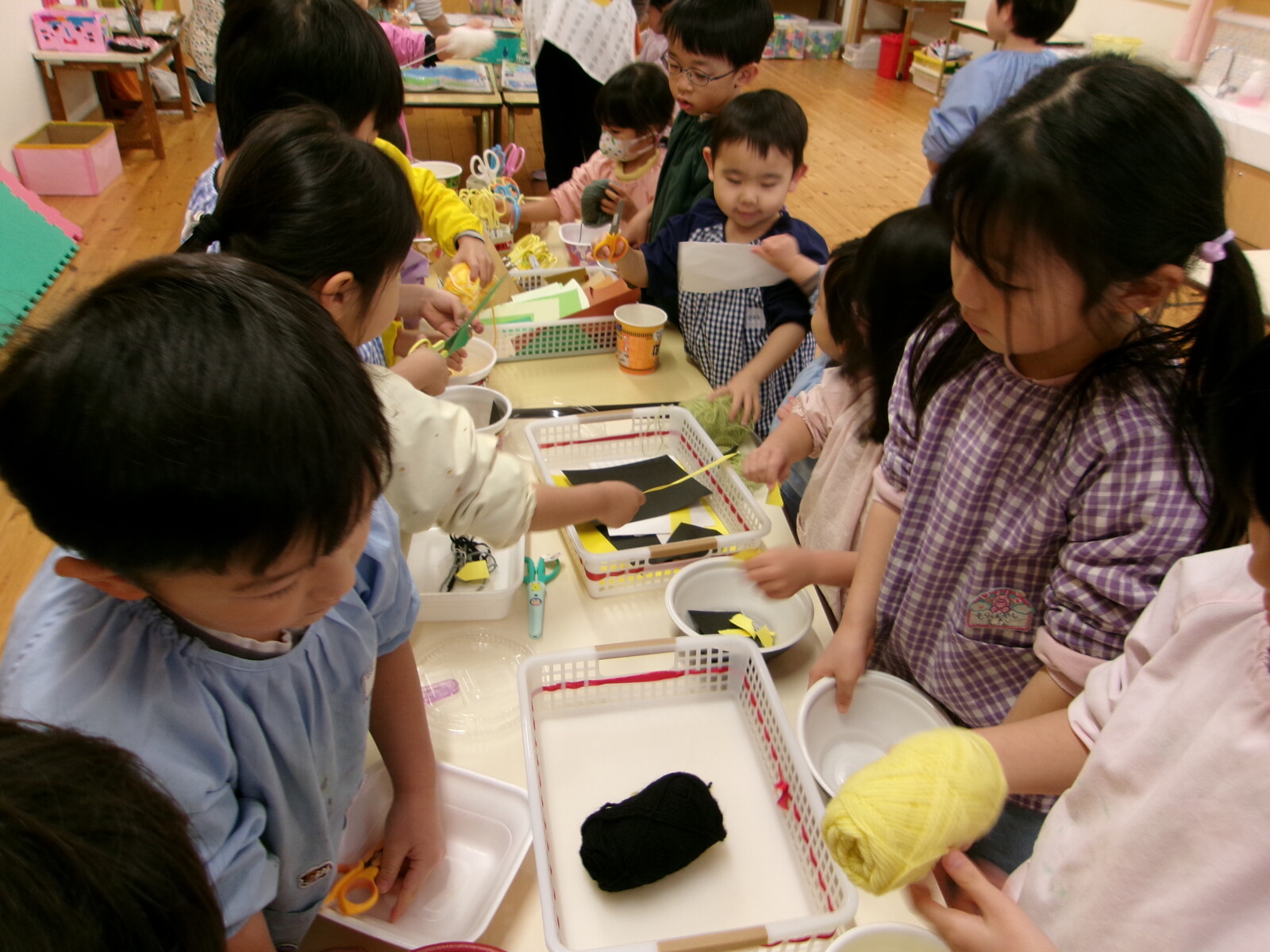 郵便ごっこではがきを買ったり、廊下にあるおままごとコーナーでレストランごっこをしたり、大型絵本からイメージを広げお買い物ごっこに発展したり、さまざまな姿が見られました。そんなある日、クラスにあるおままごとや絵本、空き箱を並べお買い物ごっこを楽しみましたが、あっという間に売り切れに・・・「品物足りないよね」「もっとたくさんお買い物したいな」「どうすればいいかな?」と話し合いをするとうめ組さんから「みんなで作れば?」ととてもいいアイデアが出ました。その後、何を作りたいかどんなおみせにしたいかを話し合い、全クラスで活動を進めていきました。