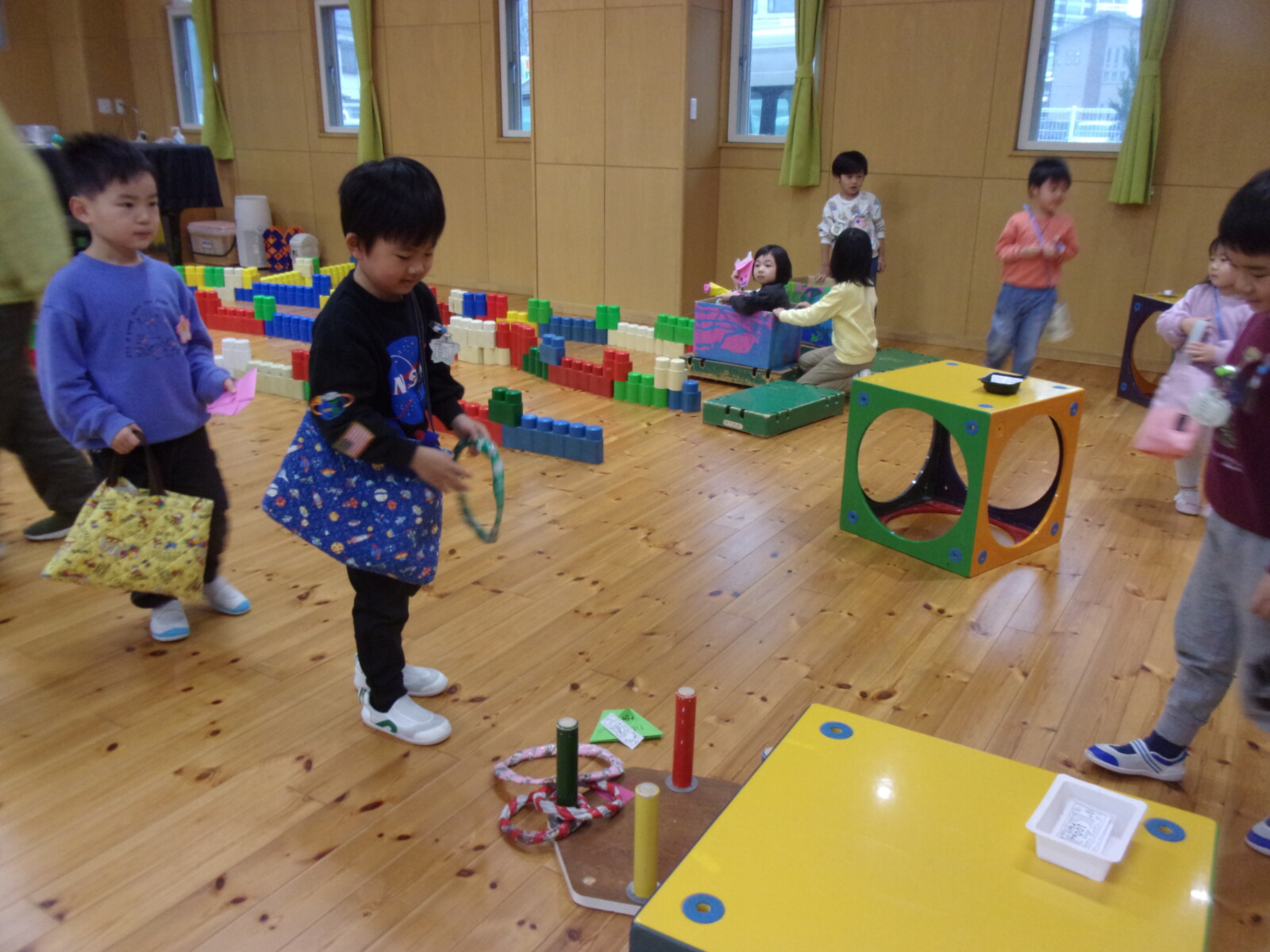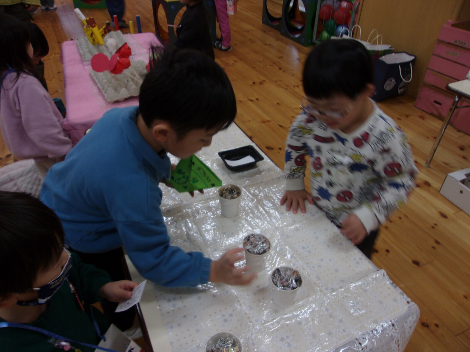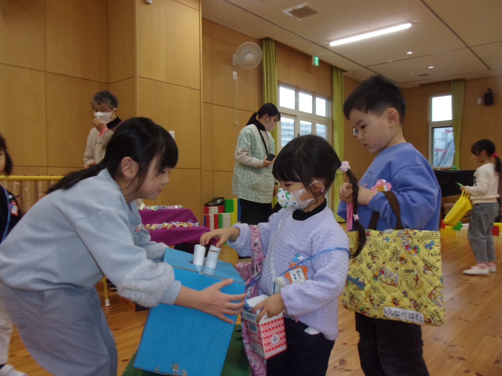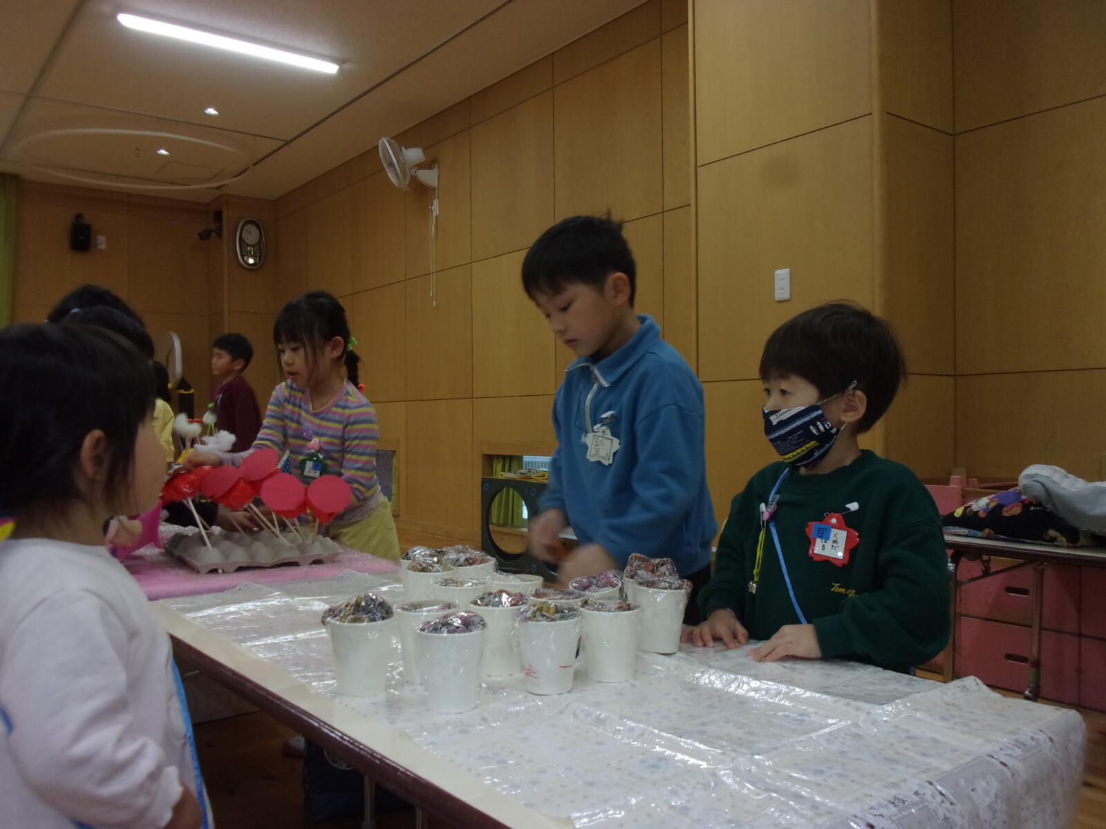 おみせやさんごっこ当日は、おみせやさんになったりお客さんになったりと大忙し!買い物より景品のないゲームばかり楽しむ子もいました。おみやげが少なくても、自分の好きなおみせでゲームを楽しみ、満足しているようでした。