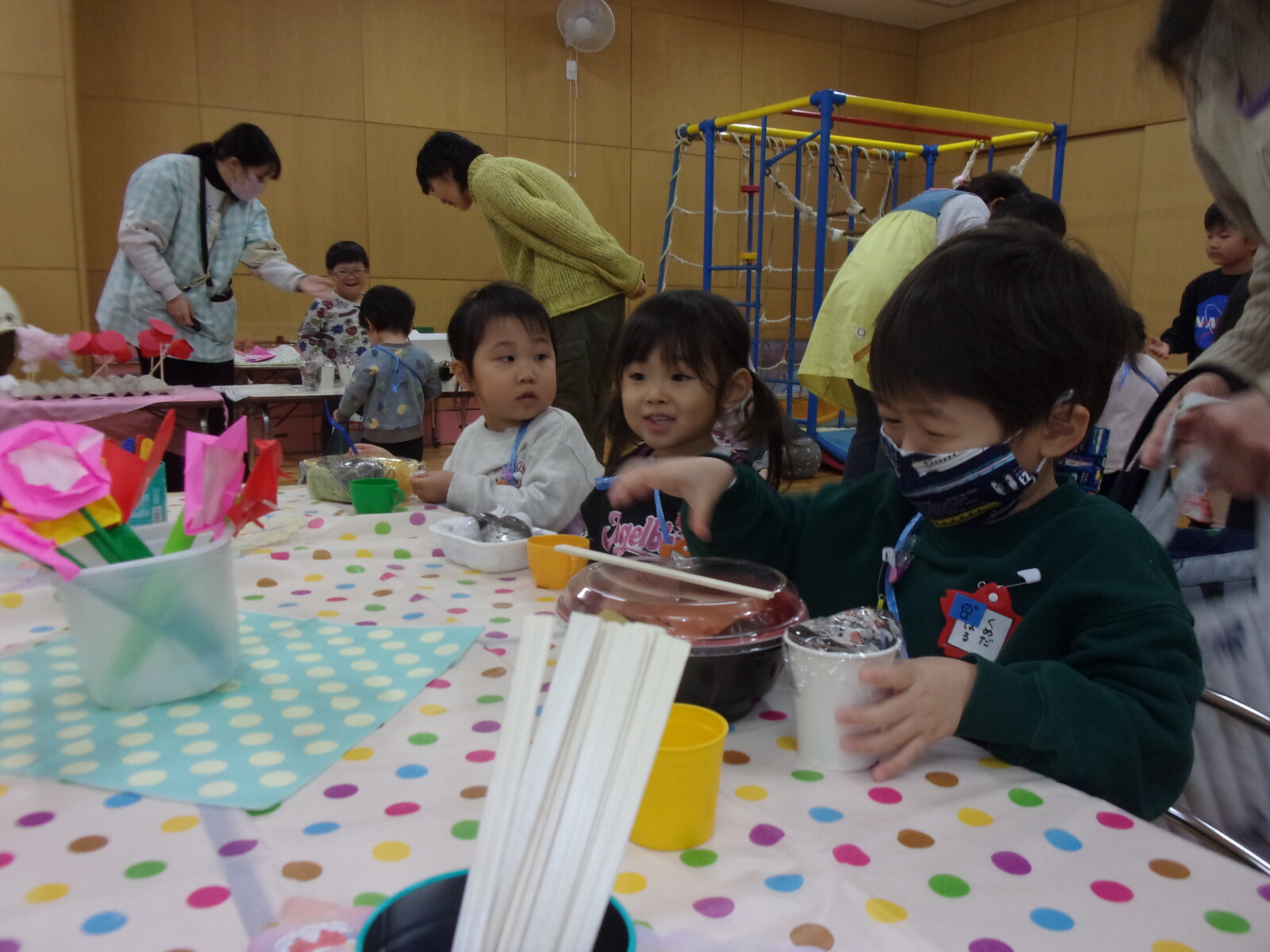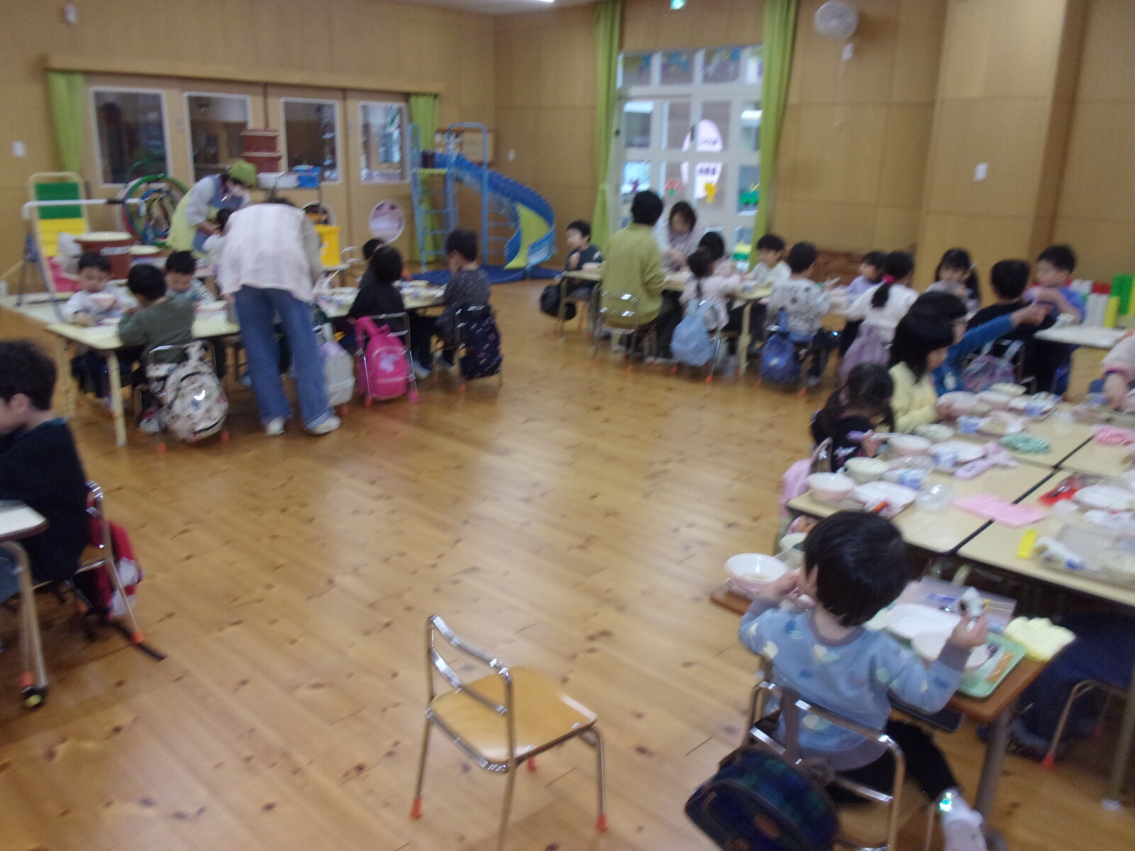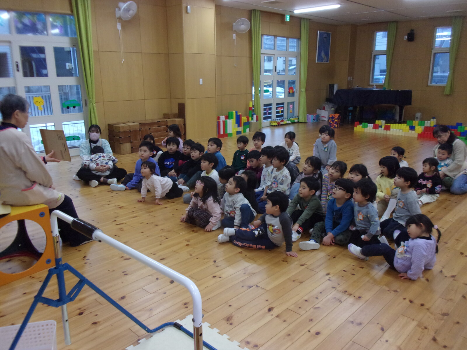おみせやさんごっこの後はみんなでホールで給食を食べ、食後園長先生に紙芝居を読んでいただきました。