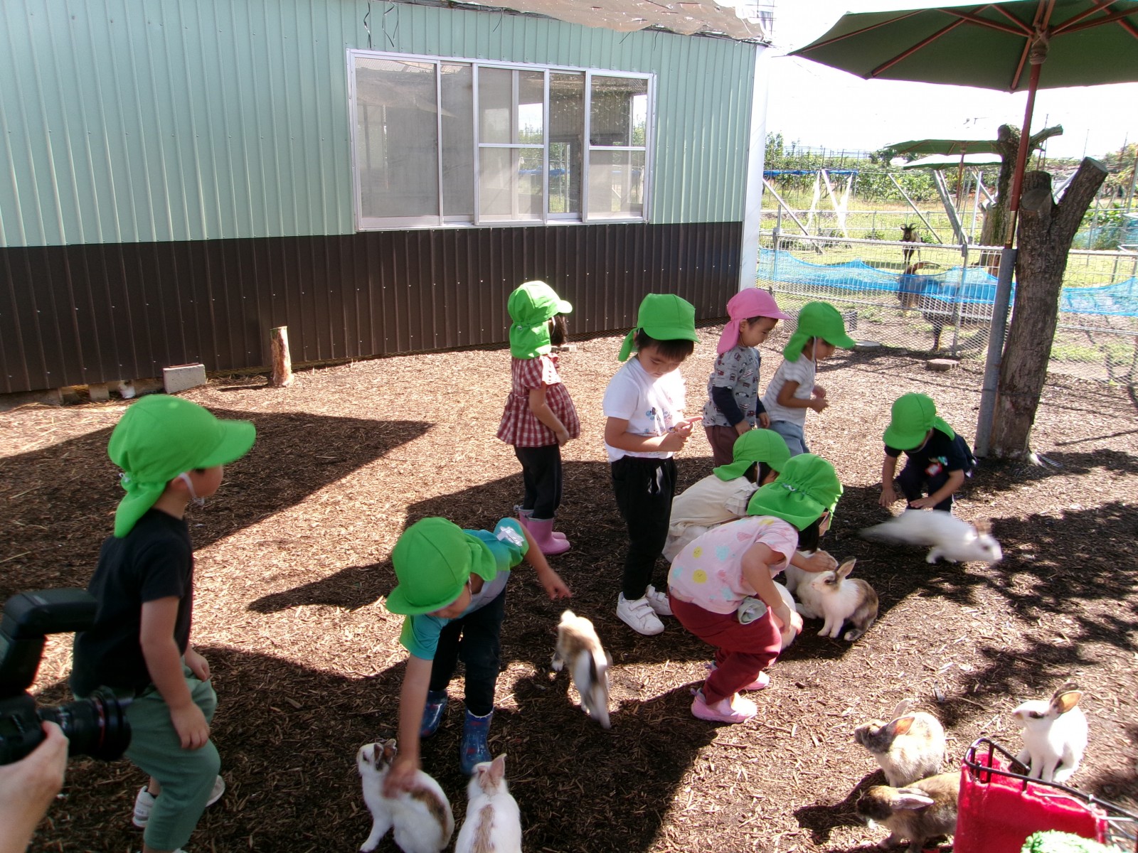 前日は雷雨・・・当日の朝も小雨が降り、グレープガーデンの食事スペースは屋根があるとはいえ子どもたちが遊ぶ広場や梨畑の足元がぬかるんでいないか、と現地に着くまではドキドキでした。登園してくる子どもたちは「遠足楽しみ!」という子もいれば「雨降っているね」とドキドキしながらくる子、そして「幼稚園来るとき虹が見えたよー。」と嬉しいお知らせをしてくれた子もいました。大型バスに乗って出発!グレープガーデンは昨日の雨が嘘のようにぬかるみもほとんどなく、梨狩り、動物との触れ合い、そして広場で走りまわったりと爽やかな秋空の下楽しい一日を過ごすことができました。お家の方からご用意いただいたお弁当も子どもたちは大喜びでお友だちとお弁当を見せ合っていました。帰りのバスでは疲れて眠る子もいました。