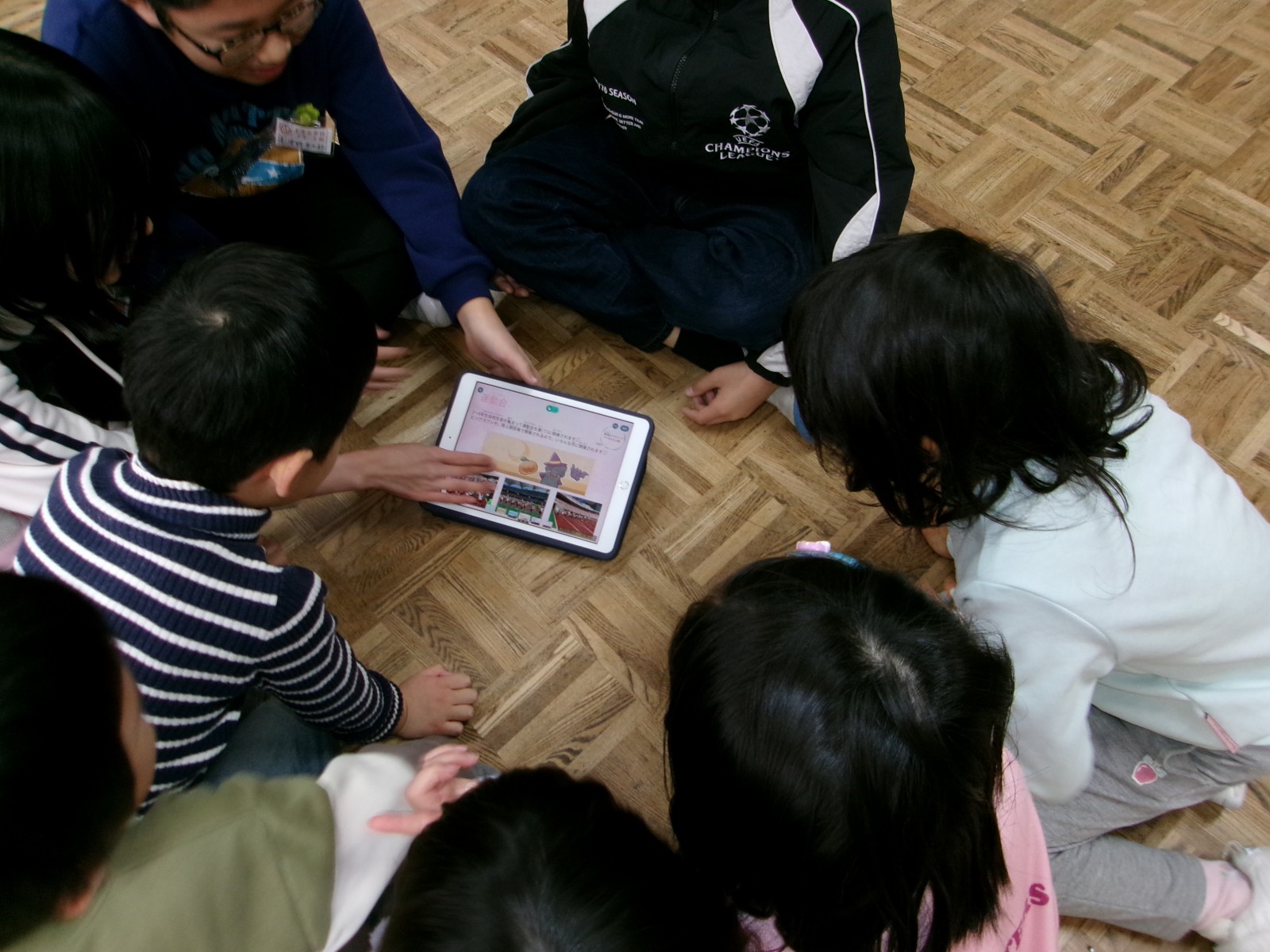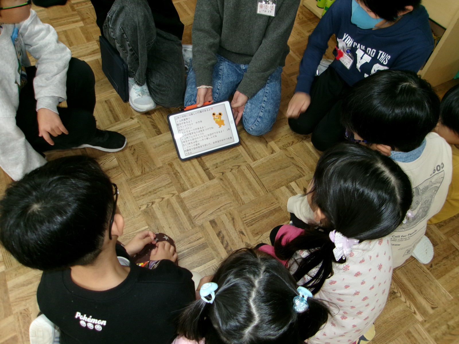 学校に関するクイズや間違い探しなど、タブレットを使って上手に次々とクイズが出され、子ども達の緊張がだんだんほぐれていきました。