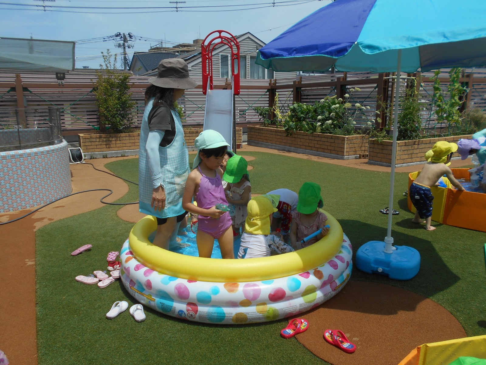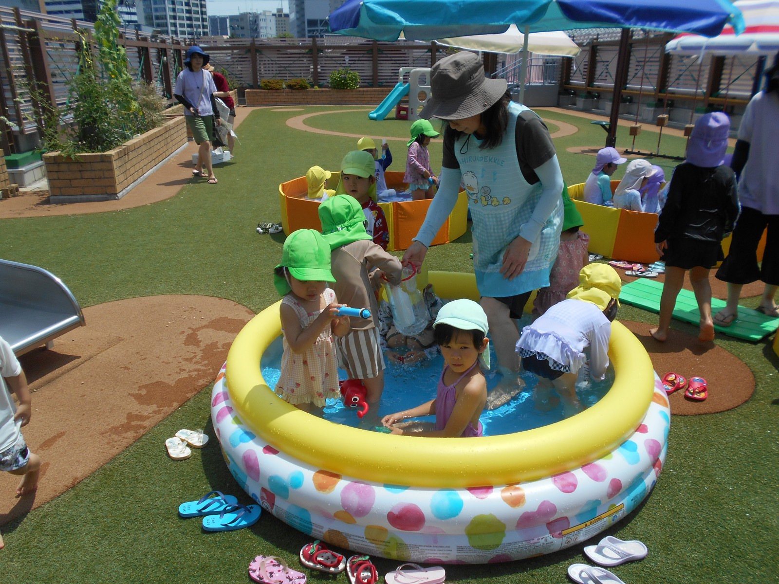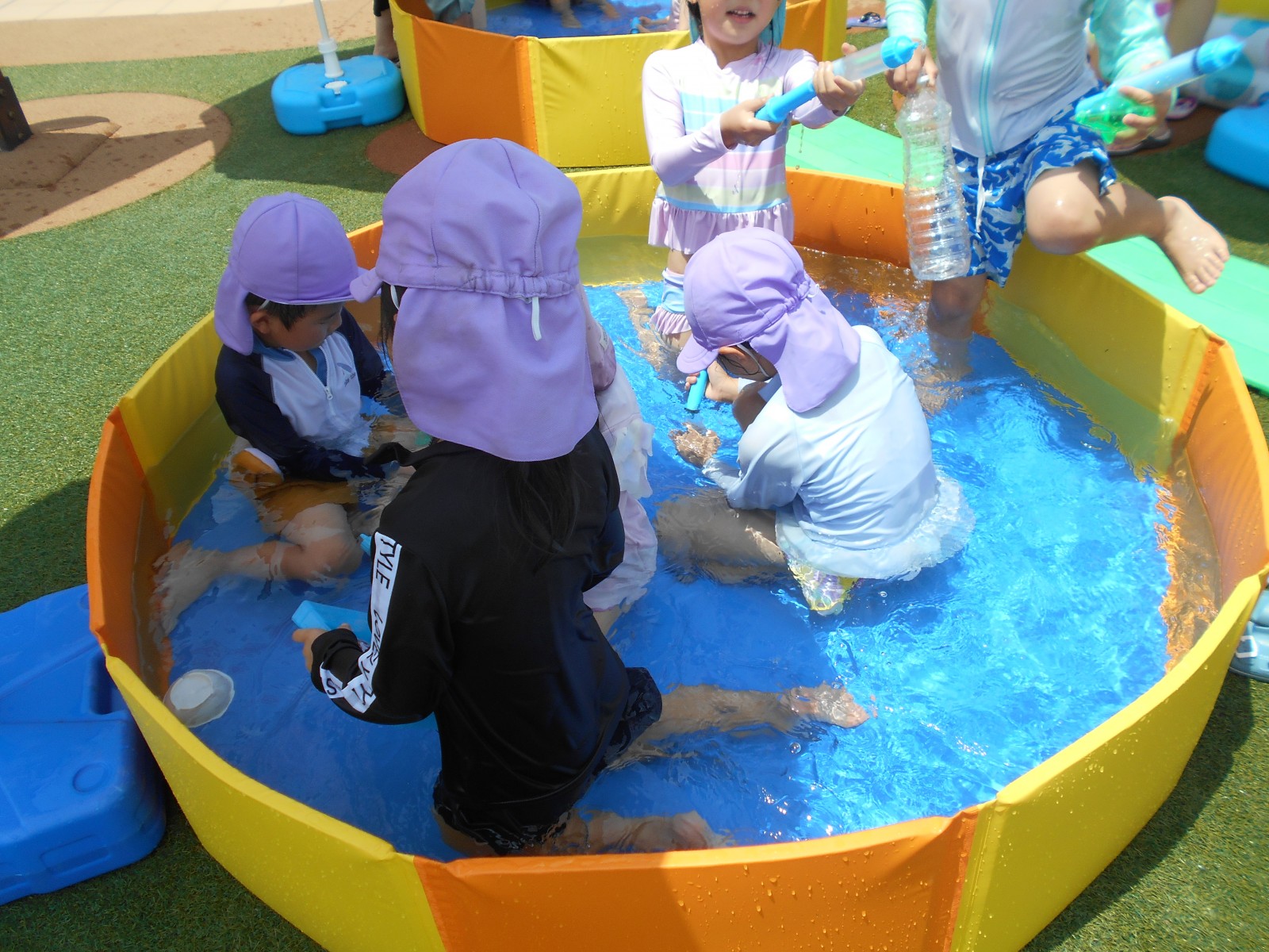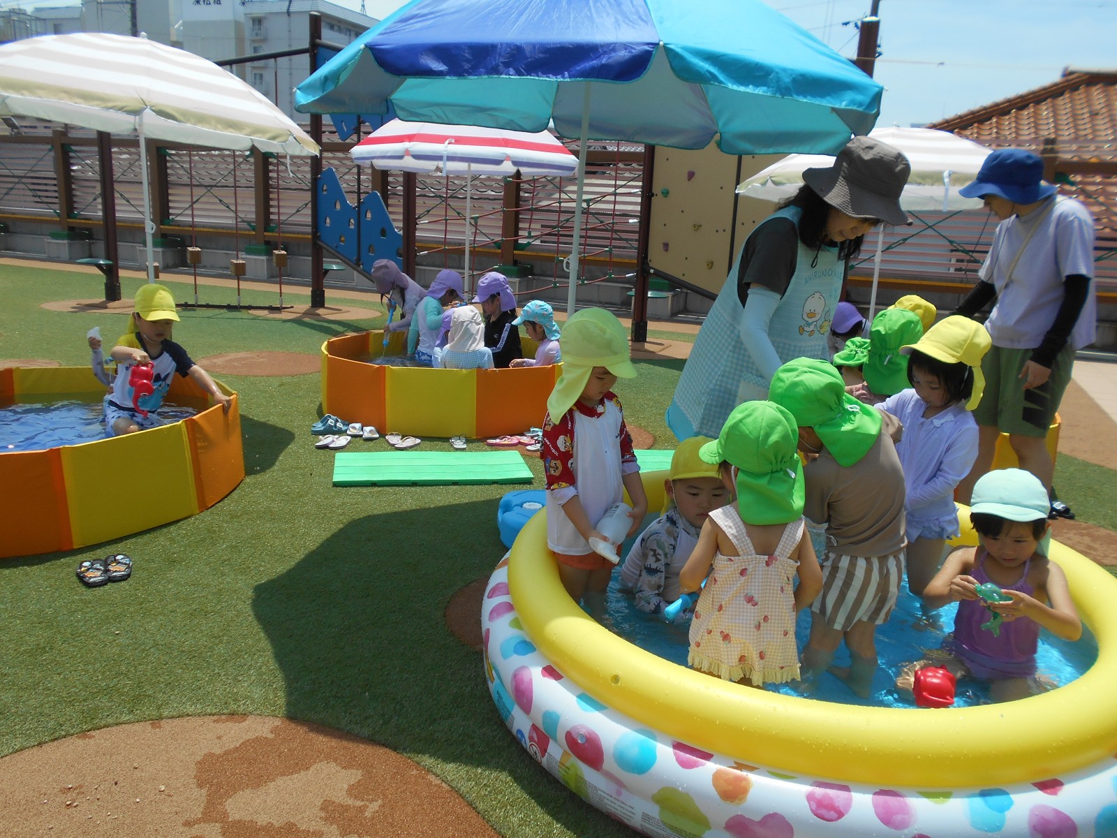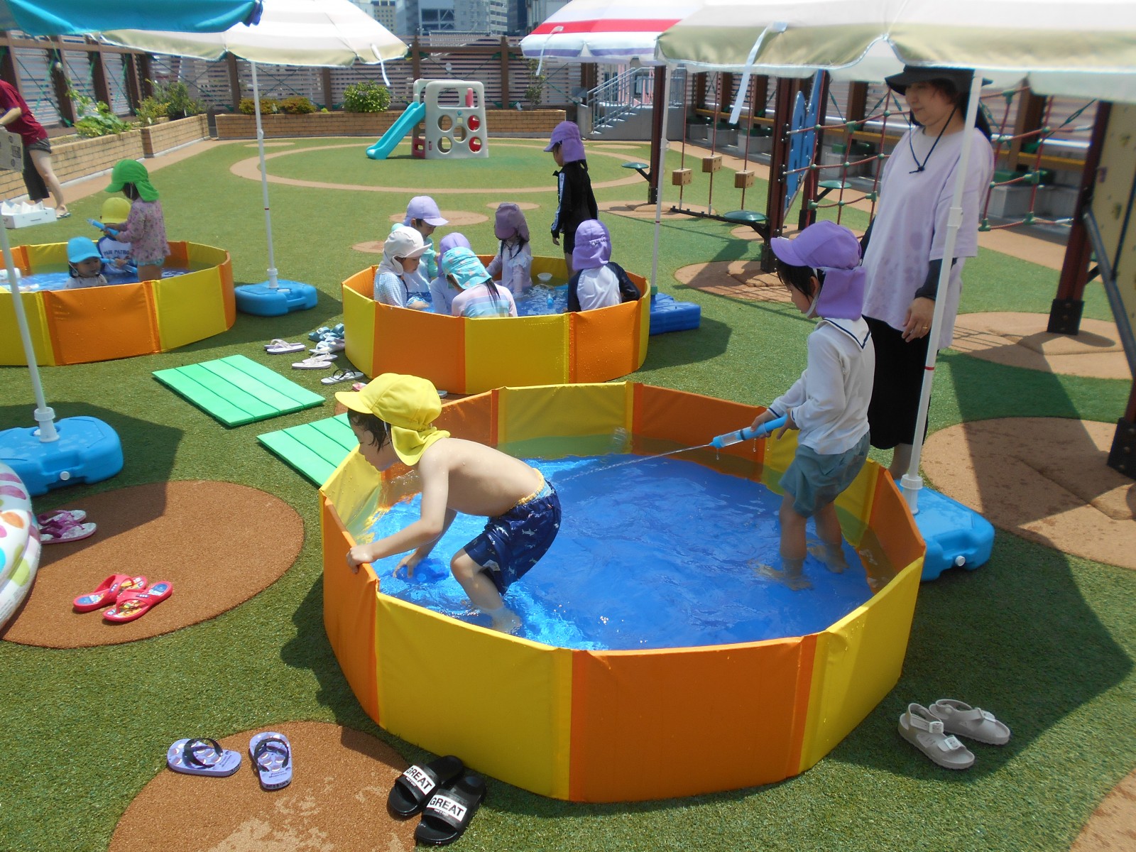 子どもたちの思いをお日様が見ていたかのように暑くなりました。「今日は暑いからプールしよう!」と言うと大喜びの子どもたち。園庭のパタパタプールで足をバタバタさせたり、水鉄砲で遊んだりと思う存分楽しみました。初めてのすみれ組(3歳児)ひよこ組(満3歳児)の子どもたちもほとんど嫌がることなく気持ちよさそうに遊んでいました。これからも天候を見ながらたくさん水遊びをしていきたいと思います。7月中旬には中央区東公園に併設されたあずまプールがオープンするので、そちらにも遊びに行く予定です。