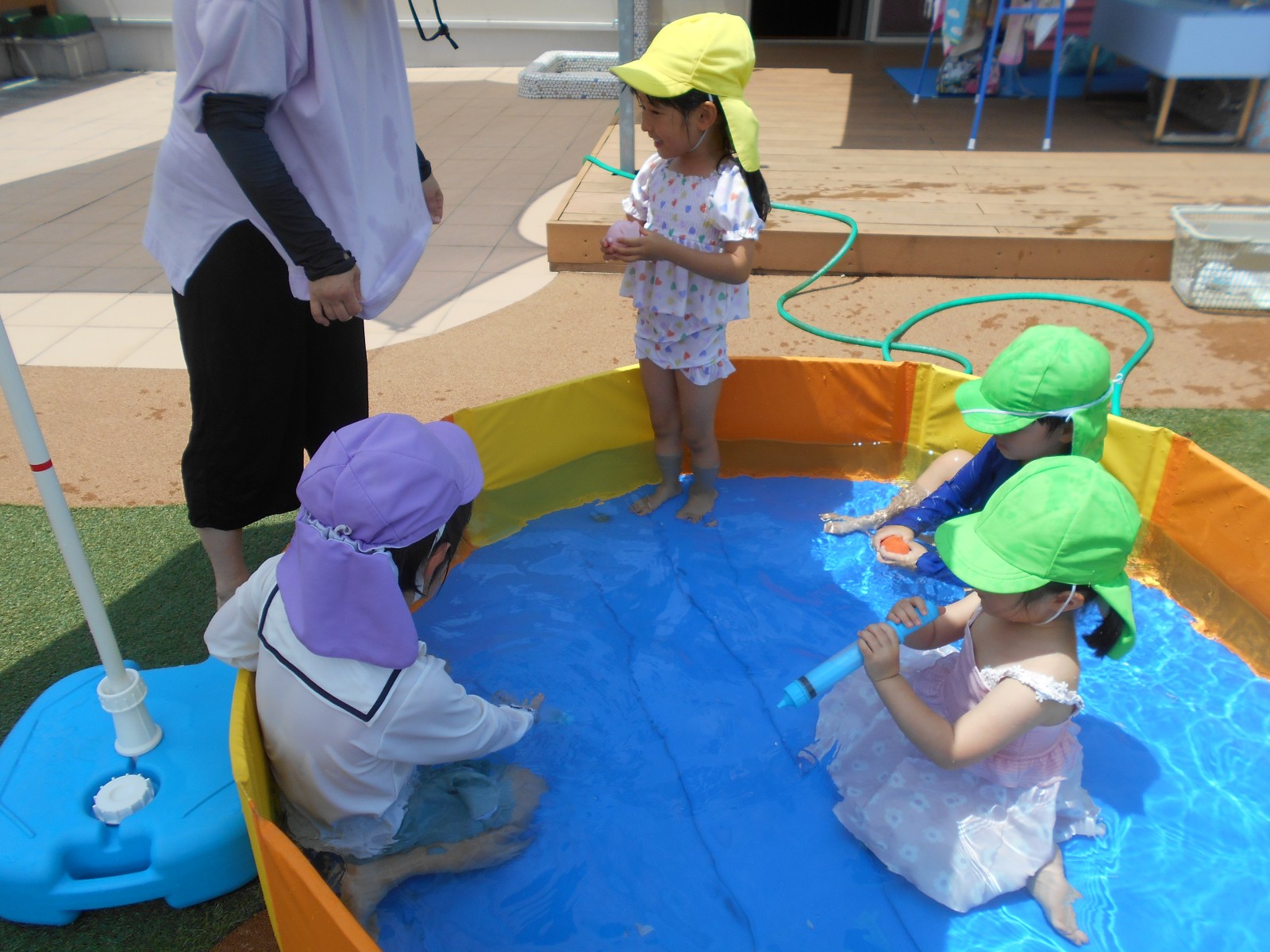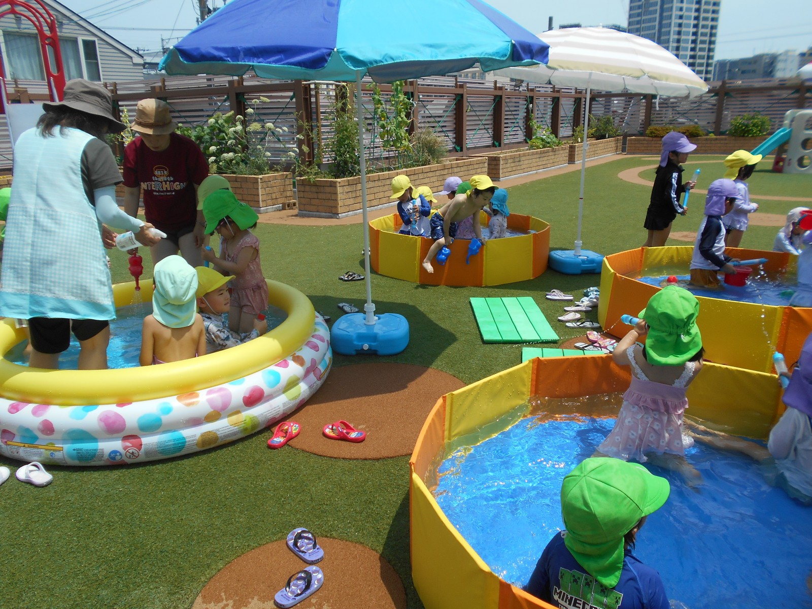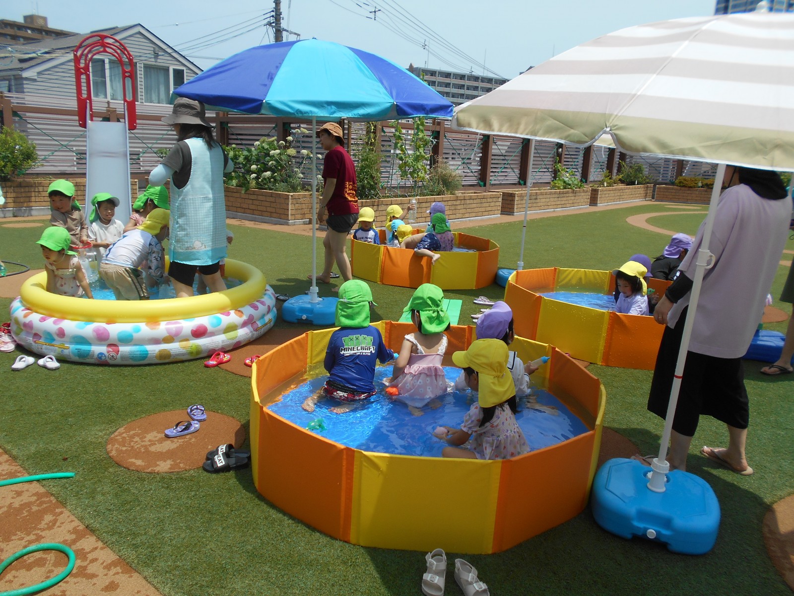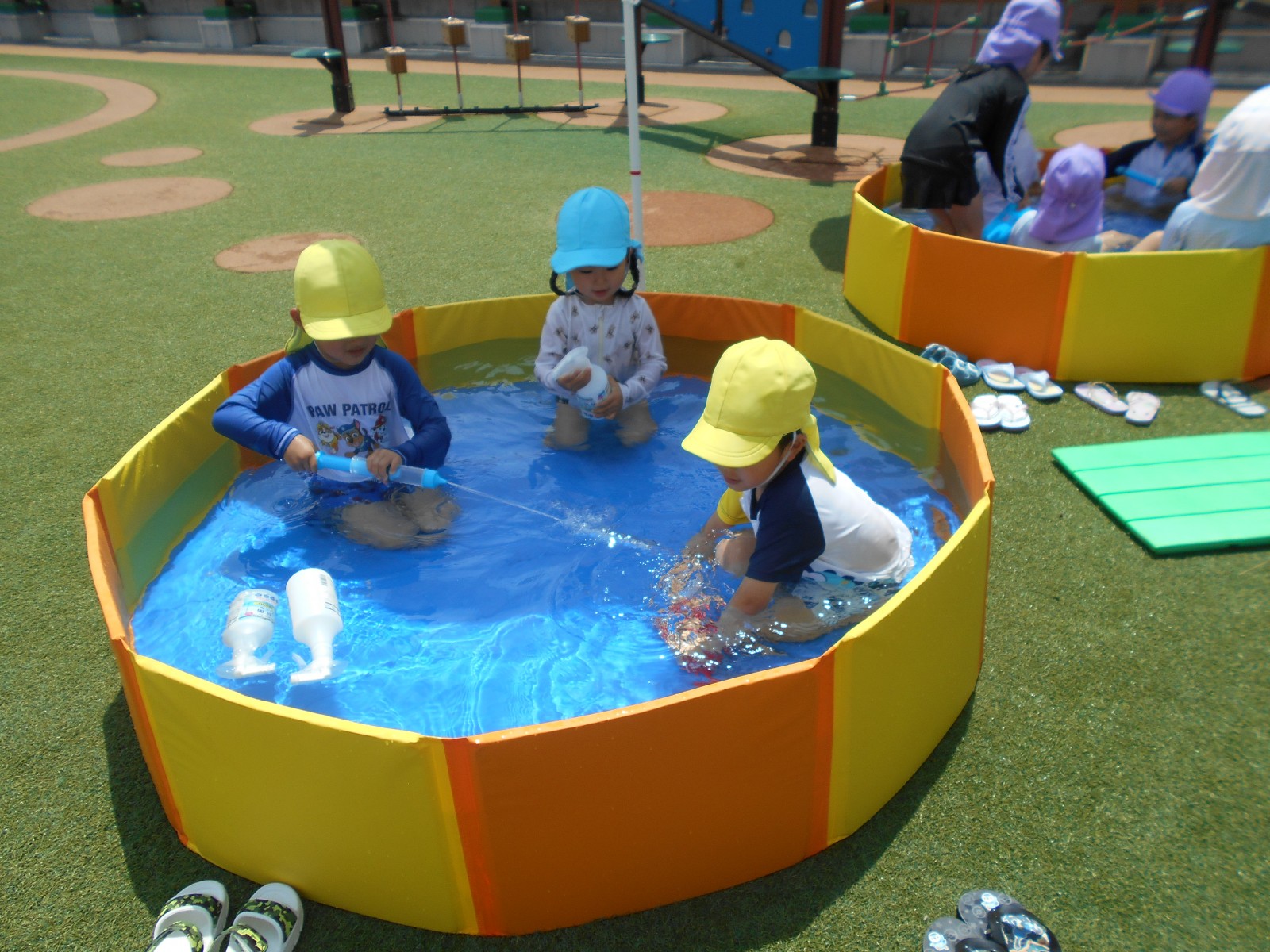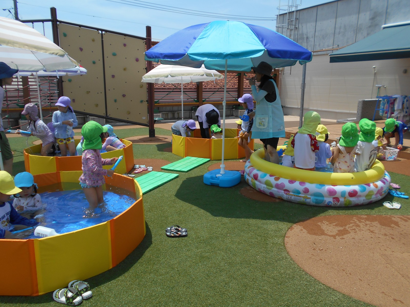 子どもたちの思いをお日様が見ていたかのように暑くなりました。「今日は暑いからプールしよう!」と言うと大喜びの子どもたち。園庭のパタパタプールで足をバタバタさせたり、水鉄砲で遊んだりと思う存分楽しみました。初めてのすみれ組(3歳児)ひよこ組(満3歳児)の子どもたちもほとんど嫌がることなく気持ちよさそうに遊んでいました。これからも天候を見ながらたくさん水遊びをしていきたいと思います。7月中旬には中央区東公園に併設されたあずまプールがオープンするので、そちらにも遊びに行く予定です。