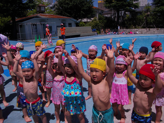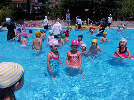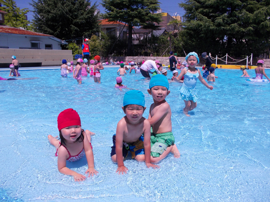 すみれ組さんは第1園のお友達と一緒にあずま公園の中のプールに行きました