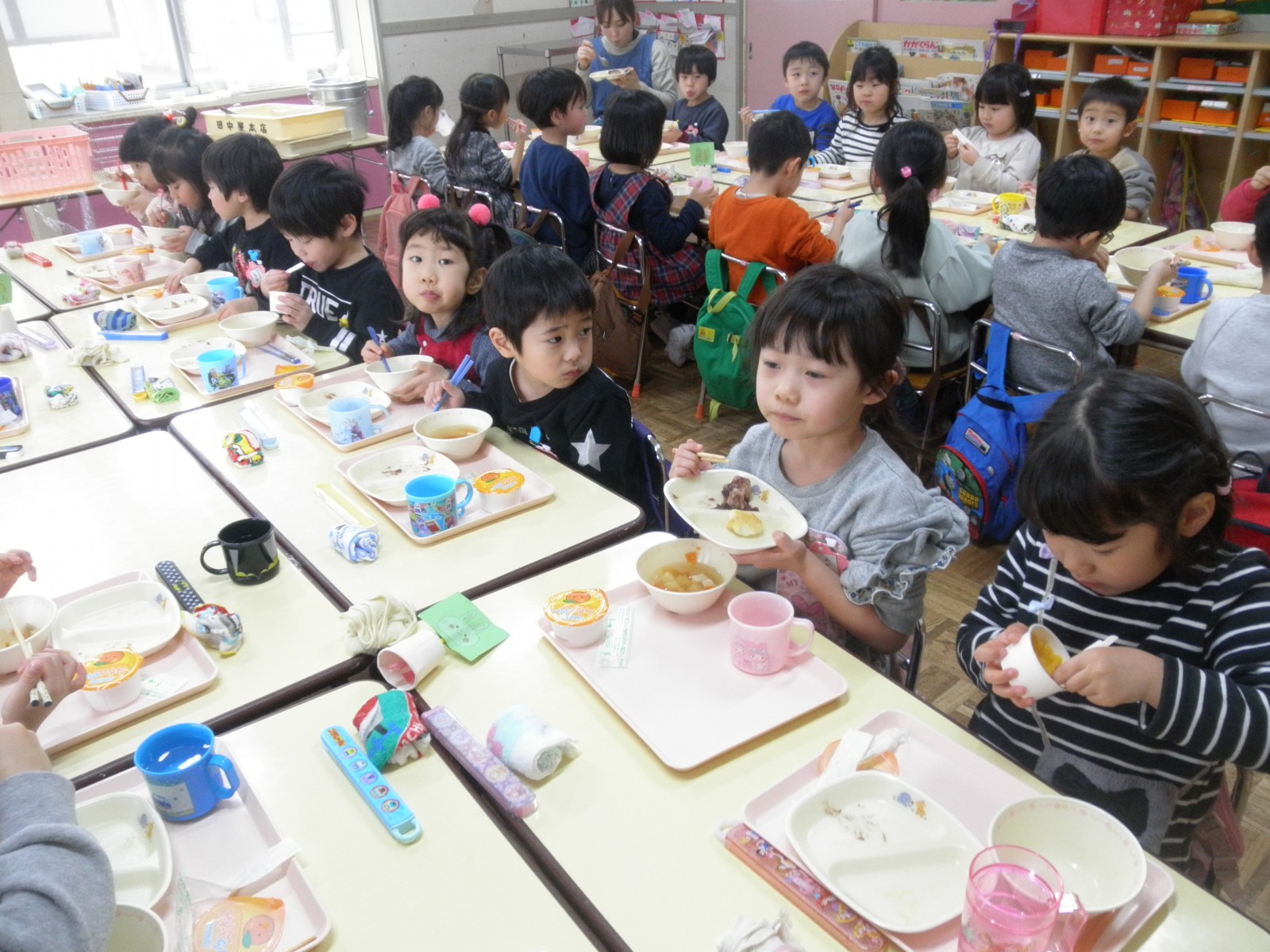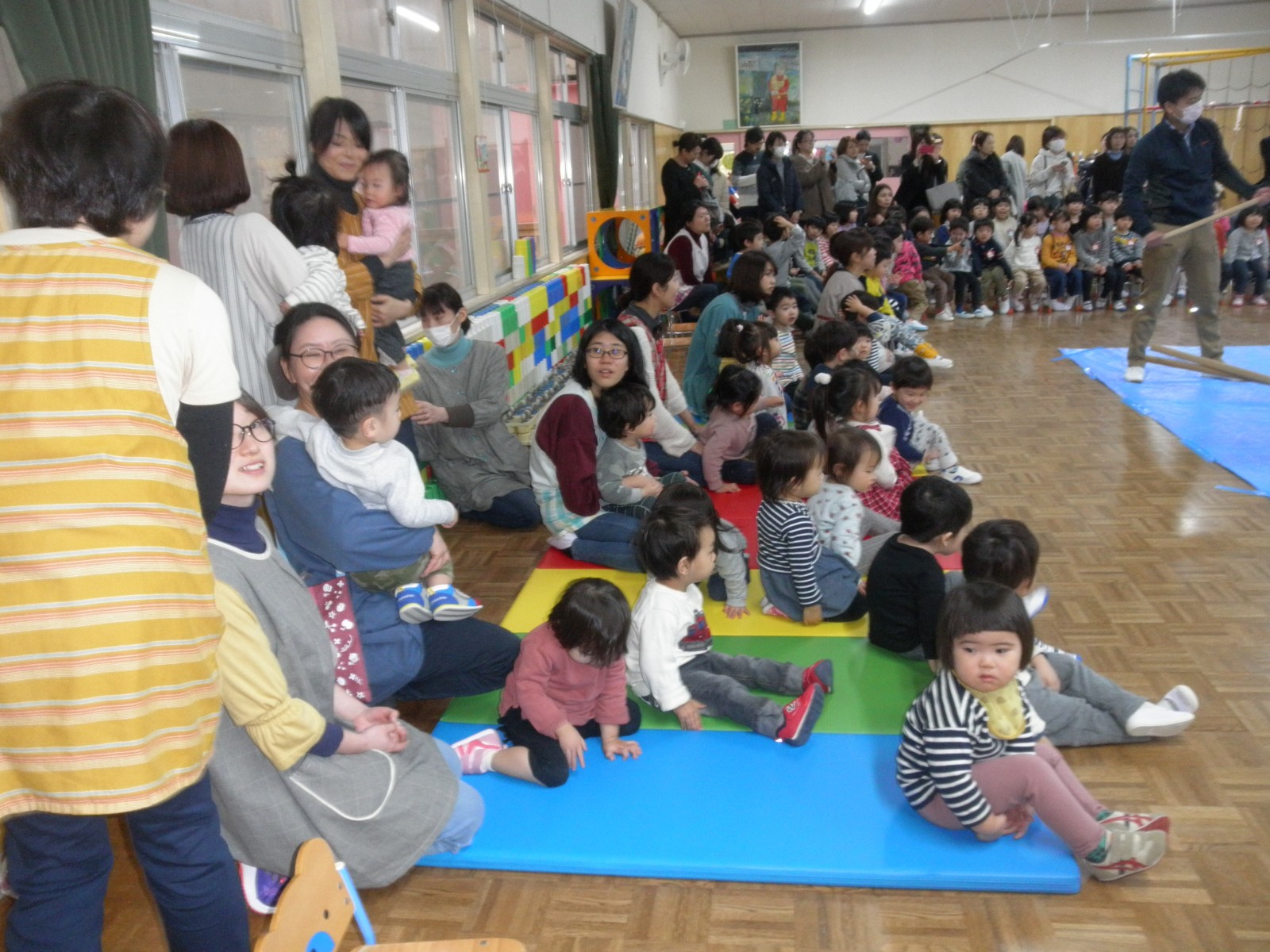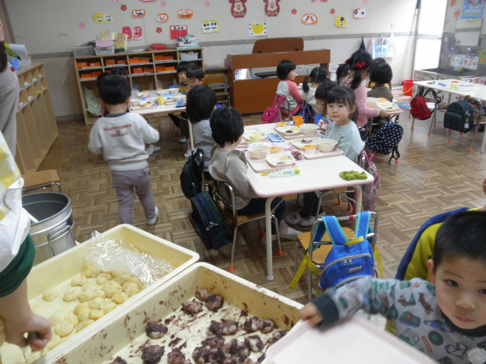 乳児部のお友達も見学して楽しいおもちつきの雰囲気をいっぱい味わっていきました。また、チューリップ教室のお友達も一緒に参加し、美味しいおもちを食べていいお顔で帰りました。みんな美味しかったね!