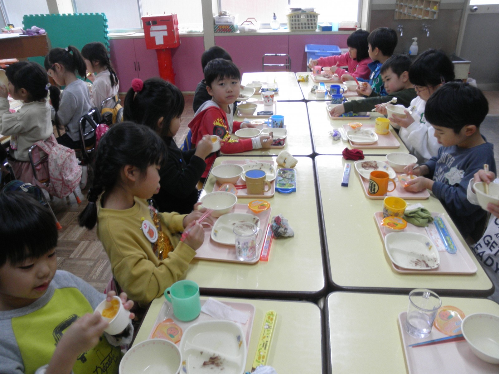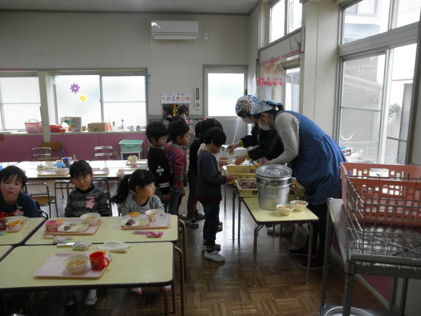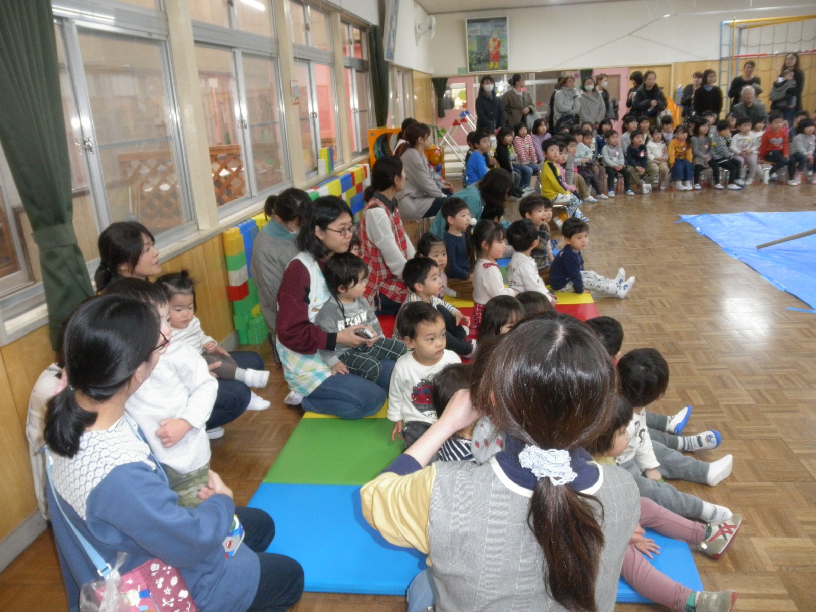 乳児部のお友達も見学して楽しいおもちつきの雰囲気をいっぱい味わっていきました。また、チューリップ教室のお友達も一緒に参加し、美味しいおもちを食べていいお顔で帰りました。みんな美味しかったね!