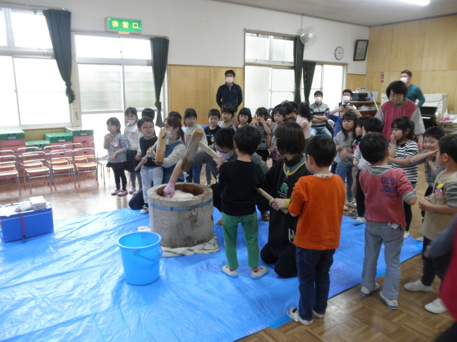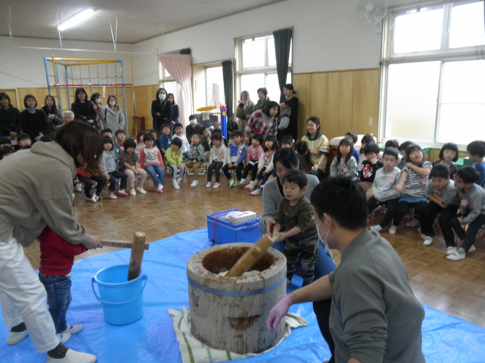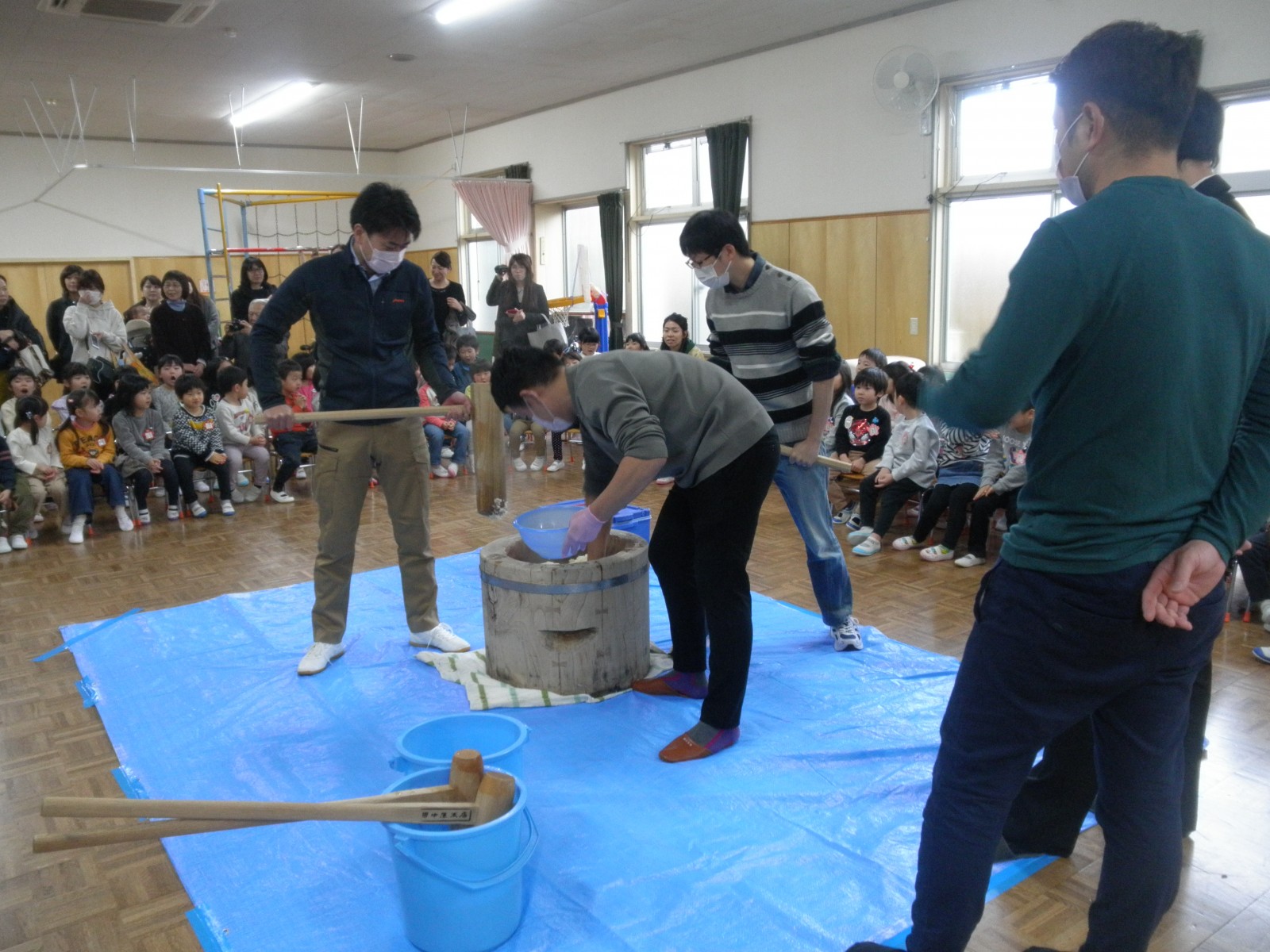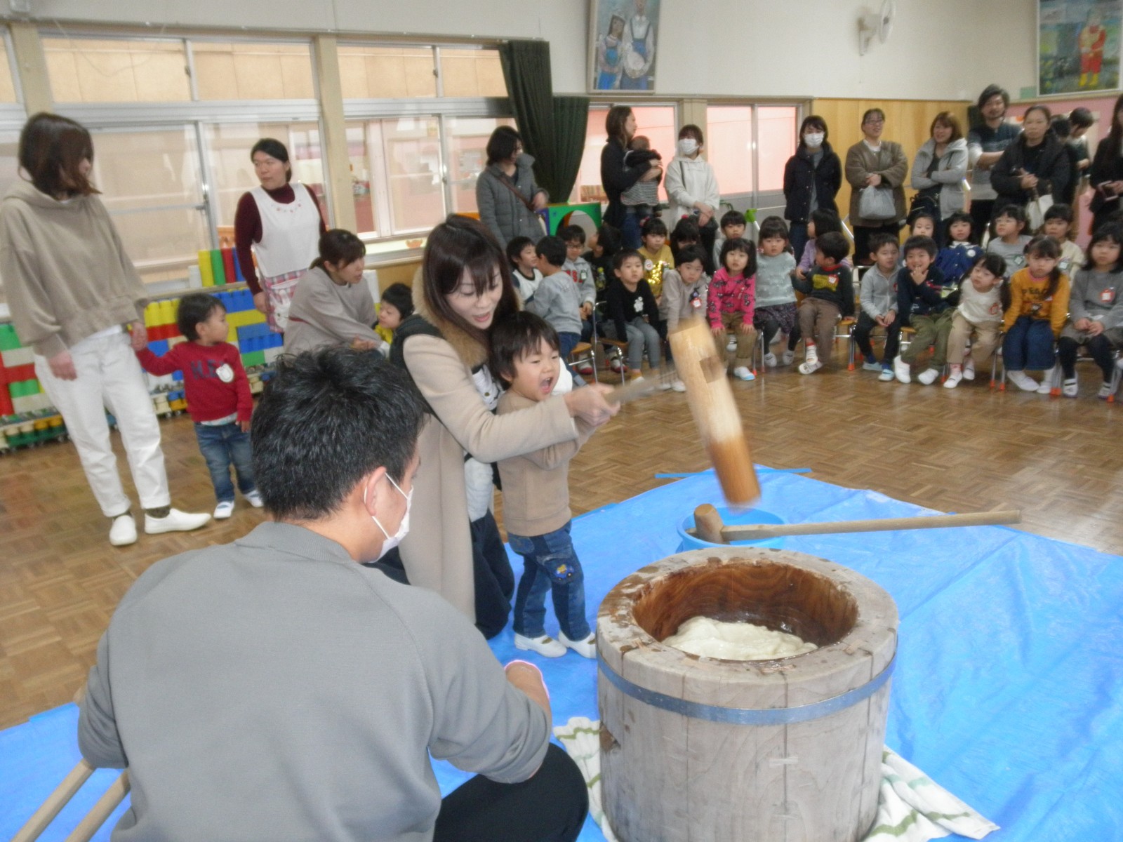 たくさんのお父さん方がお餅つきのお手伝いにきてくださり、めつぶしから始まり力いっぱいおもちを付いてくださり、ありがとうございました。