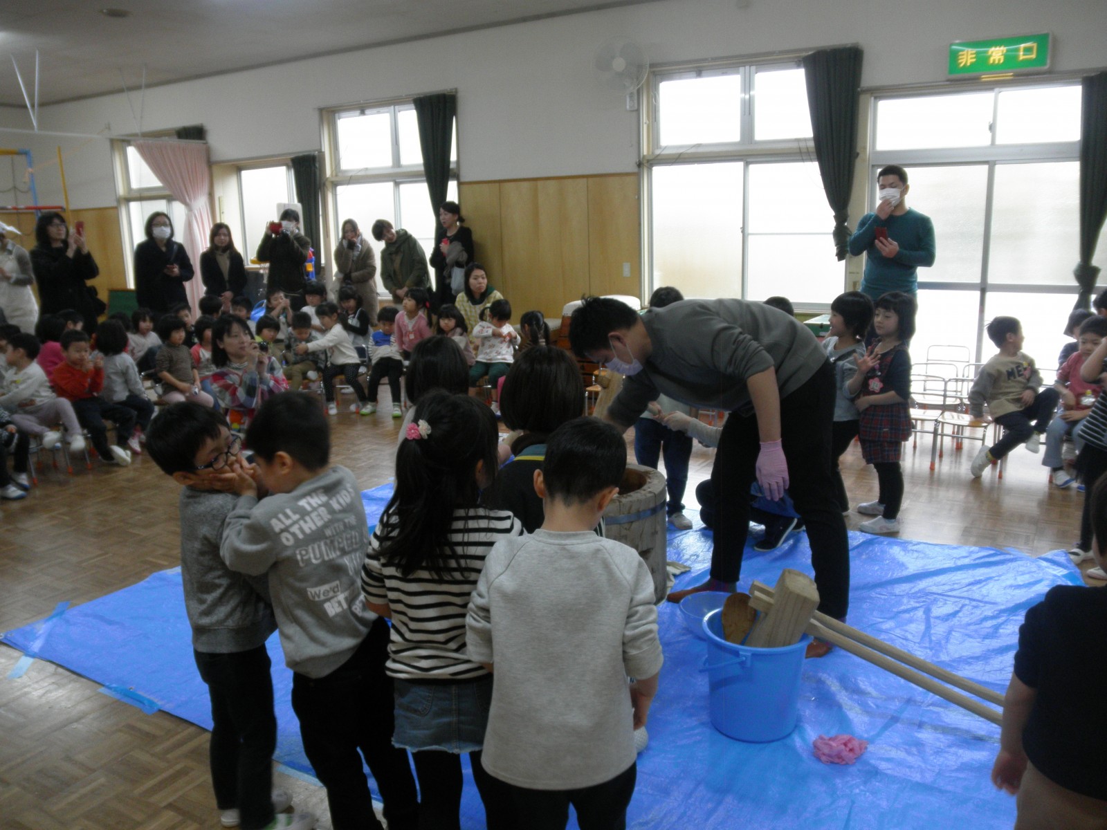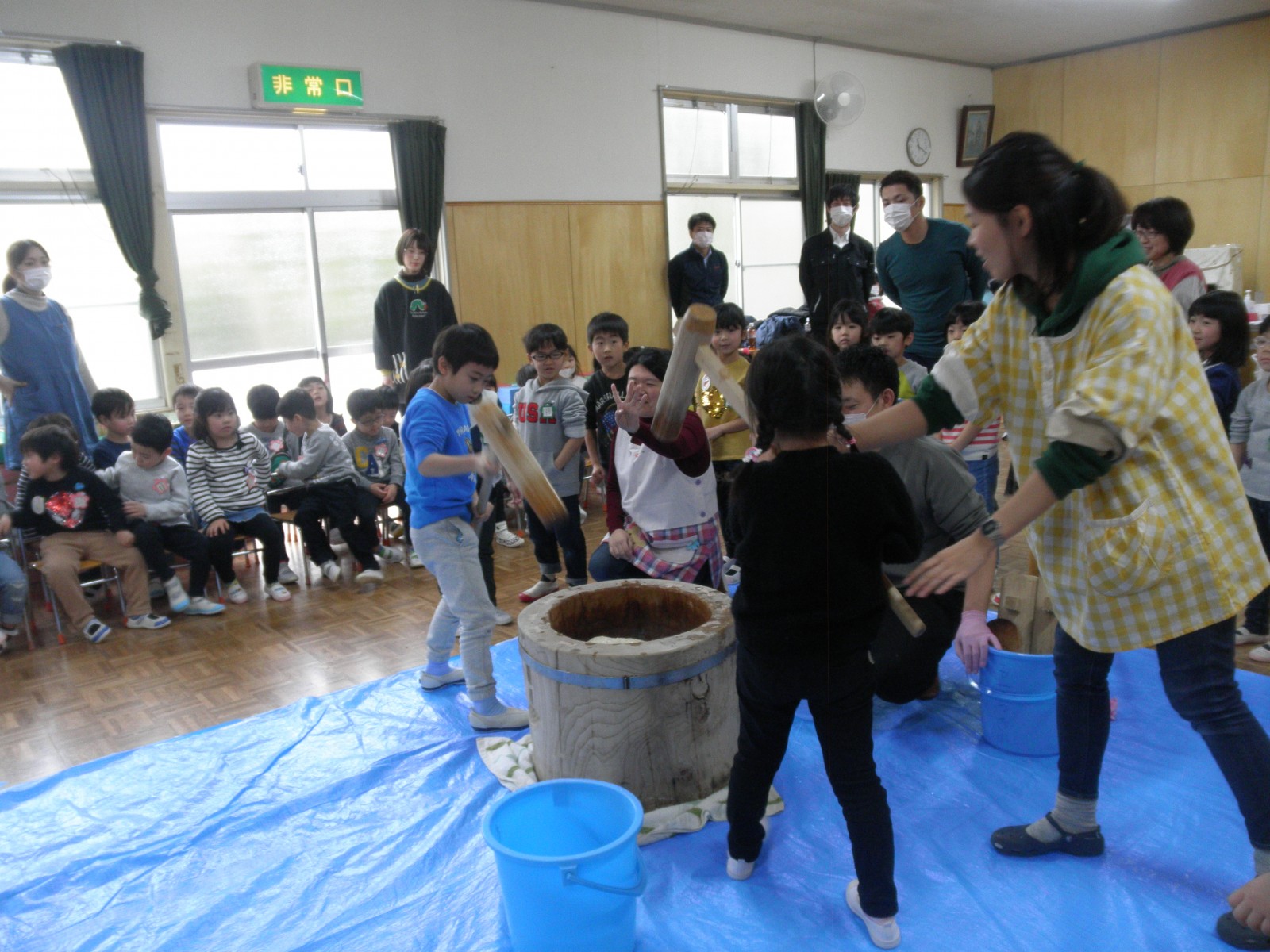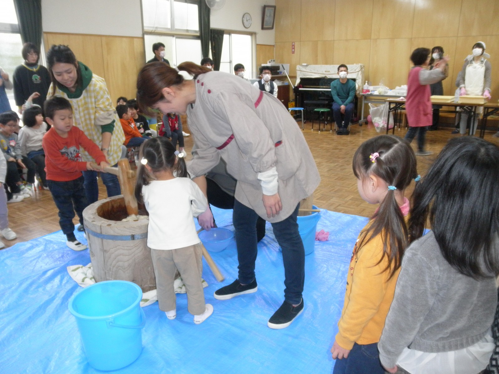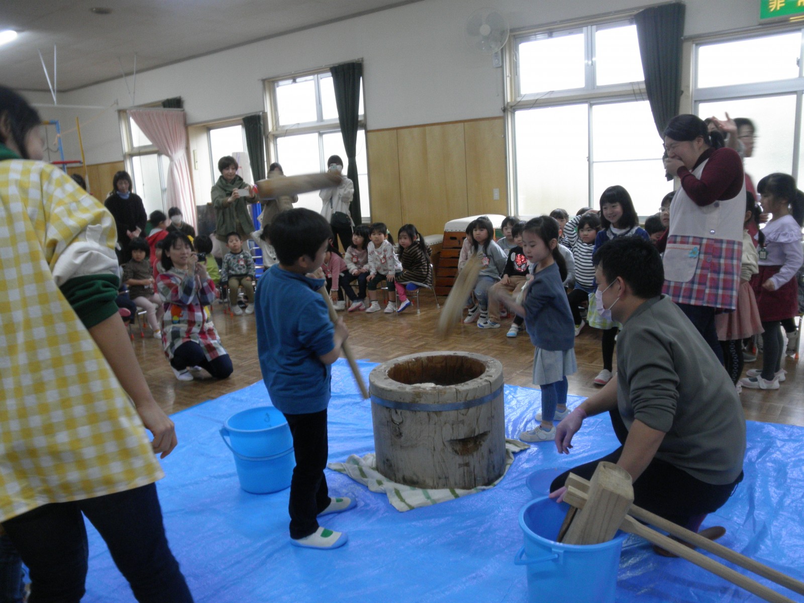 たくさんのお父さん方がお餅つきのお手伝いにきてくださり、めつぶしから始まり力いっぱいおもちを付いてくださり、ありがとうございました。
