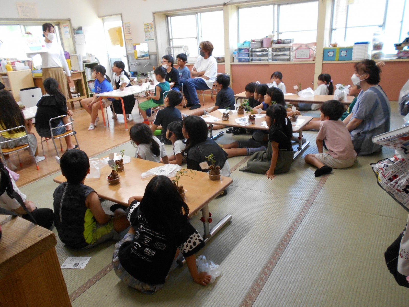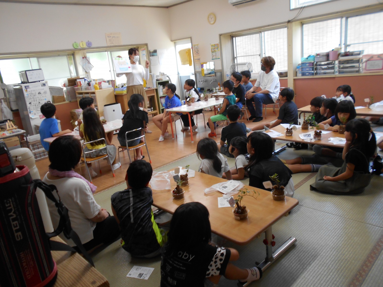 8月1日に講師の方から来ていただいこけけ玉を作りアイビーのお花をさしました。みんな真剣にきいています。どんな風にアイビーが育っていくでしょうか?