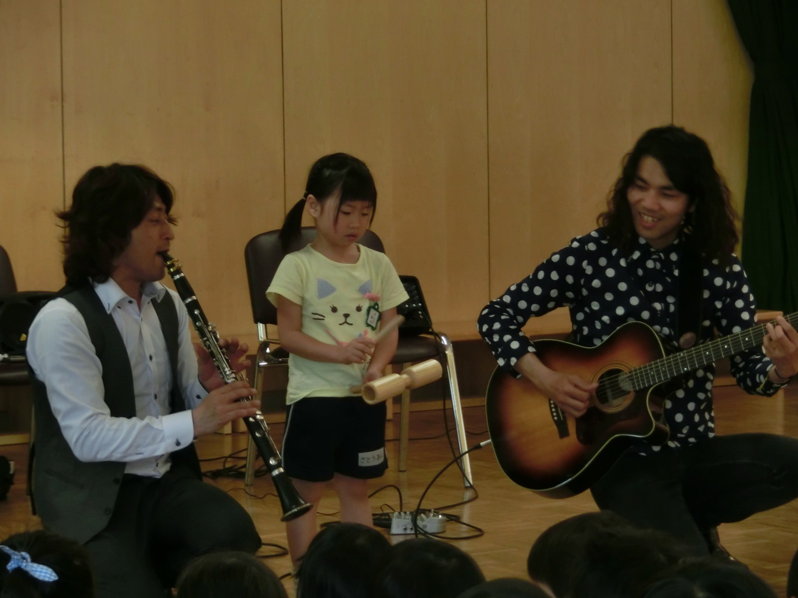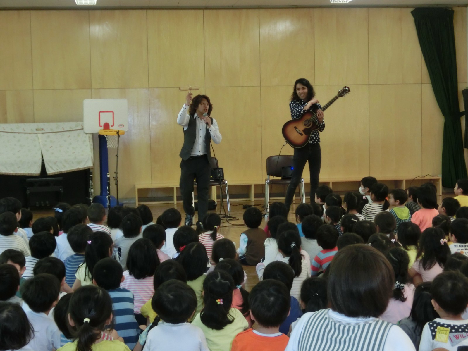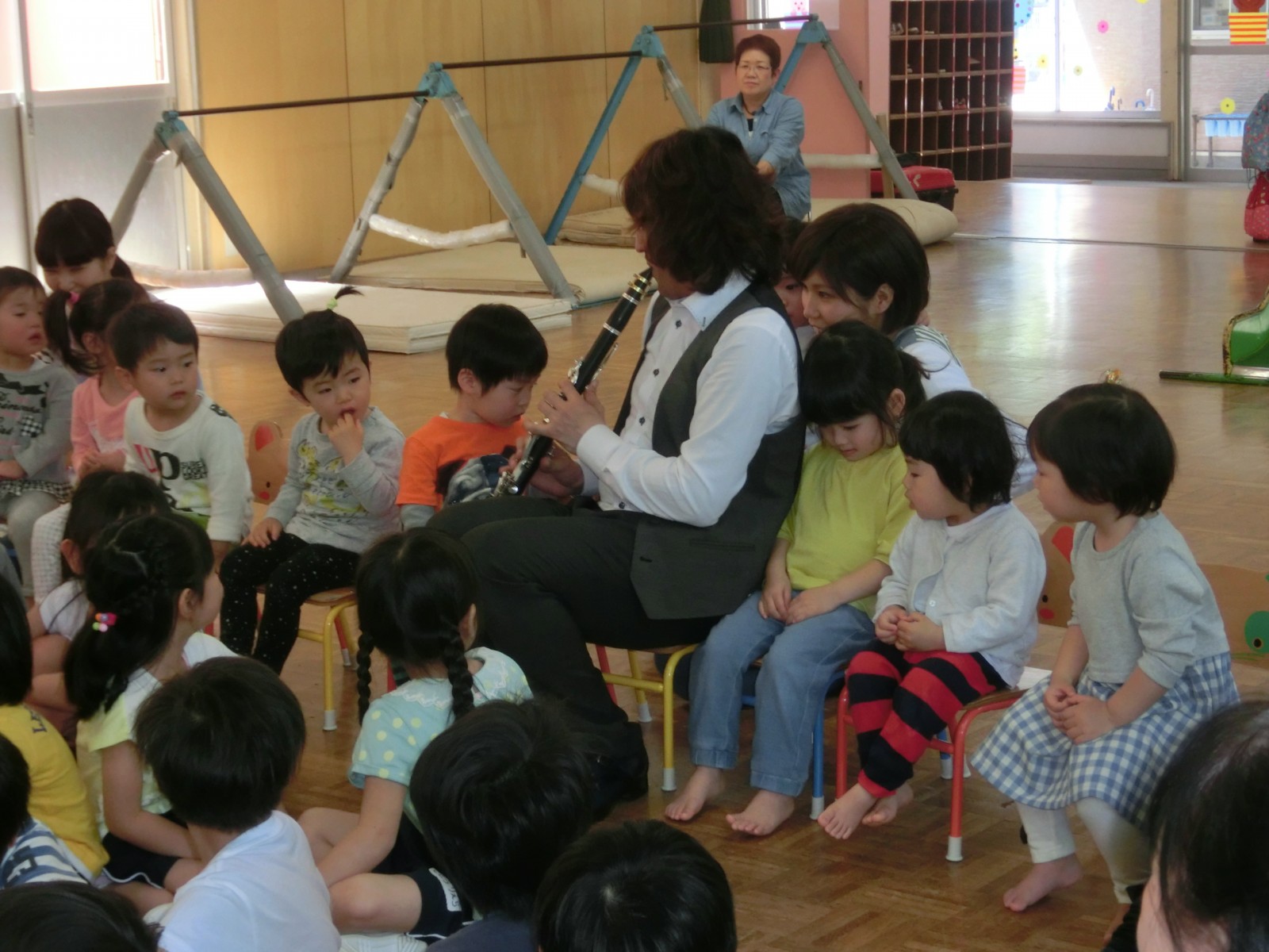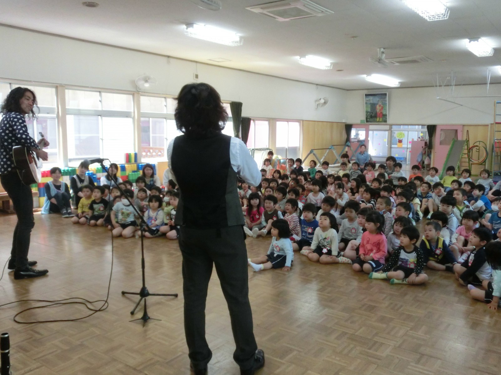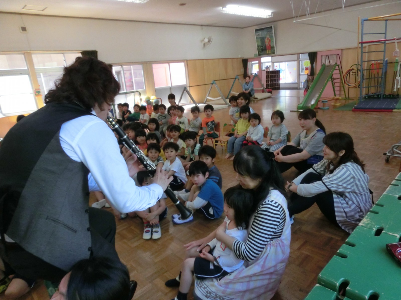 19日の金曜日、明日の音楽文化会館でのコンサートの事前ミニコンサートを第2幼稚園のホールでしてくださいました。今日はいろんな幼稚園にいく関係でクラリネットとギターによるデュオコンサートをしてくださいました。とっても楽しいコンサートで、乳児部のお友達もぴょんぴょんはねて踊りました。第1幼稚園のお友達も大好きな「アナの歌」やデイズニーのメドレー音楽に大はしゃぎでした。20日(土曜日)の午前10時からこの人達のフルメンバー クラリネット・バイオリン・ピアノ・ギターそして、ボーカルでの楽しいコンサートがあります。今日お渡しした、「エバリーコンサートのちらし」をおもちになったり、あらかじめメールでお申込みするとお安くなるそうです。とっても喜んでいたので、是非見に行ってみてくださいね、