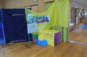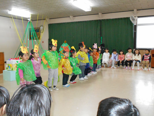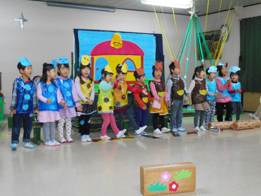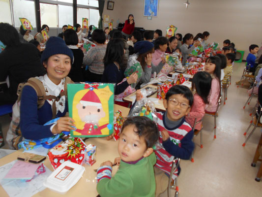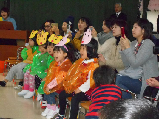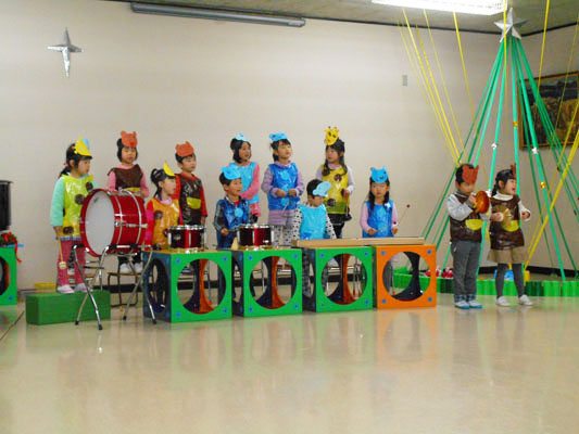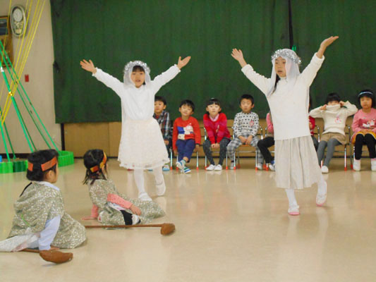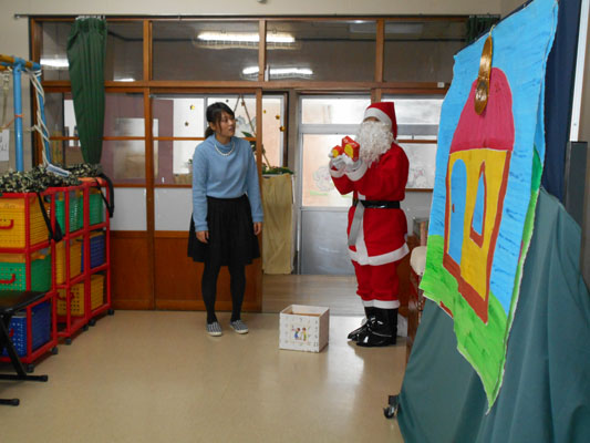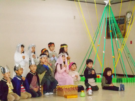 「イエス様のお誕生」の劇の大役をはたし、イエス様を拝みに行くところです。