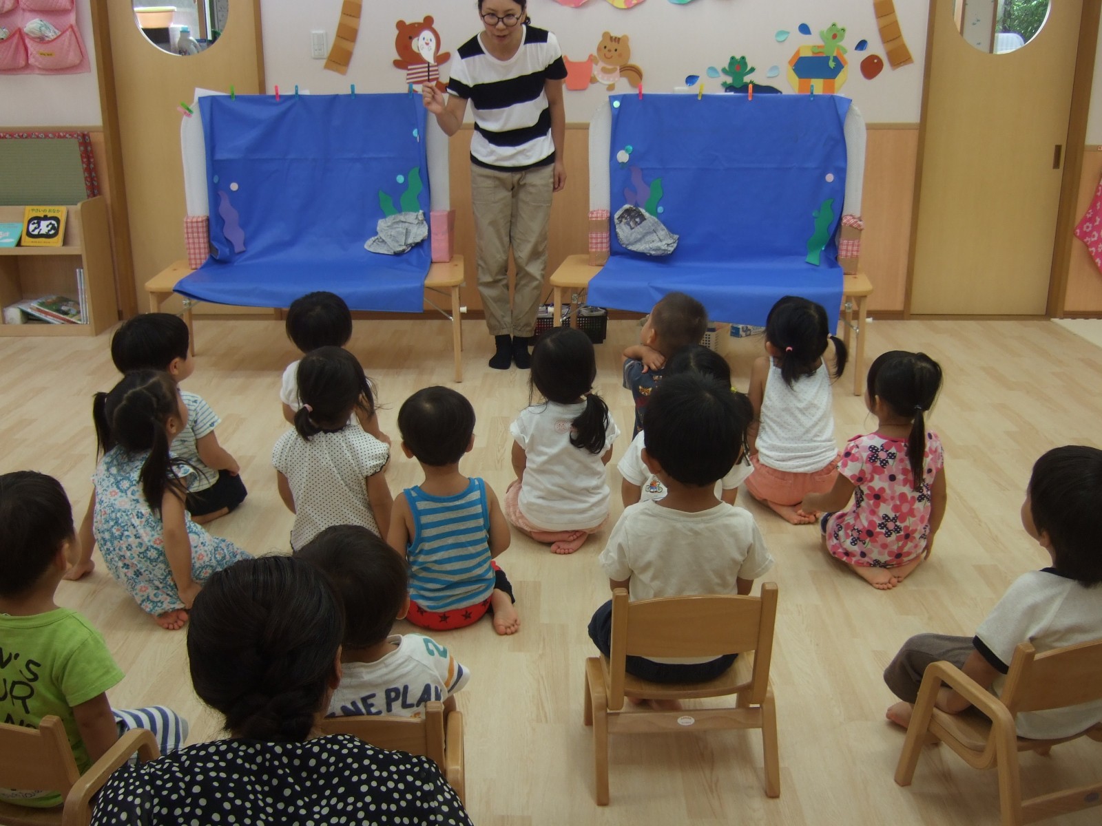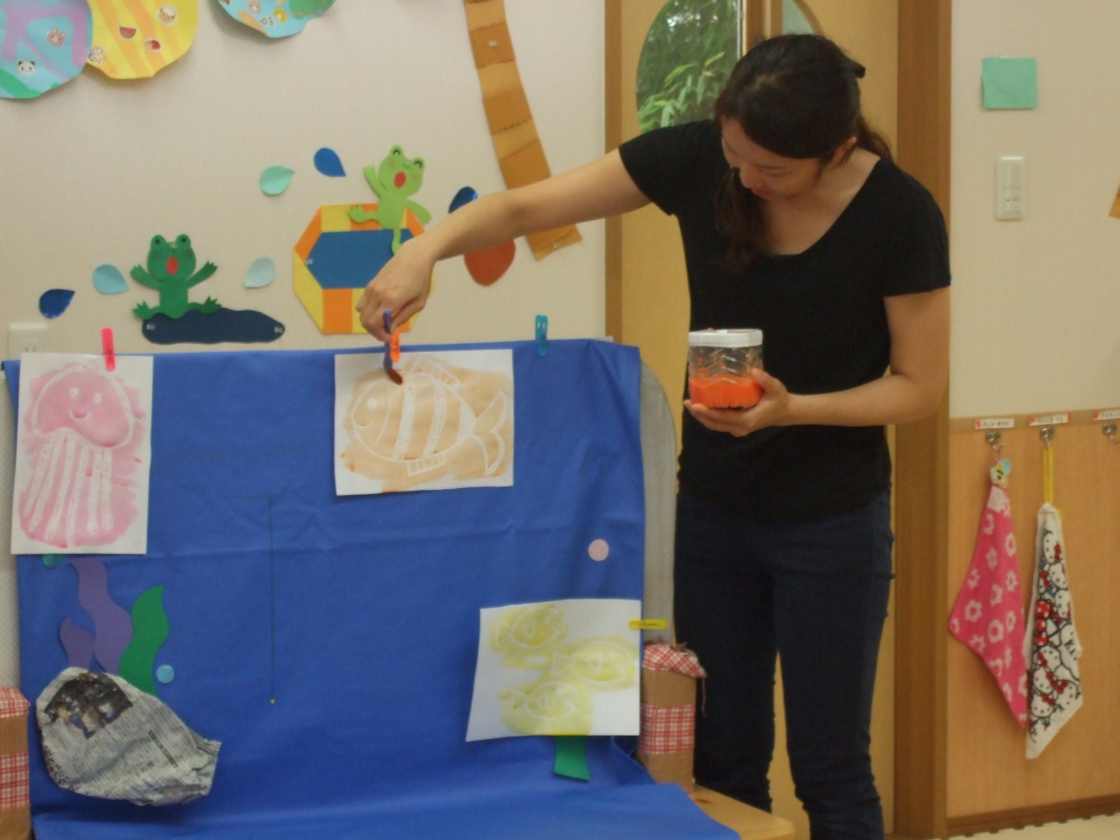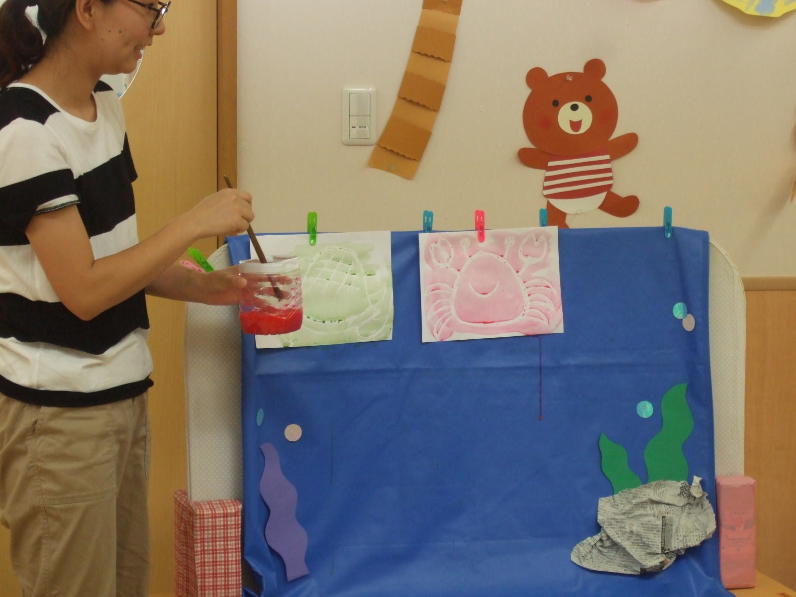 8月のお誕生会はマジックのように絵具をぬるとあら不思議!おさかなさんたちがあらわれました。みんな暑い夏、がんばりましたね!