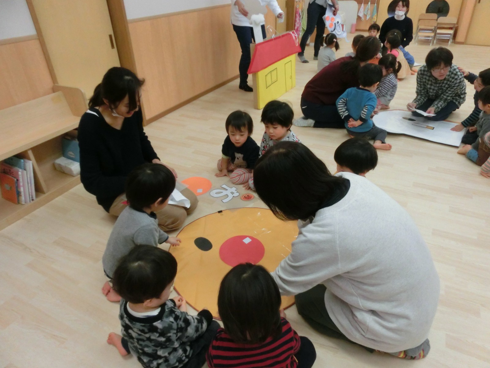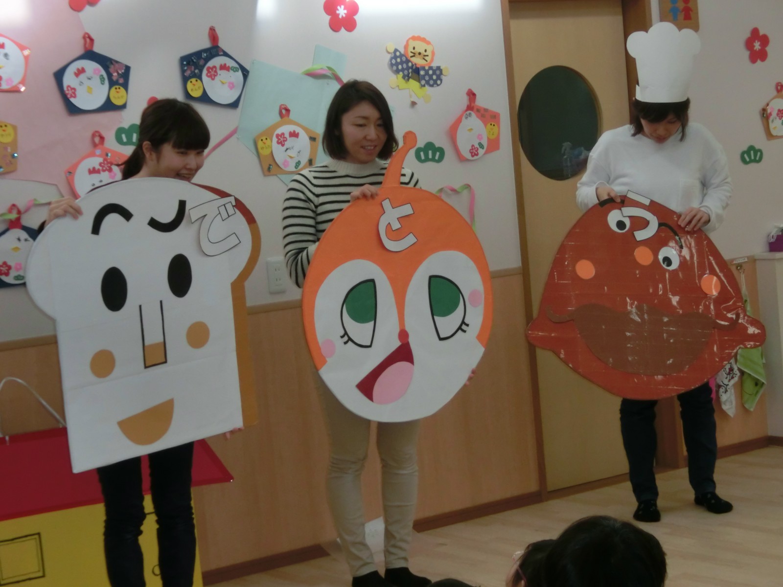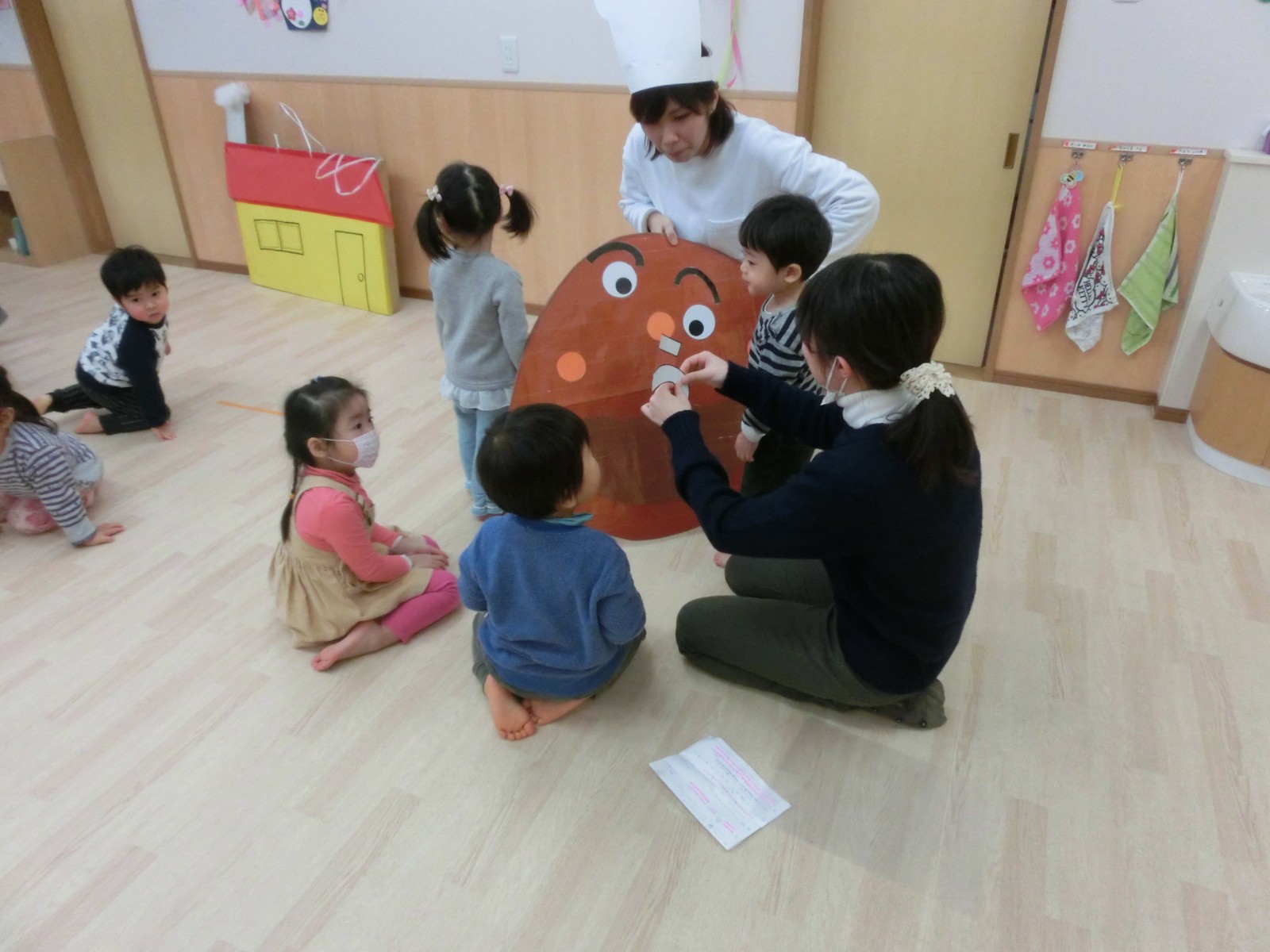 アンパンマンや食パンマンなどの顔で福笑い遊びをしました。