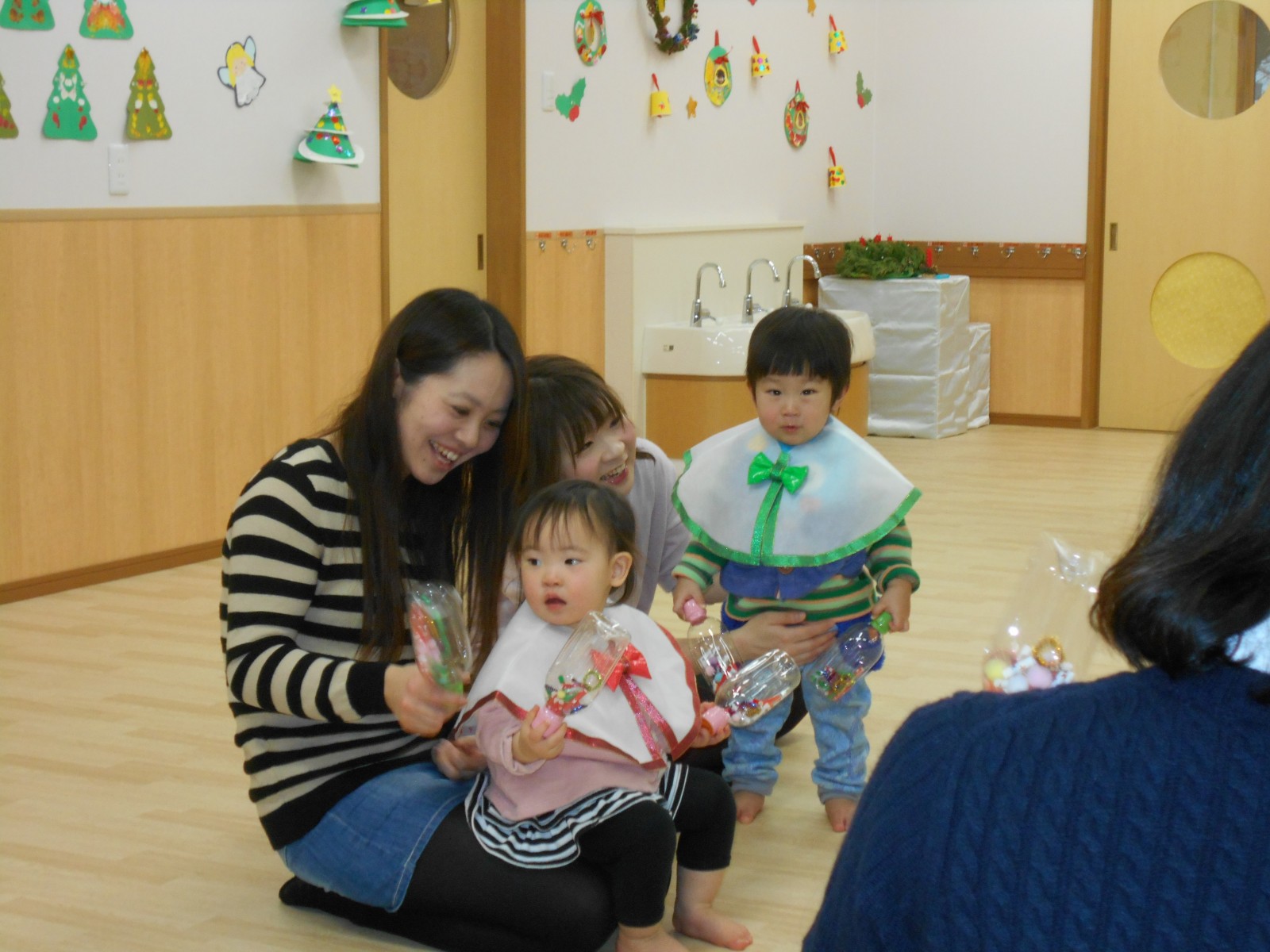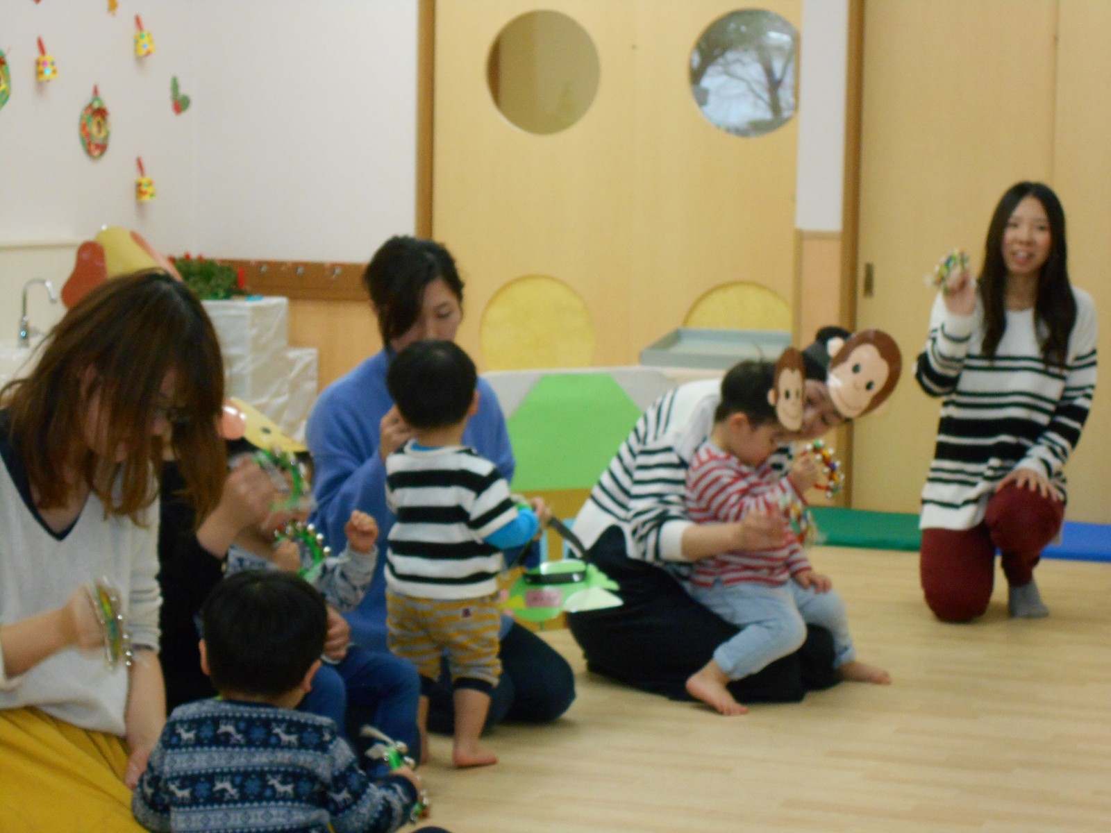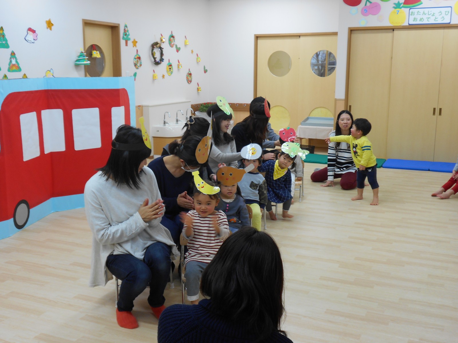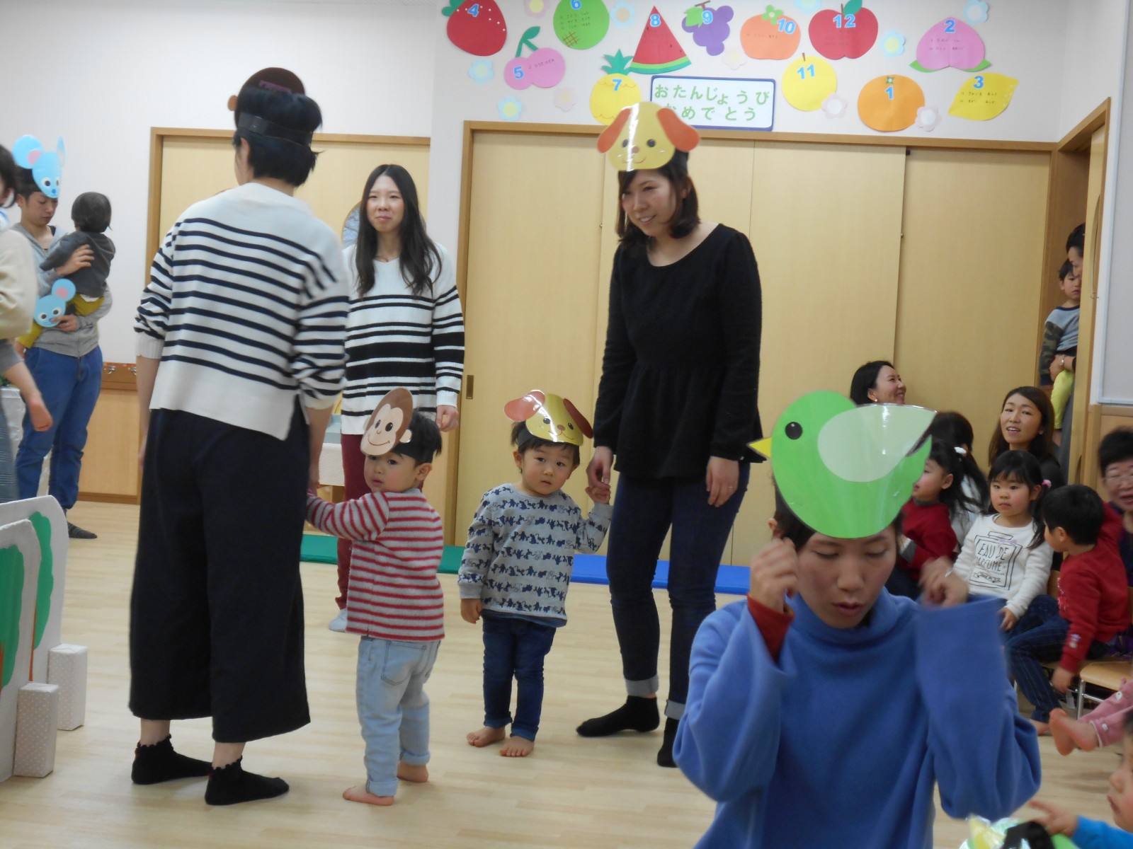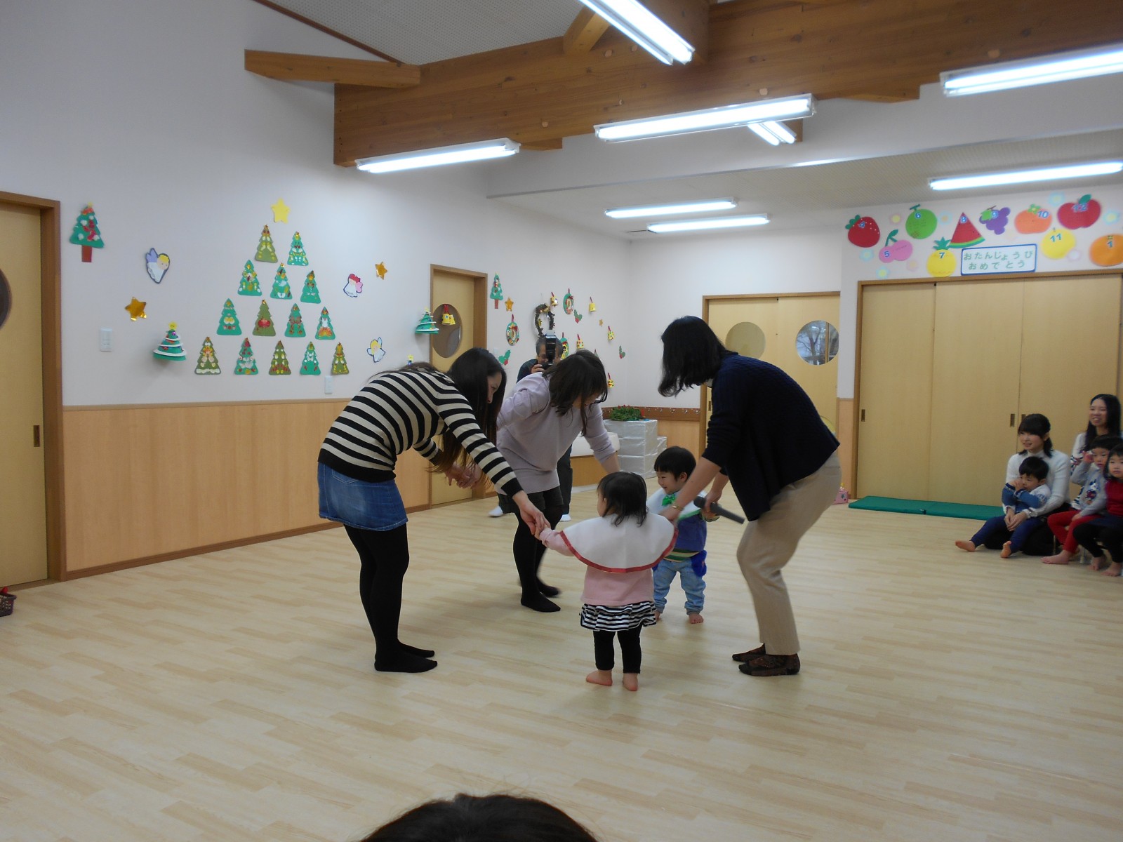 今年もお母さんと一緒にお祝いの歌遊びをしました。たくさんの人がいるので、びっくりして、泣いてしまったおともだちもいましたが、来年は泣かずにたのしめると良いね。