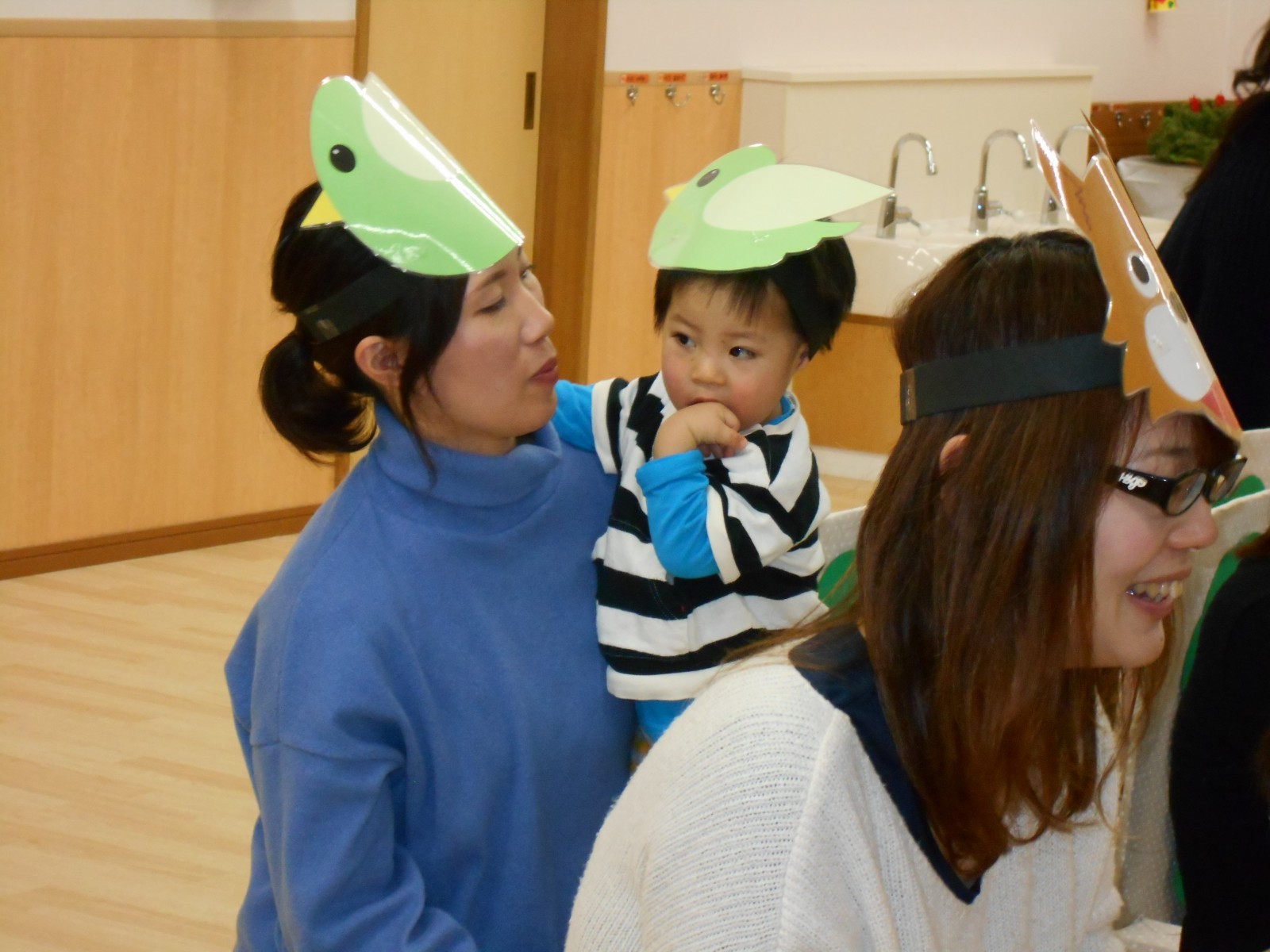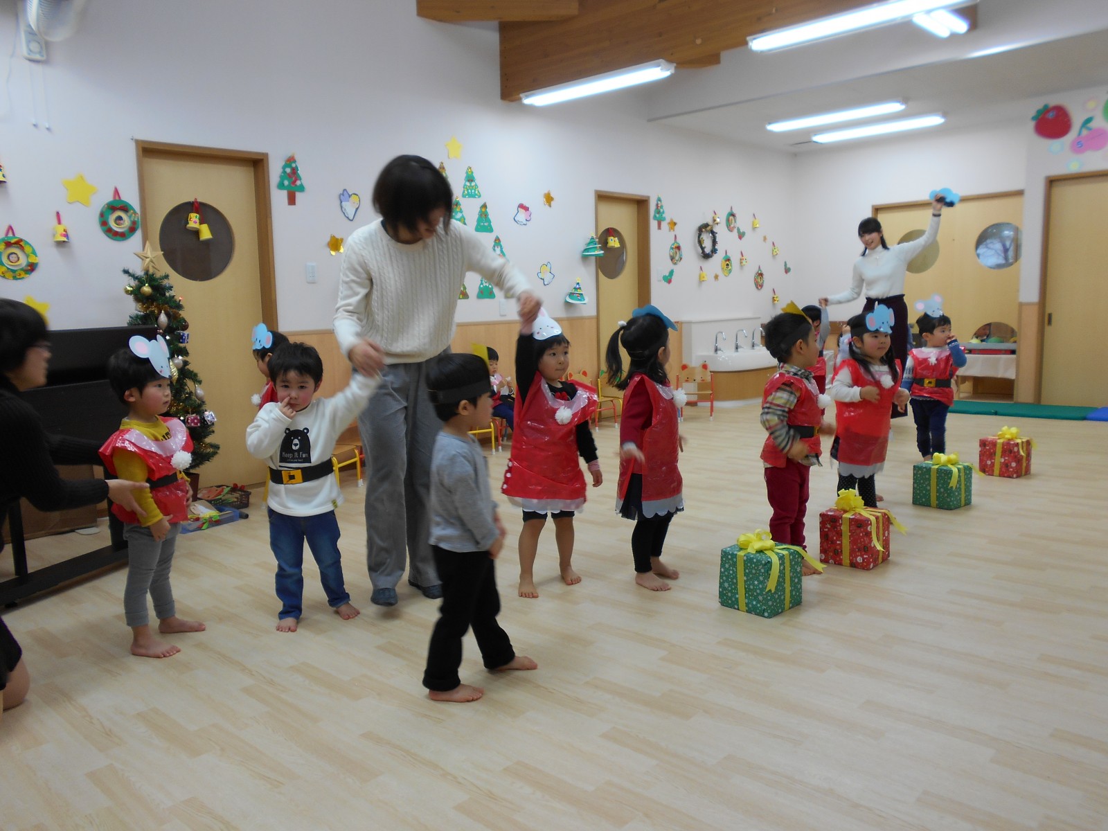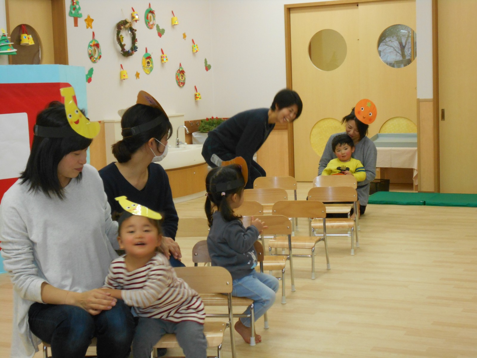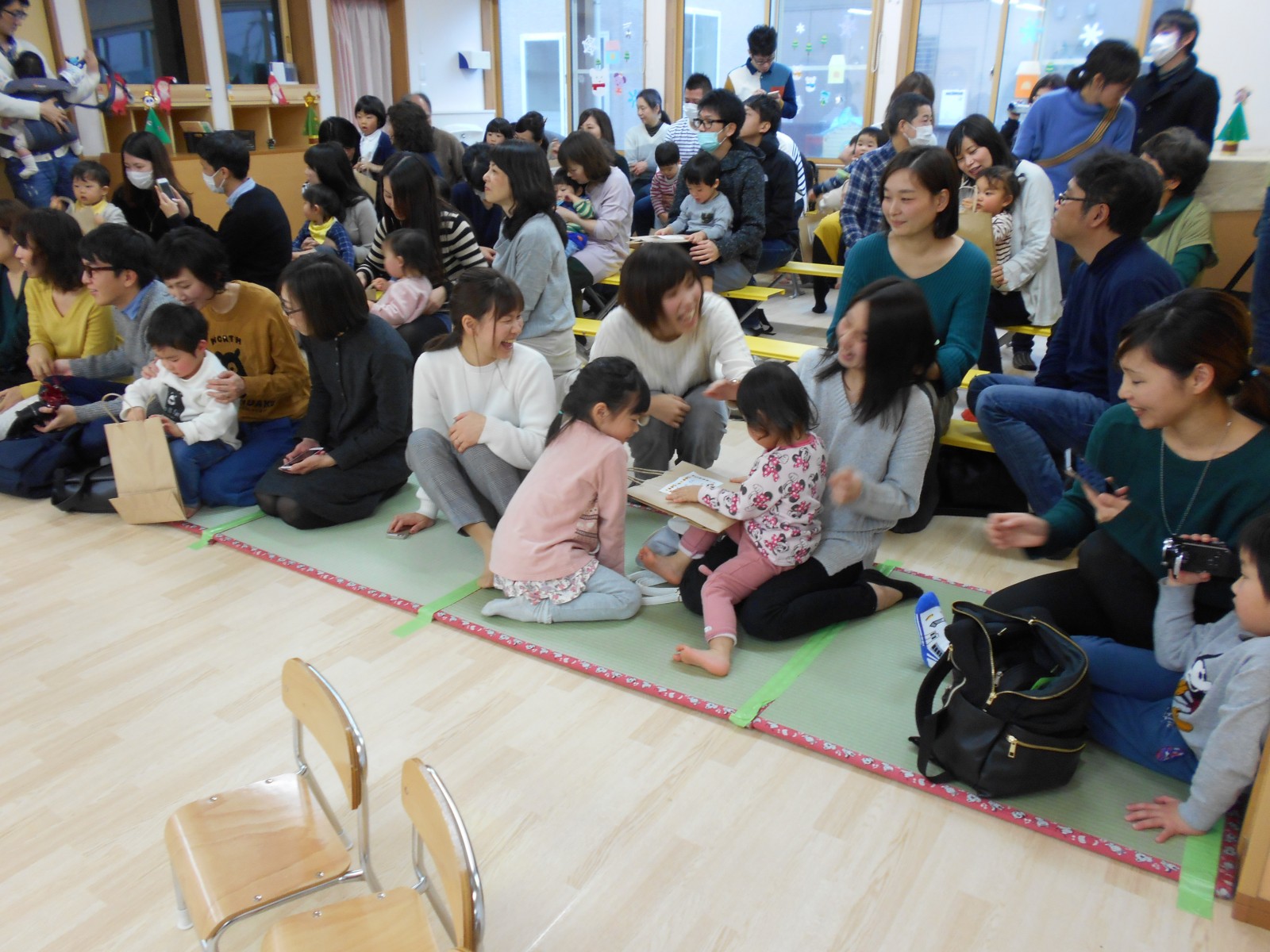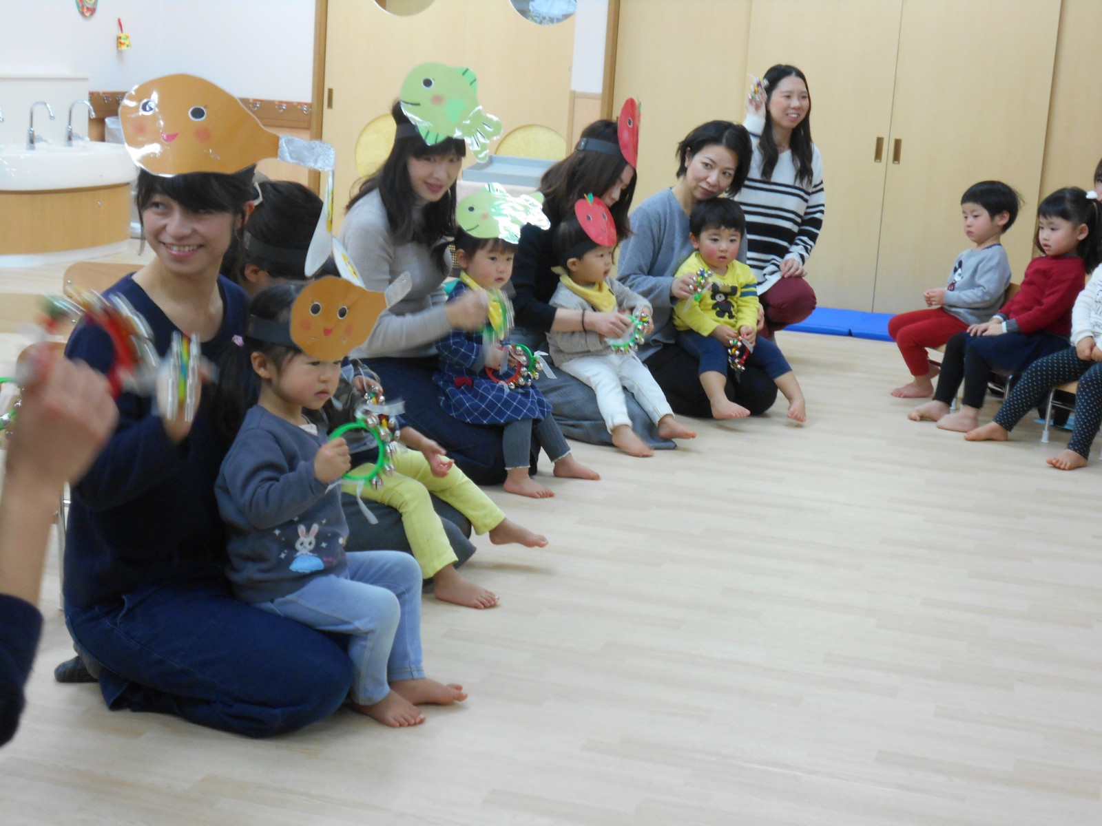 今年もお母さんと一緒にお祝いの歌遊びをしました。たくさんの人がいるので、びっくりして、泣いてしまったおともだちもいましたが、来年は泣かずにたのしめると良いね。
