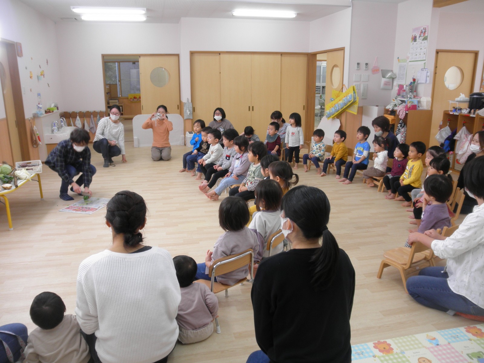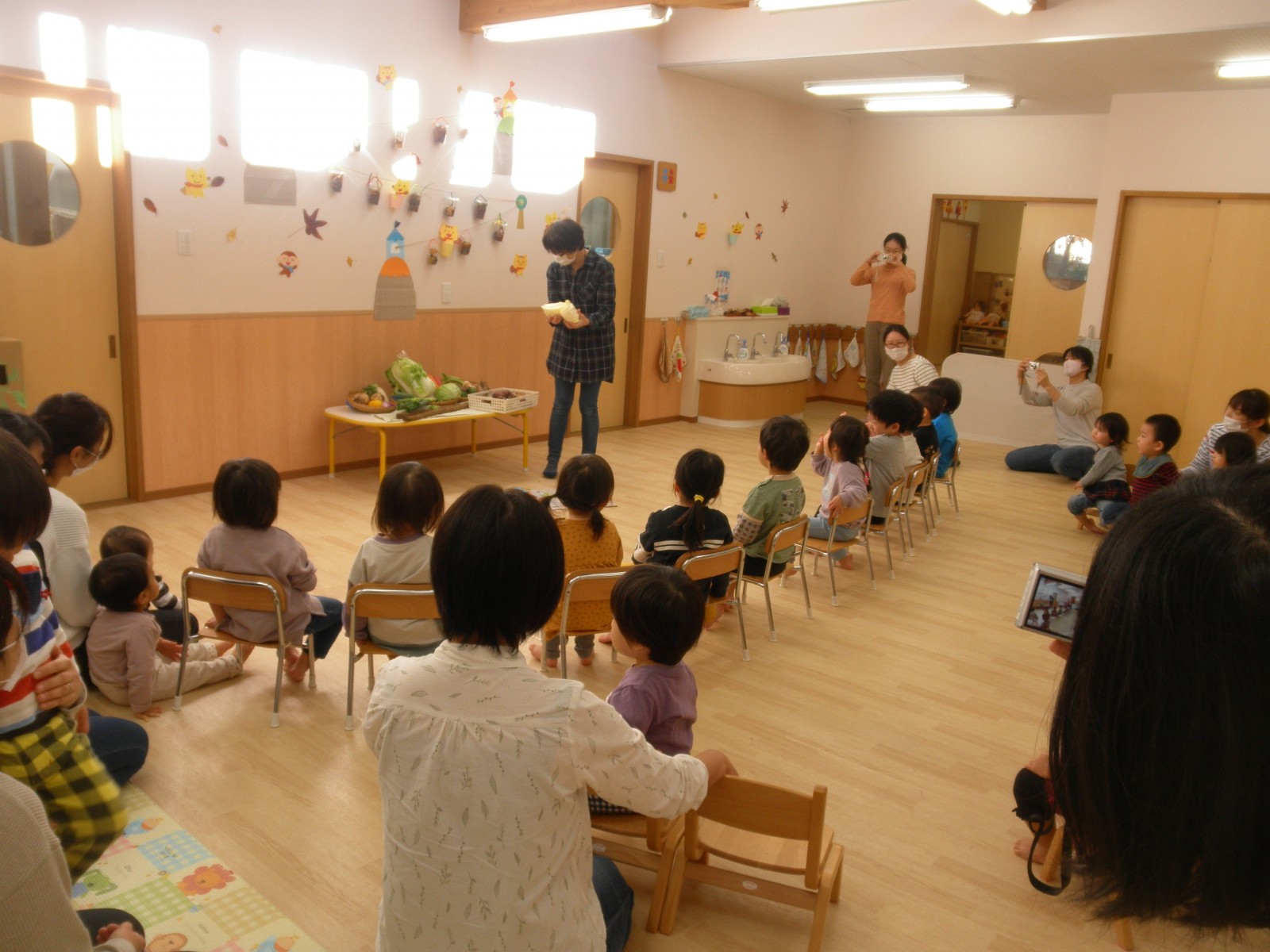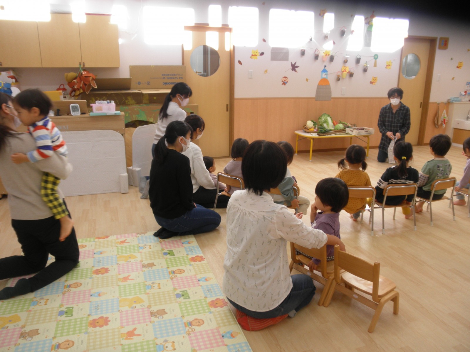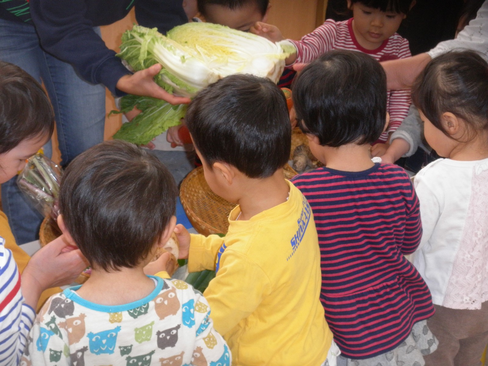 お野菜を持ち寄って玄関に飾りその後みんなでのそお野菜を前に感謝礼拝をお捧げしました。その後、子ども達はどろのついたながーいごぼうや大きな白菜を二つにわったものやネギやさつまいもなどを手に取ってじっくり観察しました。