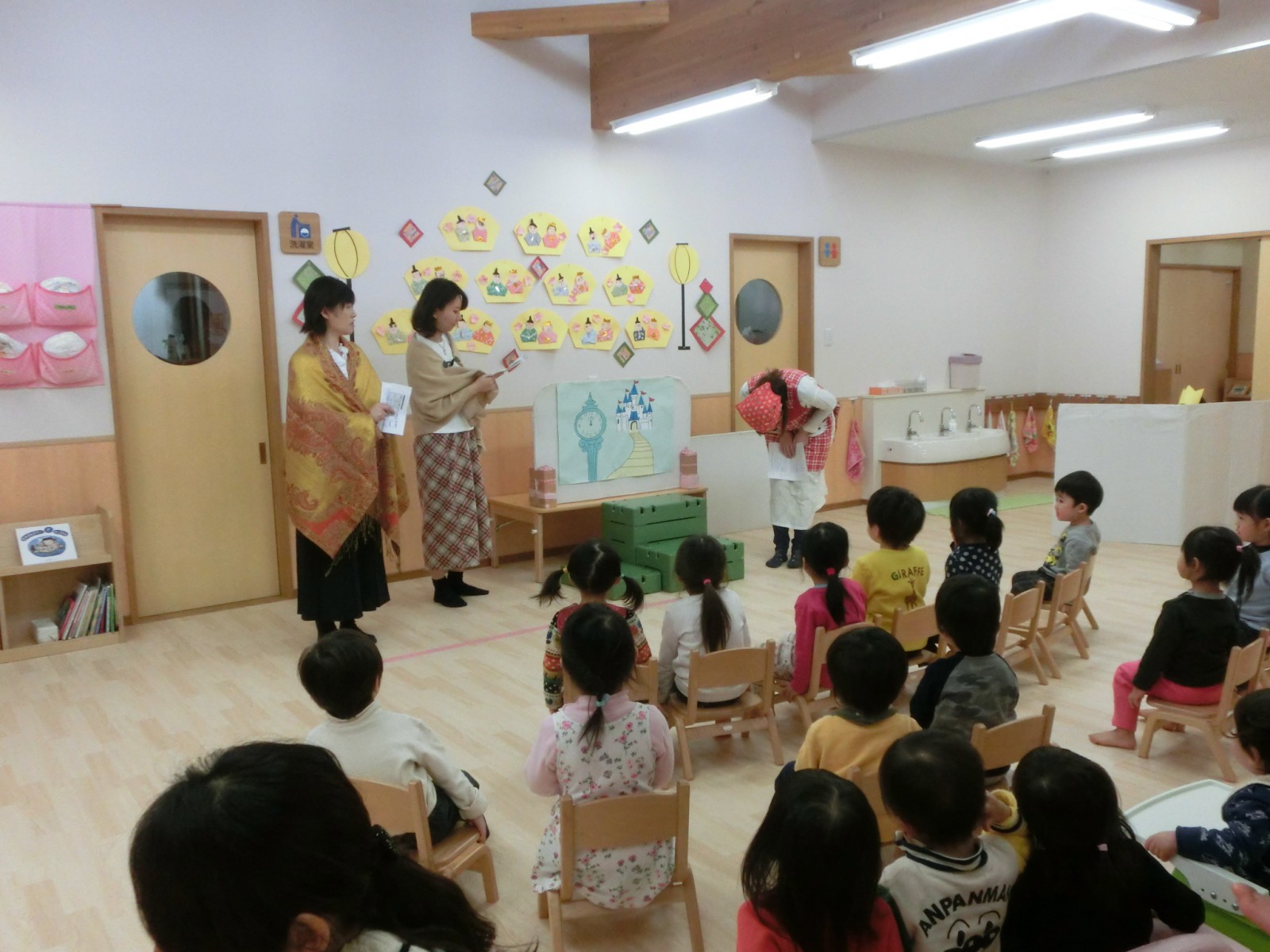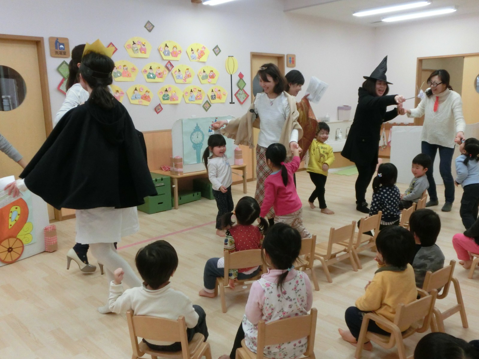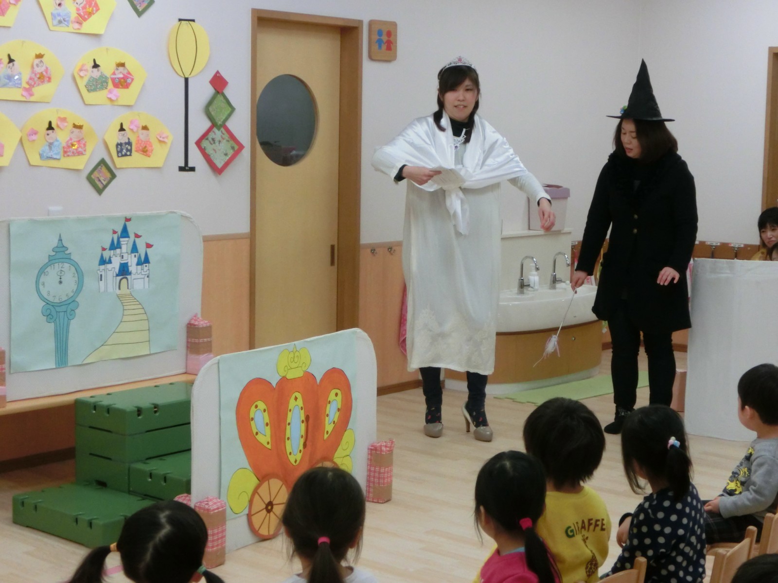 先生方のプレゼントは「シンデレラ」の劇でした。みんなが作ったお雛様が飾られているところでのお祝い会で季節感あふれた誕生日となりました。