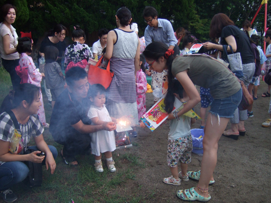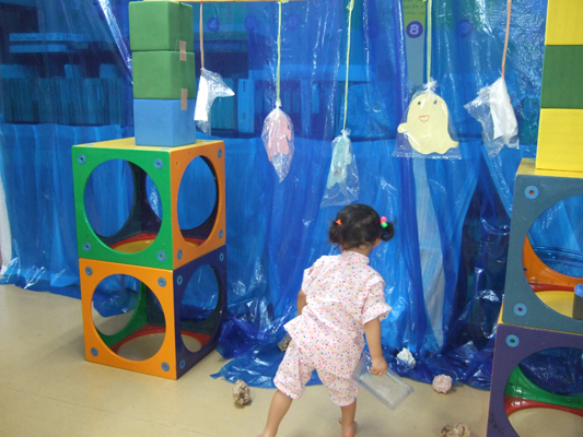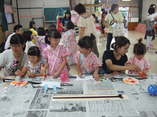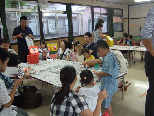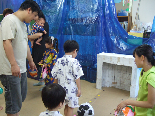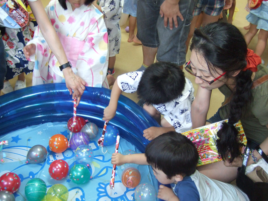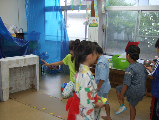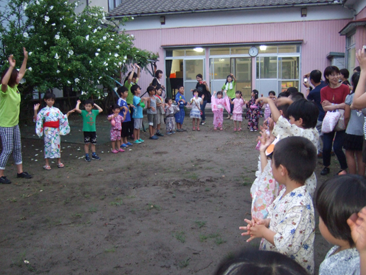 今年は大雨の降った後・・迷った末、園舎で行いました。最後は水たまりを砂でうめて、まんまる音頭をみんなで踊りました。