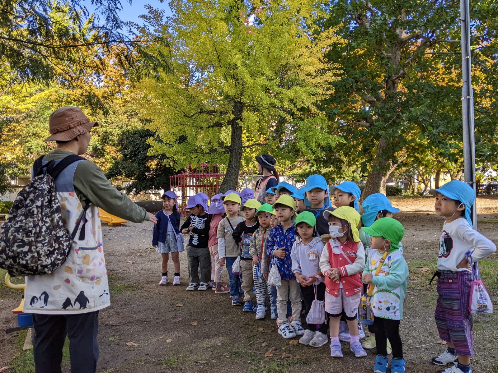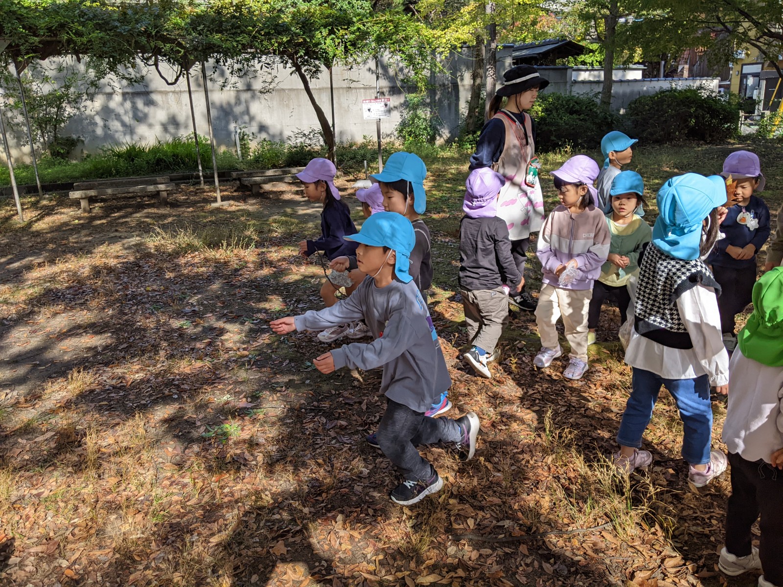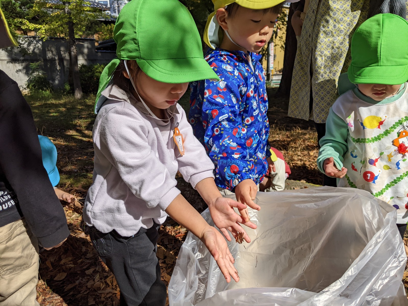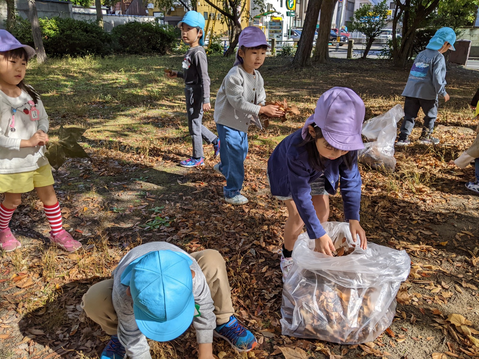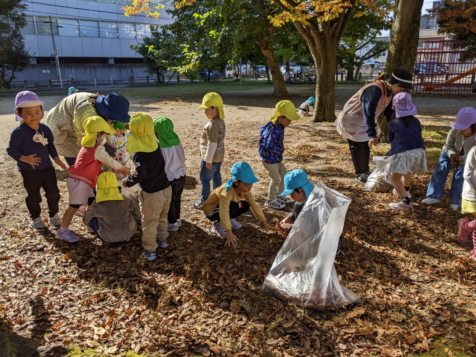 公園について、さっそく落ち葉集めのスタート!と思いきや、落ち葉よりどんぐりに夢中な子どもたち・・・今年はいつもより暖かい秋だからか、例年より落ち葉が少なく木々の葉も緑ぽいものが多かったです。
