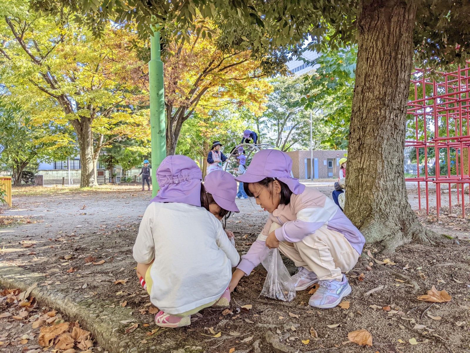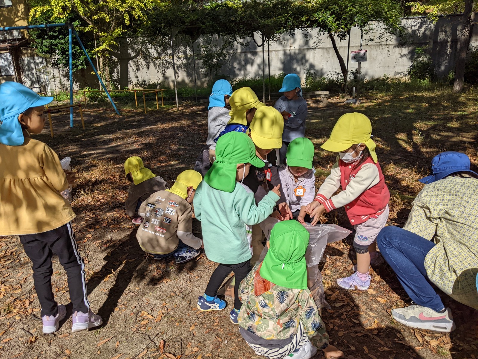 落ち葉集めの後は公園の遊具で遊んだり、どんぐり探しに夢中になったり楽しい時間を過ごしました。