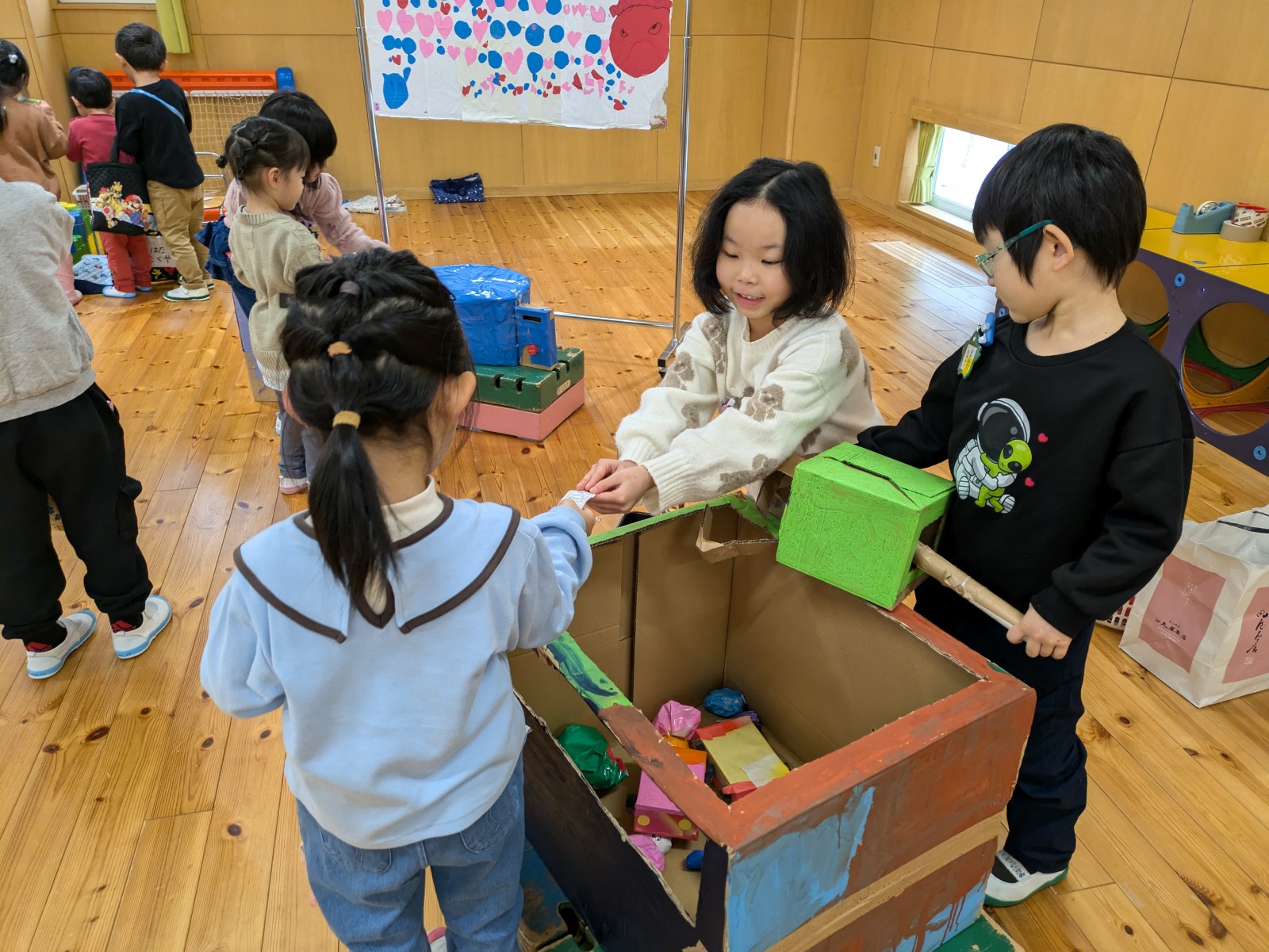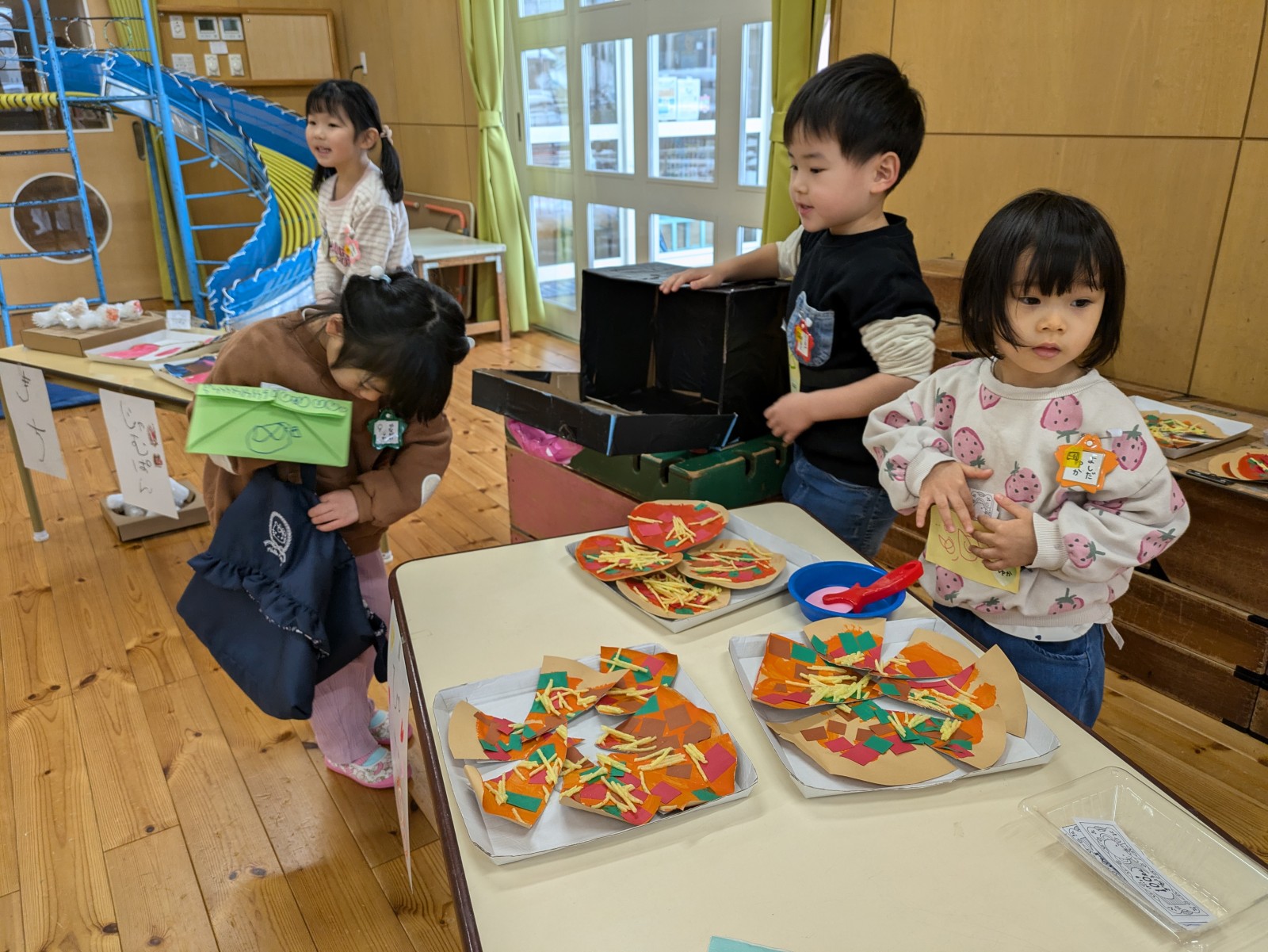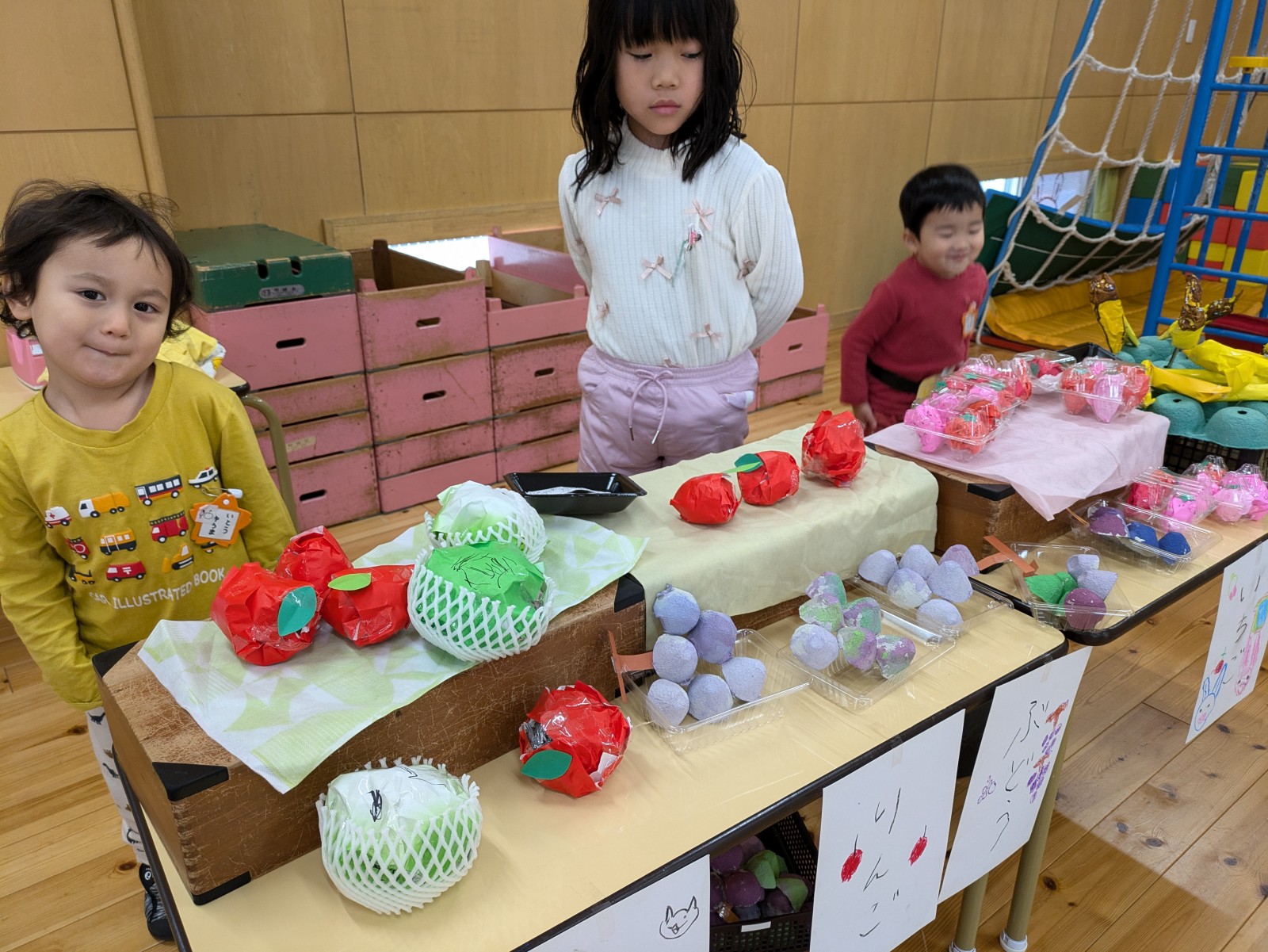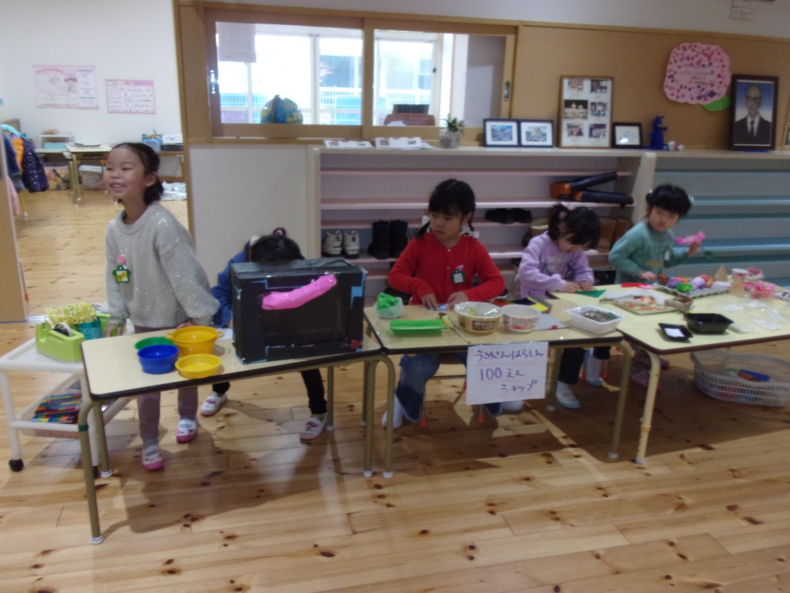 今年度は異年齢児との関わりや全クラスで活動を進めていくことが多かったのでおみせやさんごっこも自然と全クラスで取り組んでいました。郵便ごっこでのハガキを買いに行く経験やお買い物の紙芝居からの買い物ごっこ。「もっとお買い物したいよね」「品物もっと作ろうよ」と、どんな素材で何を作ろうか学年関係なくみんなで意見を出し合い、活動を進めていきました。話し合いも制作も関わる子が日々変わり、毎回自分のやりたいことに取りくみ、楽しんでいました。当日は買い物をたくさんする子、ゲームを繰り返し楽しむ子、買い物よりおみせやさんが楽しい子、とさまざまでした。給食もホールでみんなで食べ、特別感満載だったようです。マリオカートのコースをそのまま残し給食を食べることを話すと「マリオカート見ながら給食なんて最高だね!」なんて声もありました。マリオカートもまだまだ遊んでいますが、うめ組(5歳児)の“うめさんはらしん100えんショップ”もオープンし、チラシを作って配ったりと遊びがまだまだ継続しています。