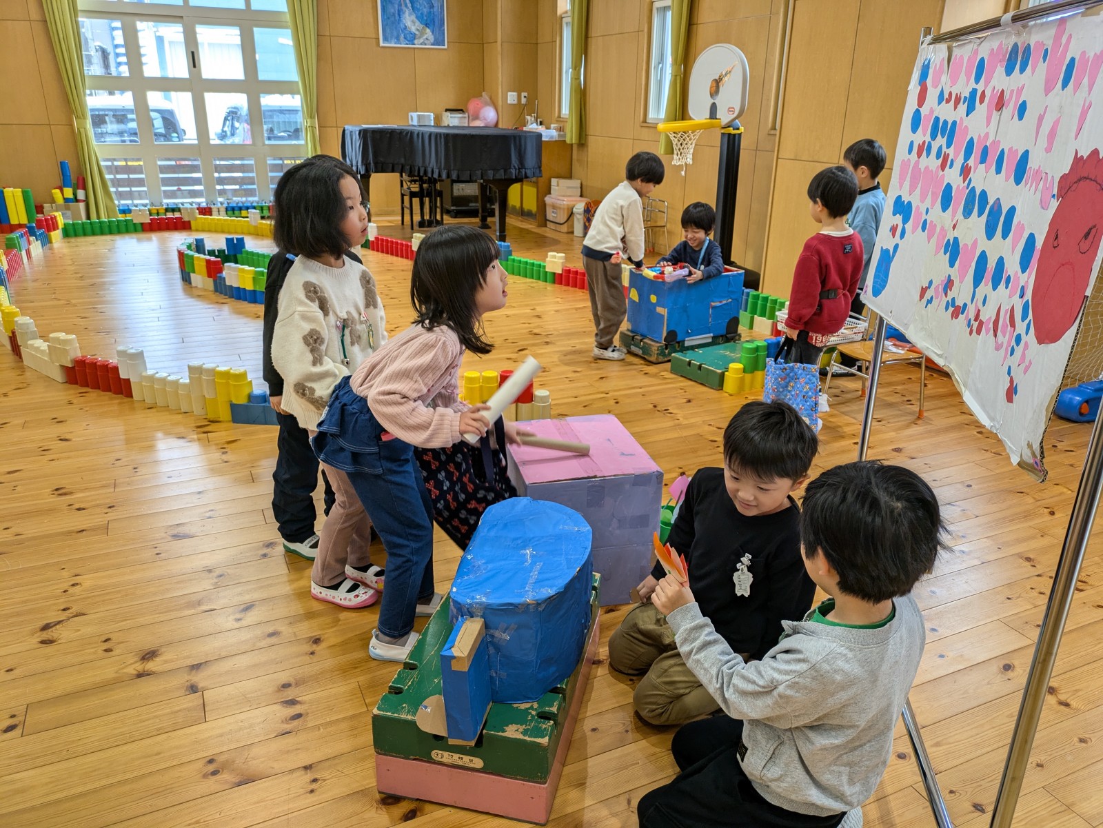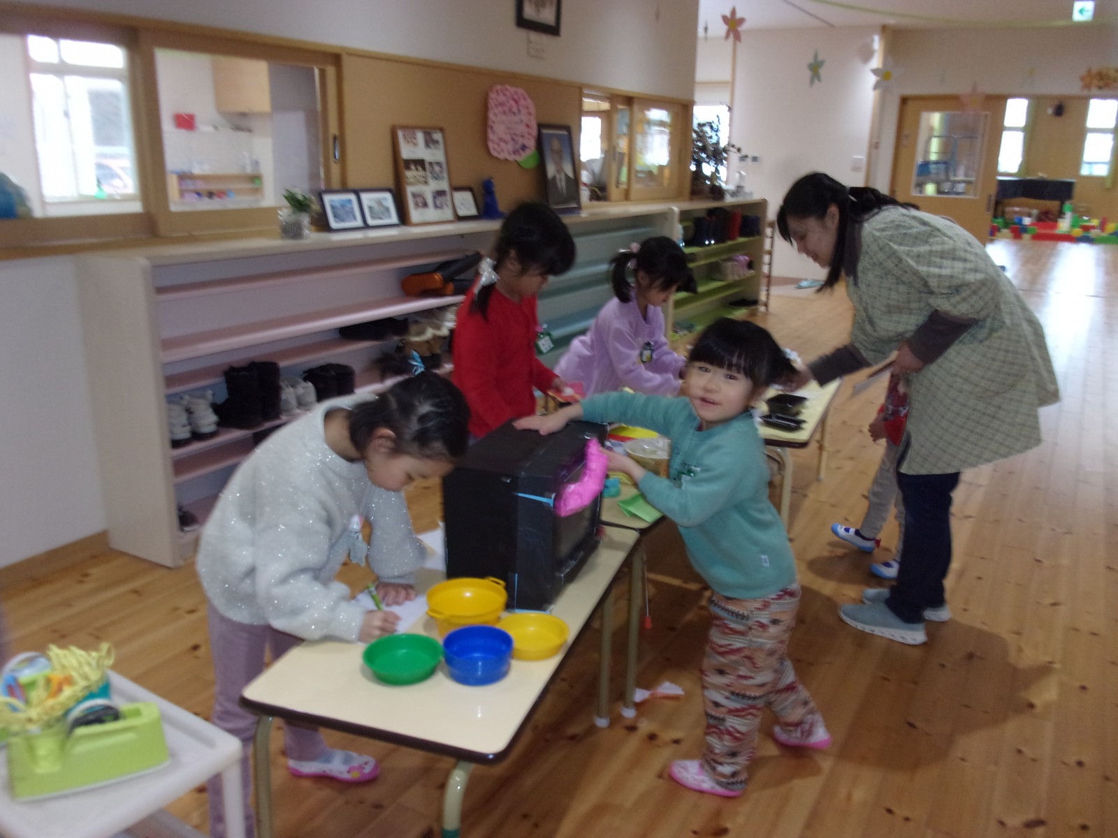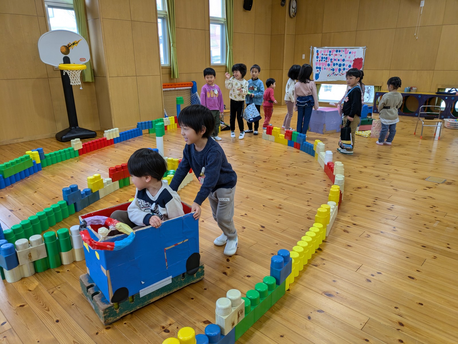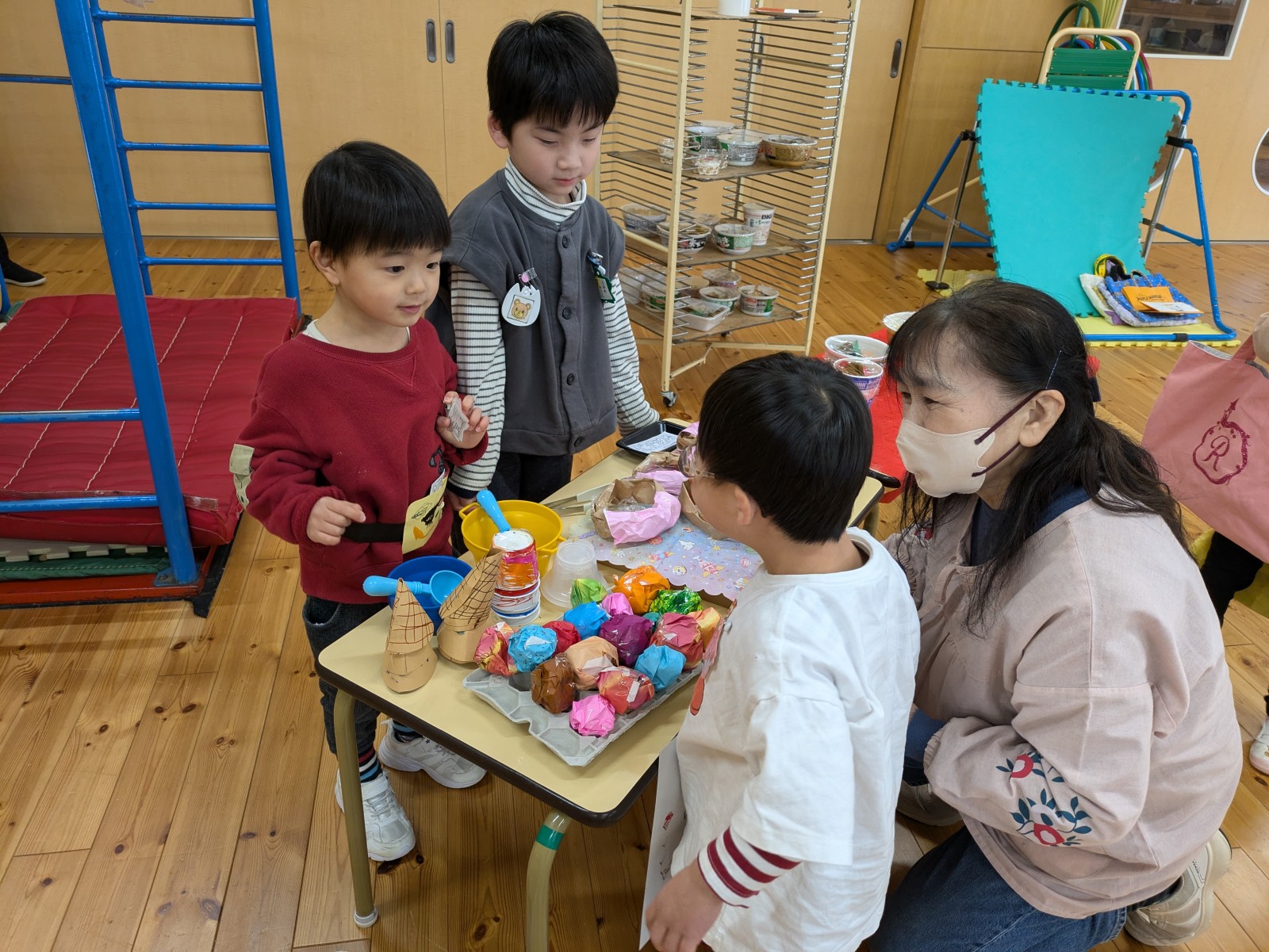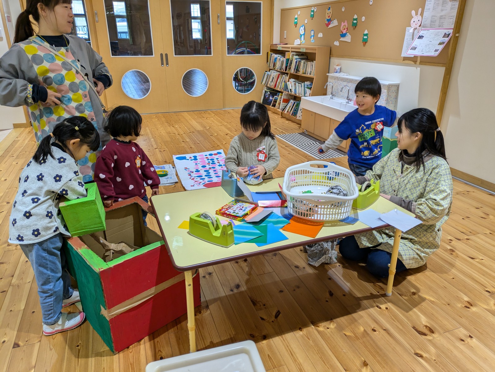 今年度は異年齢児との関わりや全クラスで活動を進めていくことが多かったのでおみせやさんごっこも自然と全クラスで取り組んでいました。郵便ごっこでのハガキを買いに行く経験やお買い物の紙芝居からの買い物ごっこ。「もっとお買い物したいよね」「品物もっと作ろうよ」と、どんな素材で何を作ろうか学年関係なくみんなで意見を出し合い、活動を進めていきました。話し合いも制作も関わる子が日々変わり、毎回自分のやりたいことに取りくみ、楽しんでいました。当日は買い物をたくさんする子、ゲームを繰り返し楽しむ子、買い物よりおみせやさんが楽しい子、とさまざまでした。給食もホールでみんなで食べ、特別感満載だったようです。マリオカートのコースをそのまま残し給食を食べることを話すと「マリオカート見ながら給食なんて最高だね!」なんて声もありました。マリオカートもまだまだ遊んでいますが、うめ組(5歳児)の“うめさんはらしん100えんショップ”もオープンし、チラシを作って配ったりと遊びがまだまだ継続しています。