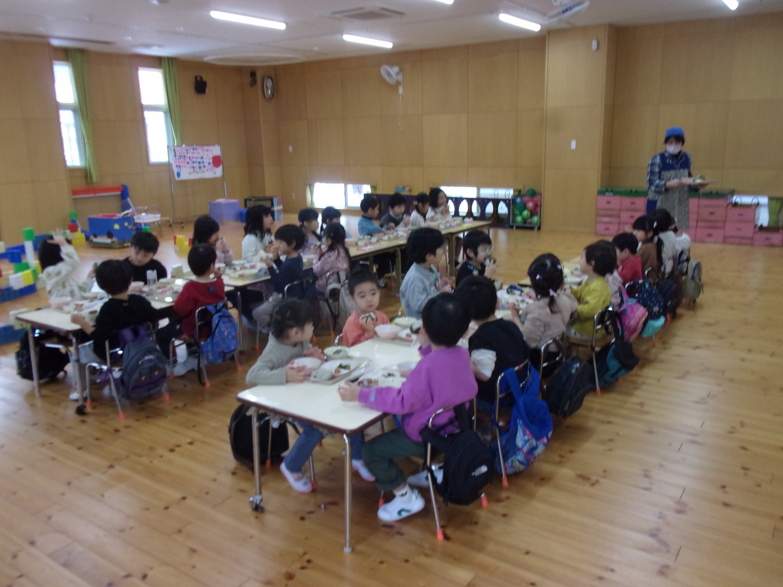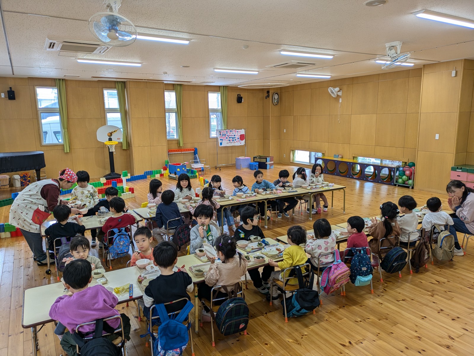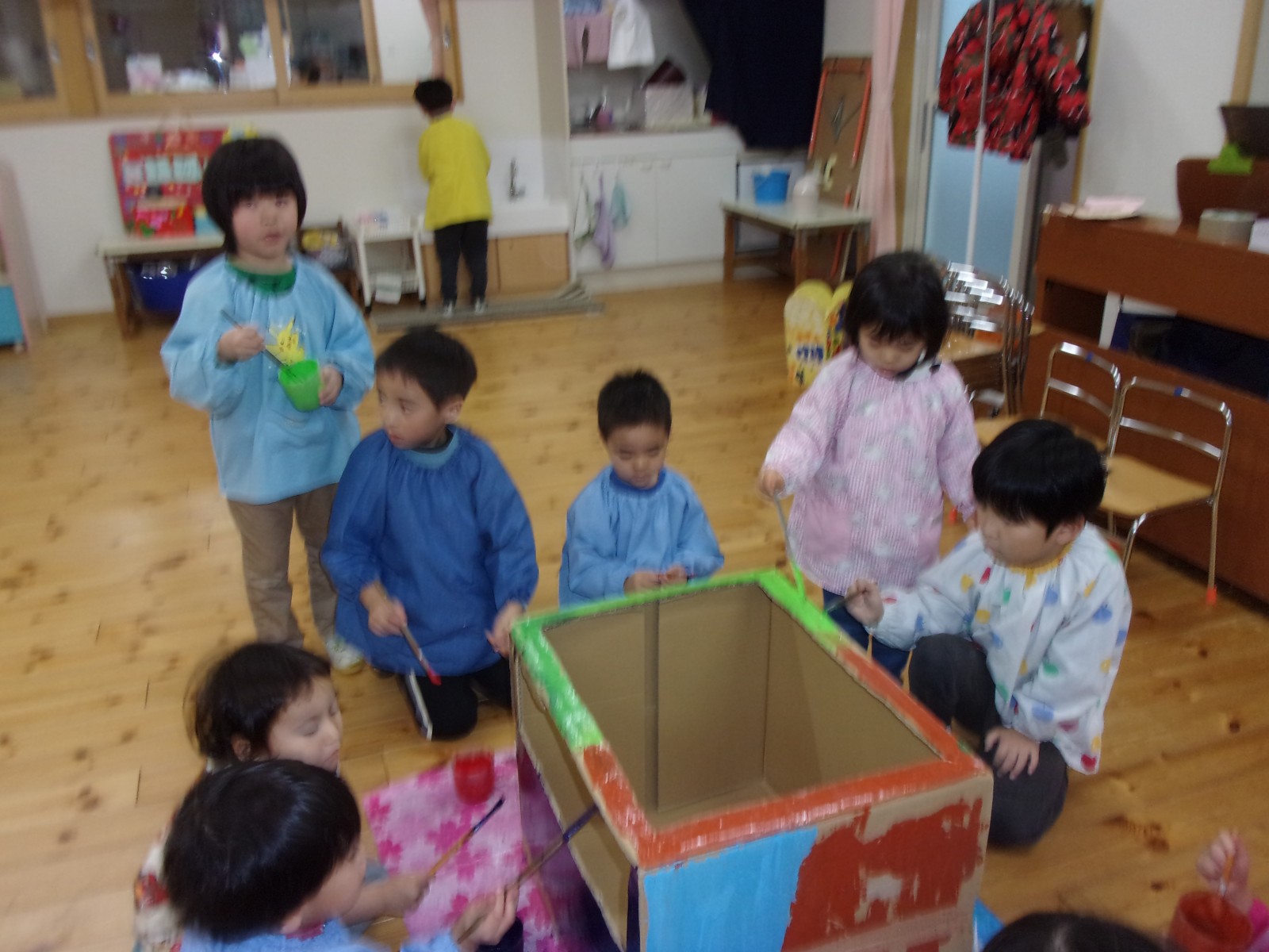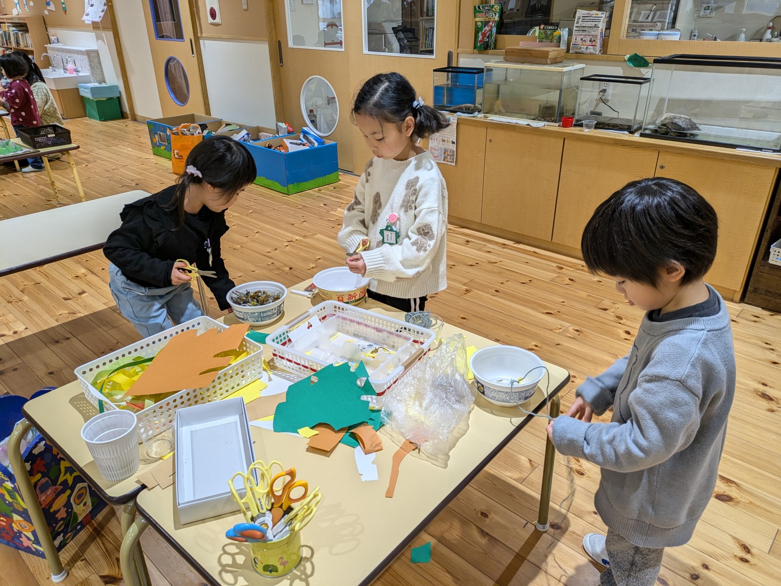 今年度は異年齢児との関わりや全クラスで活動を進めていくことが多かったのでおみせやさんごっこも自然と全クラスで取り組んでいました。郵便ごっこでのハガキを買いに行く経験やお買い物の紙芝居からの買い物ごっこ。「もっとお買い物したいよね」「品物もっと作ろうよ」と、どんな素材で何を作ろうか学年関係なくみんなで意見を出し合い、活動を進めていきました。話し合いも制作も関わる子が日々変わり、毎回自分のやりたいことに取りくみ、楽しんでいました。当日は買い物をたくさんする子、ゲームを繰り返し楽しむ子、買い物よりおみせやさんが楽しい子、とさまざまでした。給食もホールでみんなで食べ、特別感満載だったようです。マリオカートのコースをそのまま残し給食を食べることを話すと「マリオカート見ながら給食なんて最高だね!」なんて声もありました。マリオカートもまだまだ遊んでいますが、うめ組(5歳児)の“うめさんはらしん100えんショップ”もオープンし、チラシを作って配ったりと遊びがまだまだ継続しています。