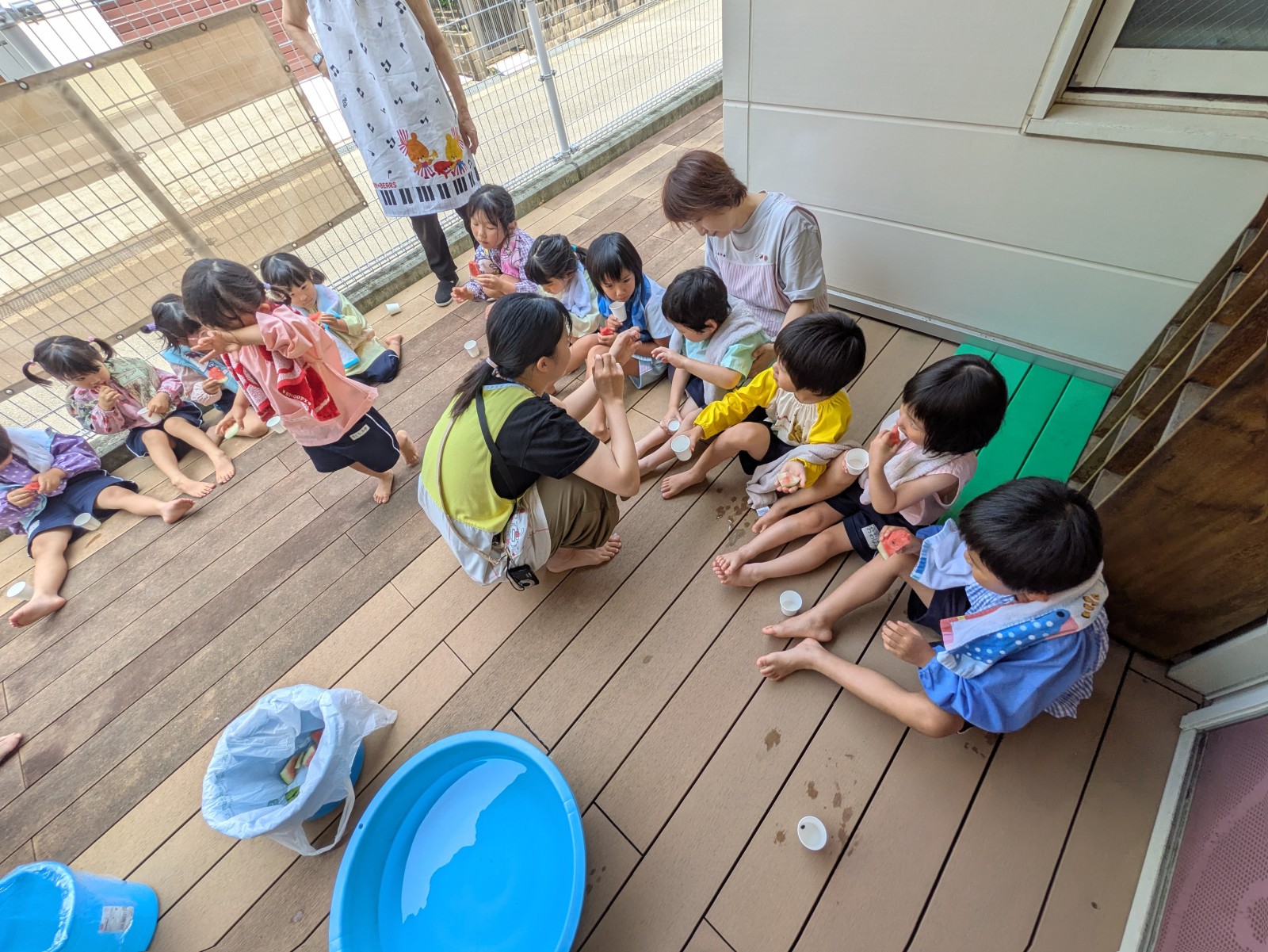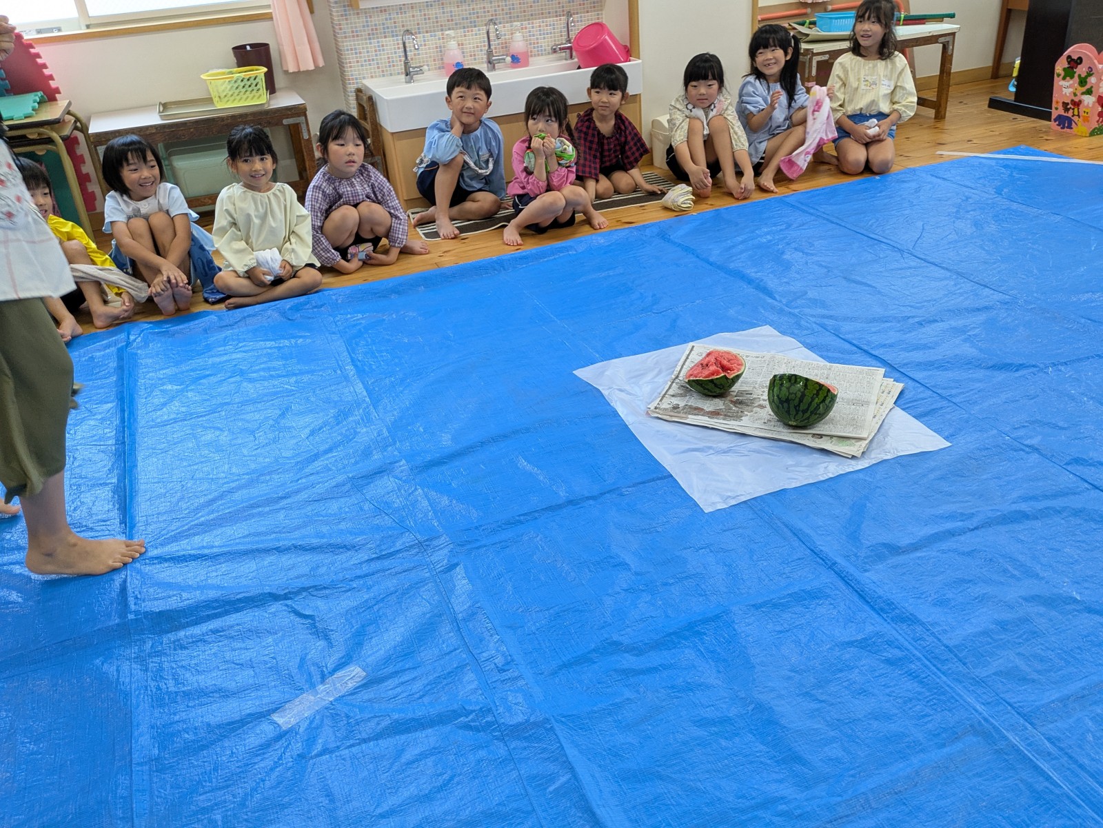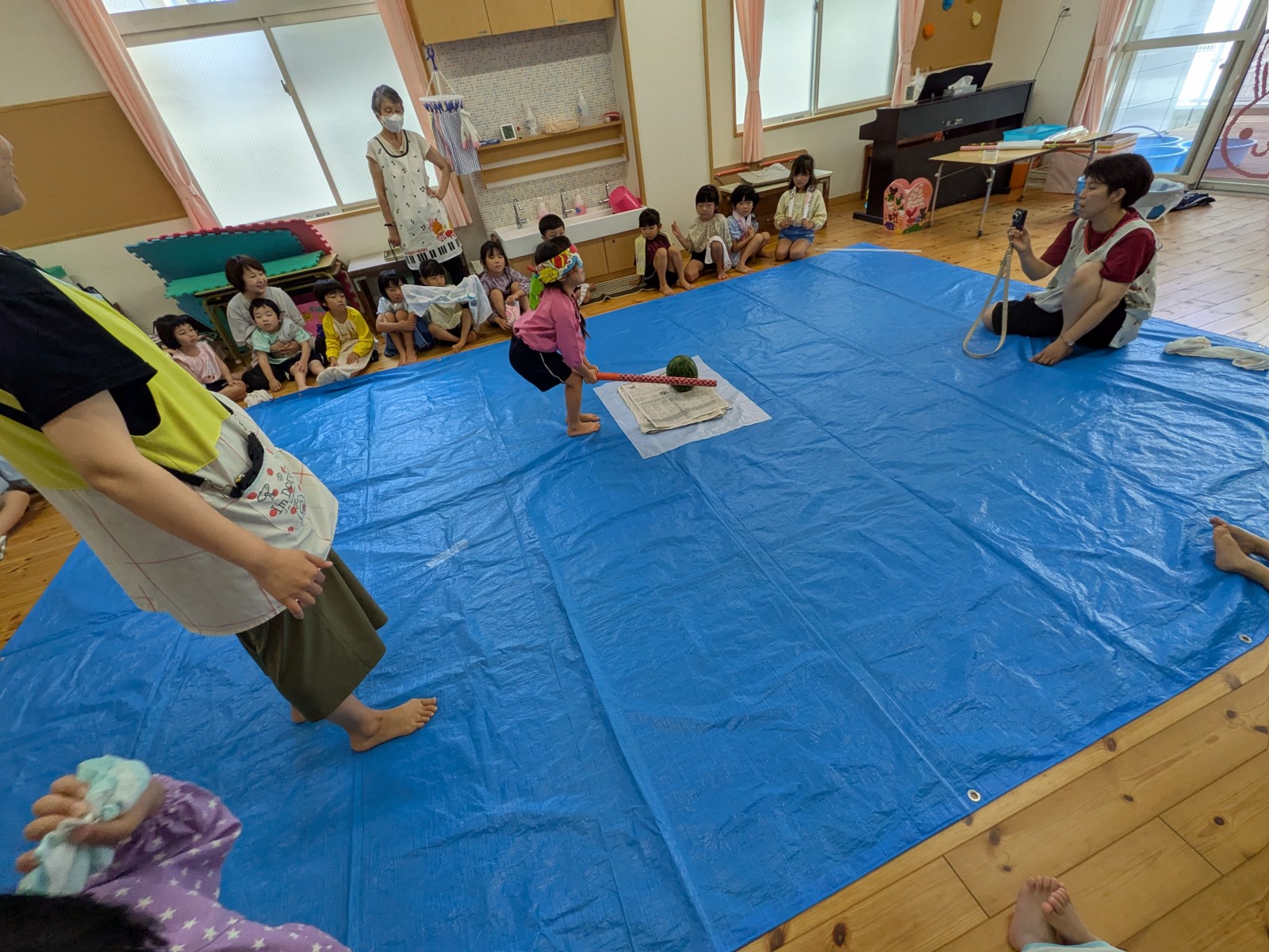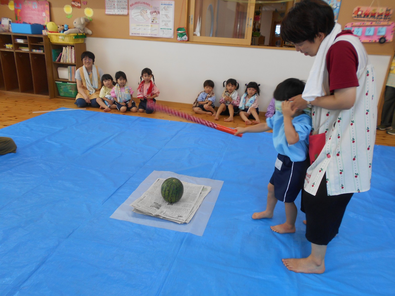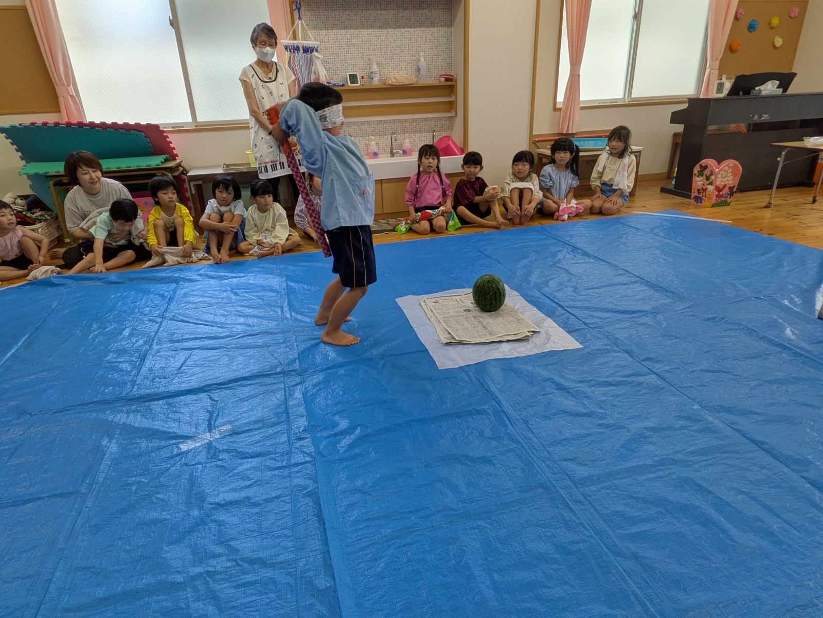 持ってきたタオルで目隠しをして、みんなの声かけに導かれ・・・すみれ組・ひよこ組さんは当たりそうで当たらなく「あとちょっと!」「惜しかったね」の繰り返し。うめ組・ばら組さんになると少しずつ当たり始めたり転がったりしていましたが、結局割れずじまいでした。「目隠ししないでやってみたい」のリクエストがあったのでもう1回やりたいお友だちに目隠しなしで挑戦!見えていても棒で叩くのは案外難しいようで、「見えているのに何で?」と不思議顔の子どもたちでした。最終的には保育者が見事割り、「すごい!」とビックリの子どもたち。割れたすいかとは別の食べる用のすいかをすいか割り後と給食時にいただきました。たくさんおかわりする子どもたち、暑い日だったのでよい水分補給となったようです。