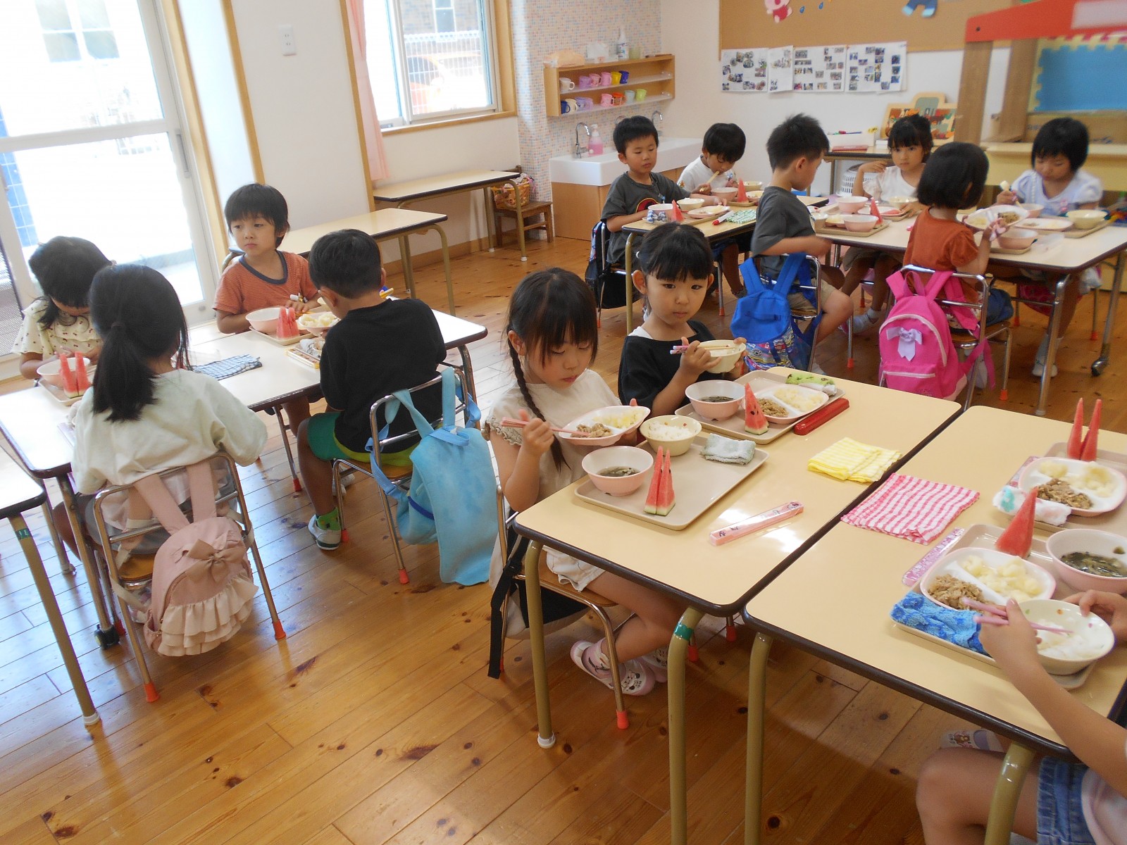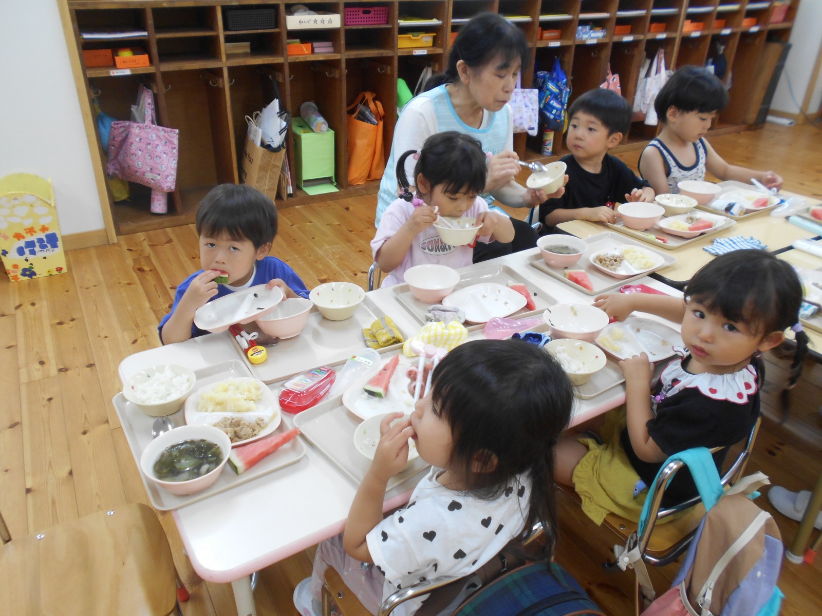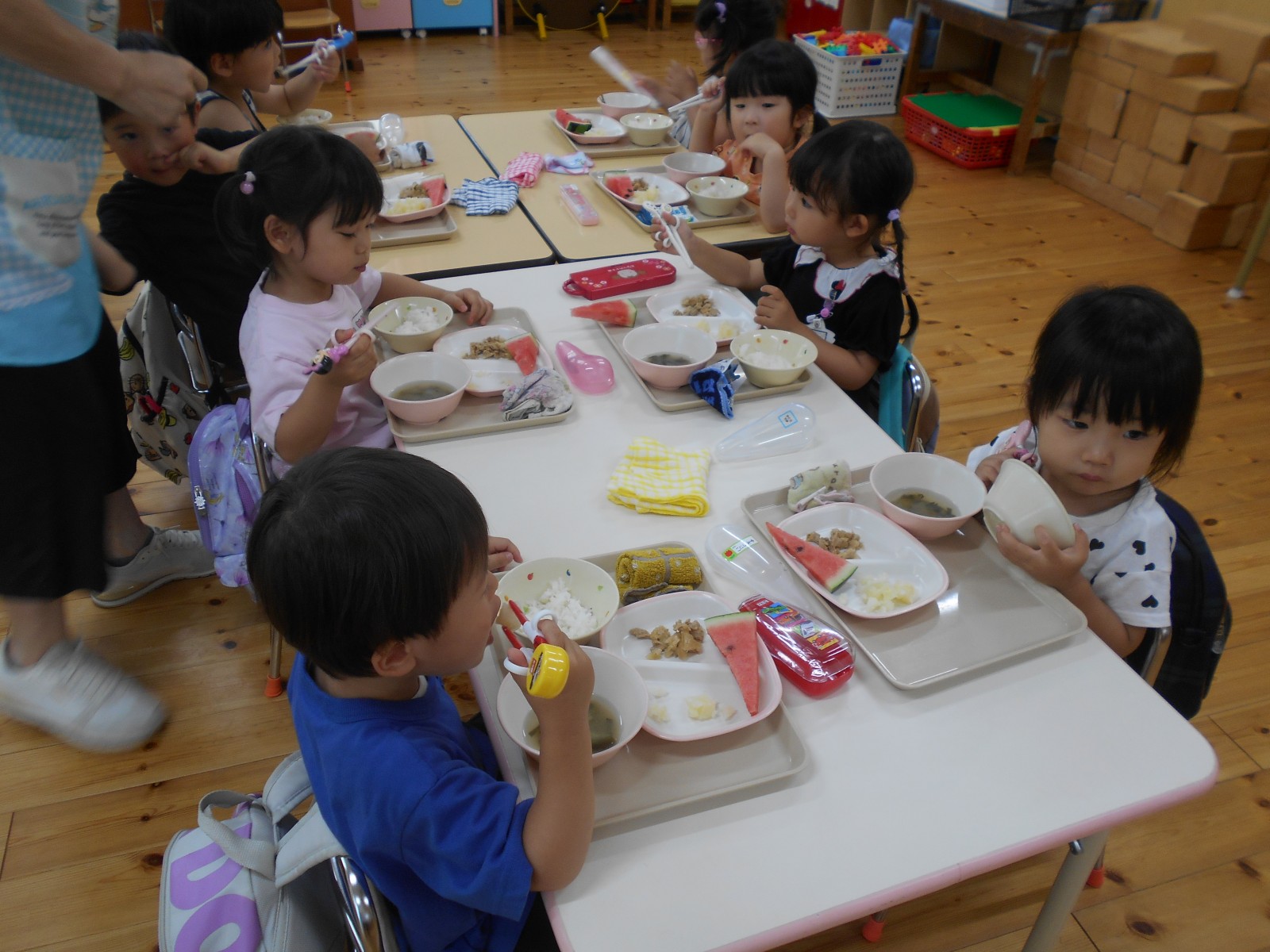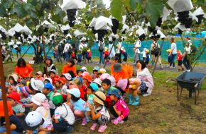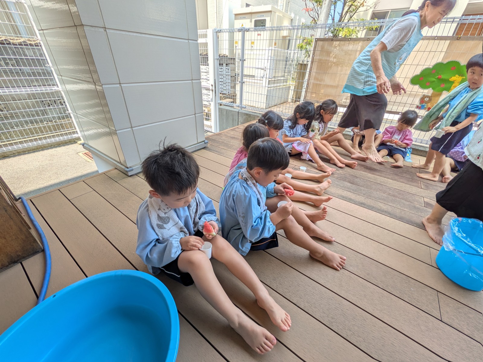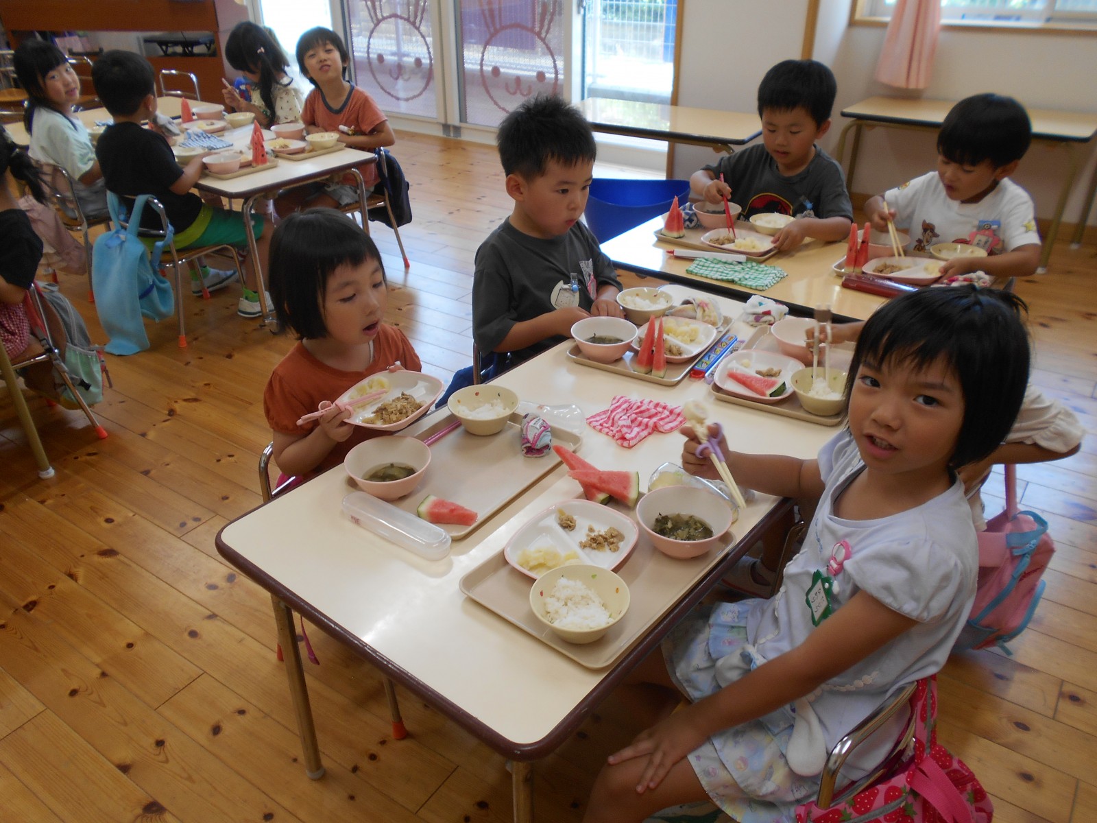 持ってきたタオルで目隠しをして、みんなの声かけに導かれ・・・すみれ組・ひよこ組さんは当たりそうで当たらなく「あとちょっと!」「惜しかったね」の繰り返し。うめ組・ばら組さんになると少しずつ当たり始めたり転がったりしていましたが、結局割れずじまいでした。「目隠ししないでやってみたい」のリクエストがあったのでもう1回やりたいお友だちに目隠しなしで挑戦!見えていても棒で叩くのは案外難しいようで、「見えているのに何で?」と不思議顔の子どもたちでした。最終的には保育者が見事割り、「すごい!」とビックリの子どもたち。割れたすいかとは別の食べる用のすいかをすいか割り後と給食時にいただきました。たくさんおかわりする子どもたち、暑い日だったのでよい水分補給となったようです。