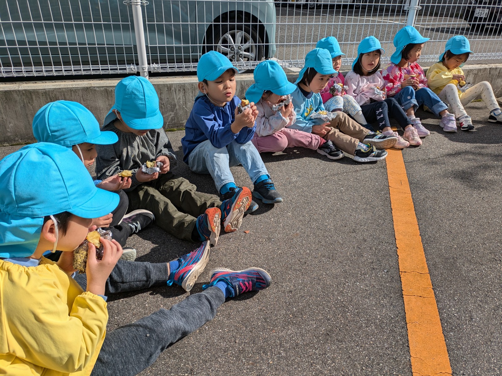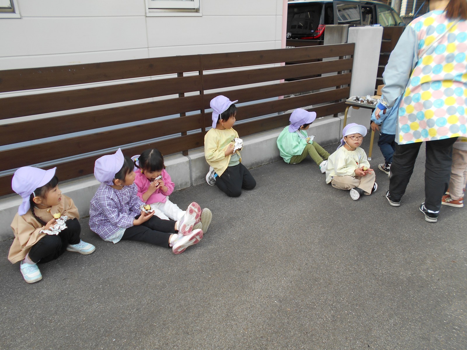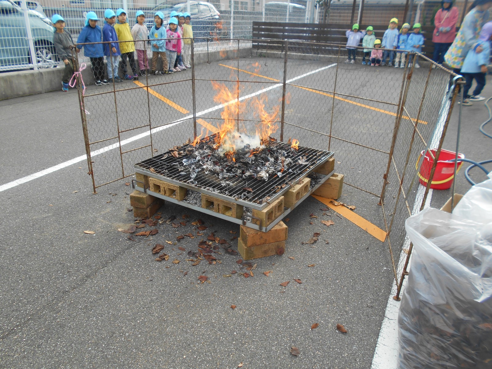 園バス運転手の瀬崎さんが準備してくださった網の上に子どもたちがさつまいもを並べ、米山公園で集めた落ち葉を被せ点火!よく乾いた落ち葉でしたのでしっかりと火が点き、無風だったので煙も舞うことなく焼き上がりを待てました。焼きたてのさつまいもはアツアツで甘く、とてもおいしかったです。神さまのお恵みに感謝するよい経験となりました。
