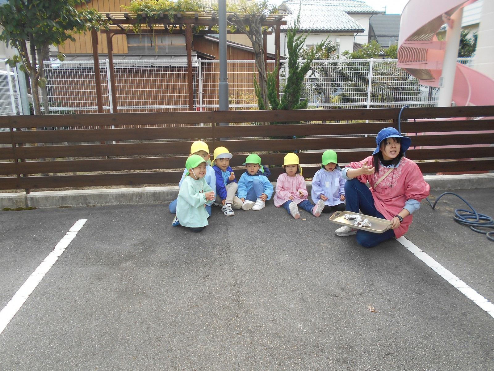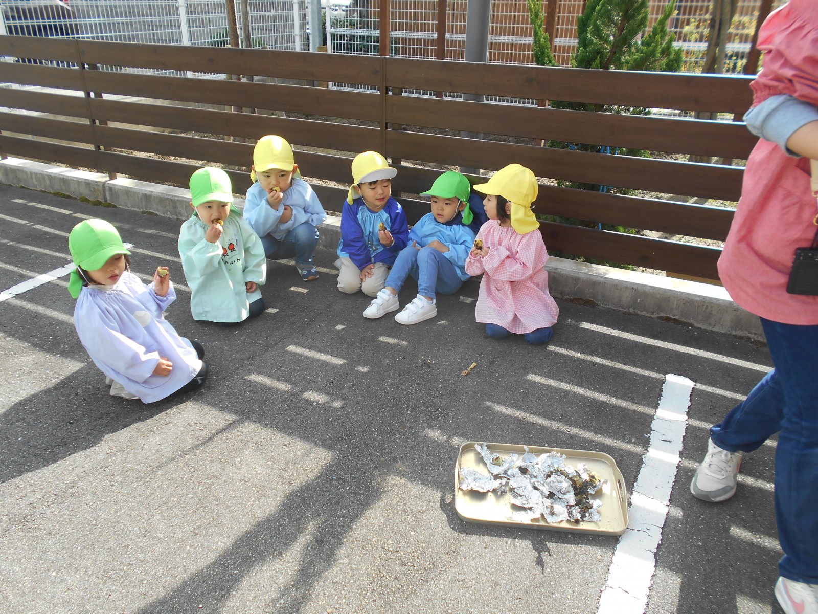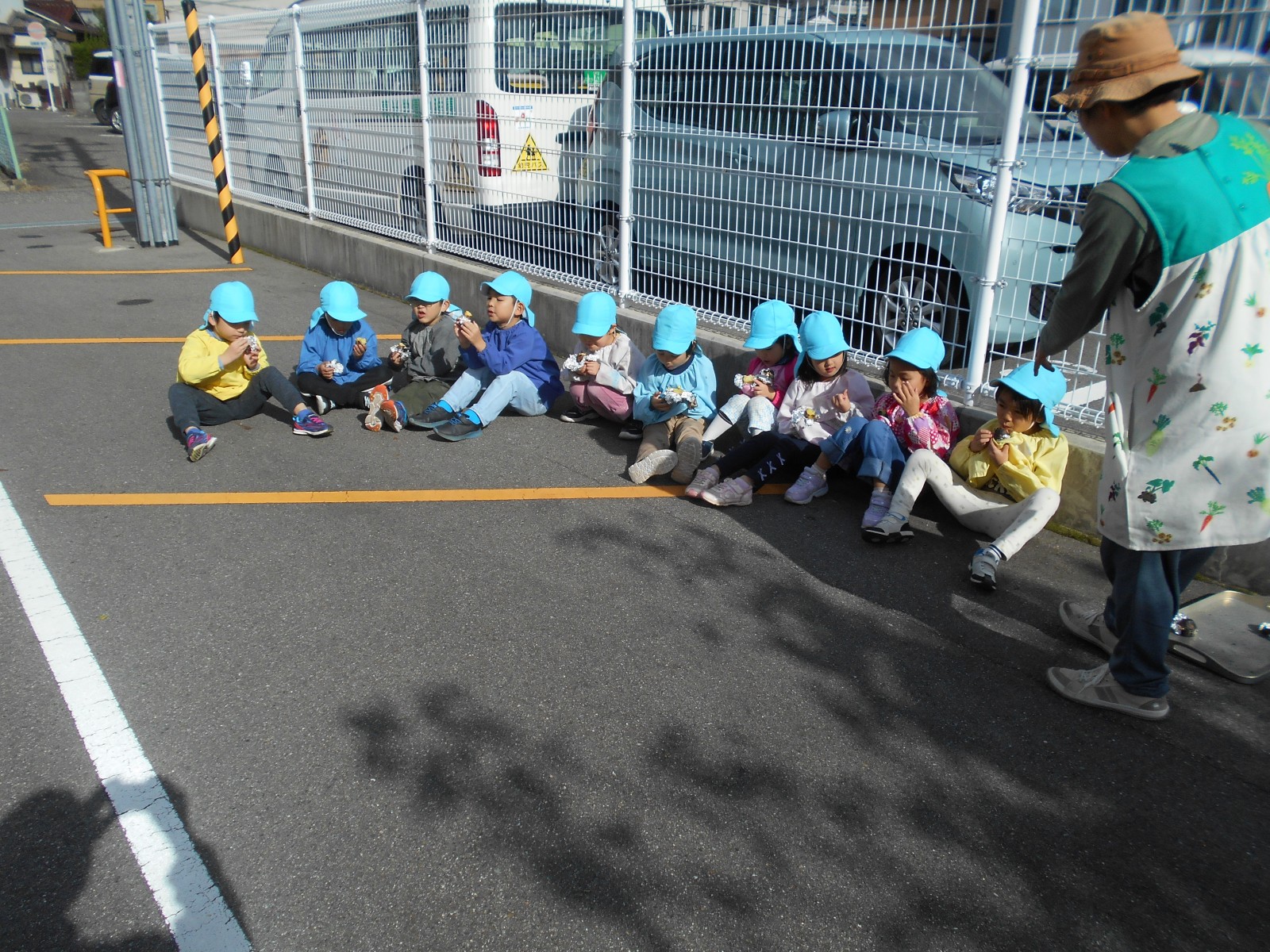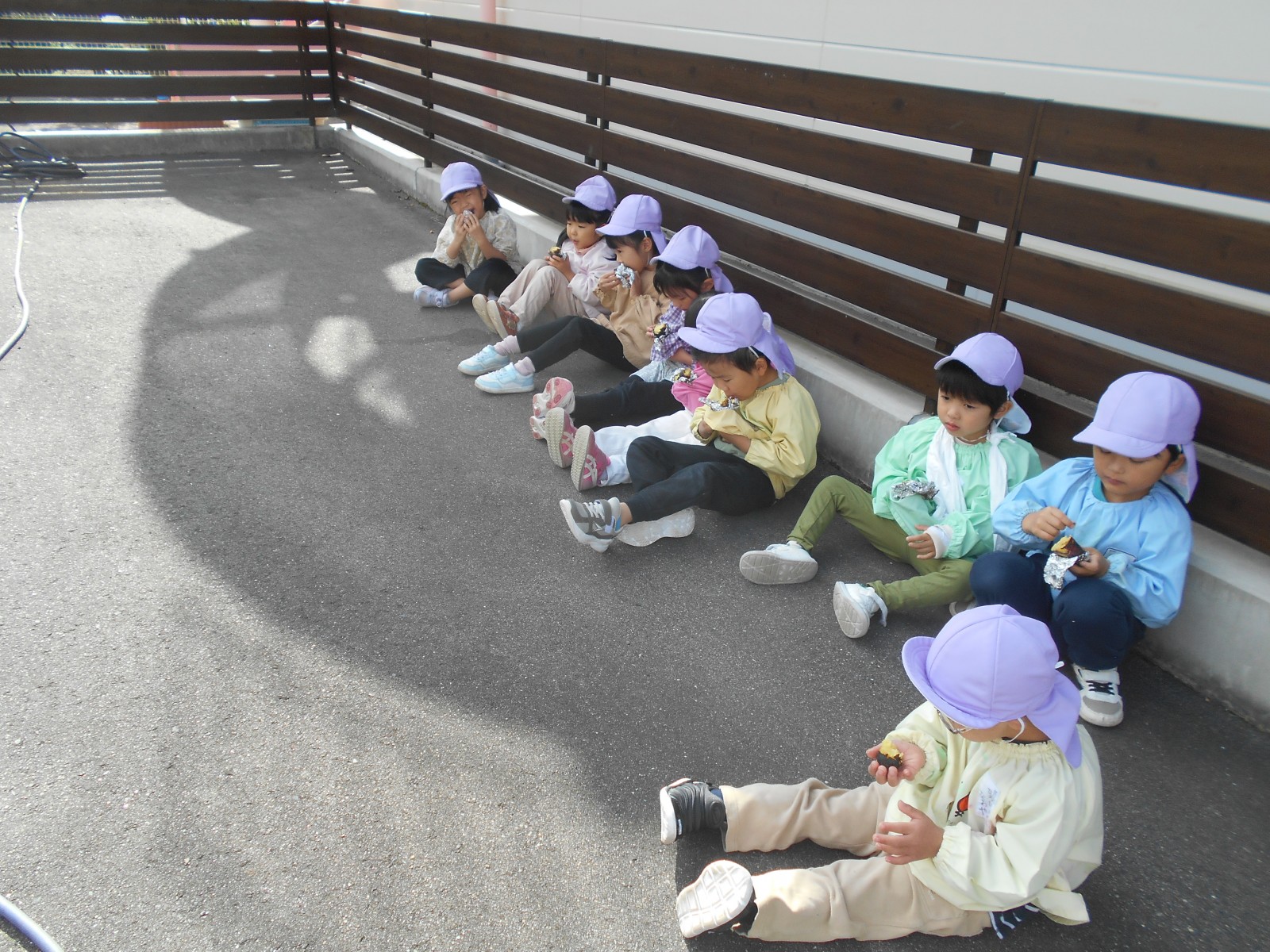 園バス運転手の瀬崎さんが準備してくださった網の上に子どもたちがさつまいもを並べ、米山公園で集めた落ち葉を被せ点火!よく乾いた落ち葉でしたのでしっかりと火が点き、無風だったので煙も舞うことなく焼き上がりを待てました。焼きたてのさつまいもはアツアツで甘く、とてもおいしかったです。神さまのお恵みに感謝するよい経験となりました。