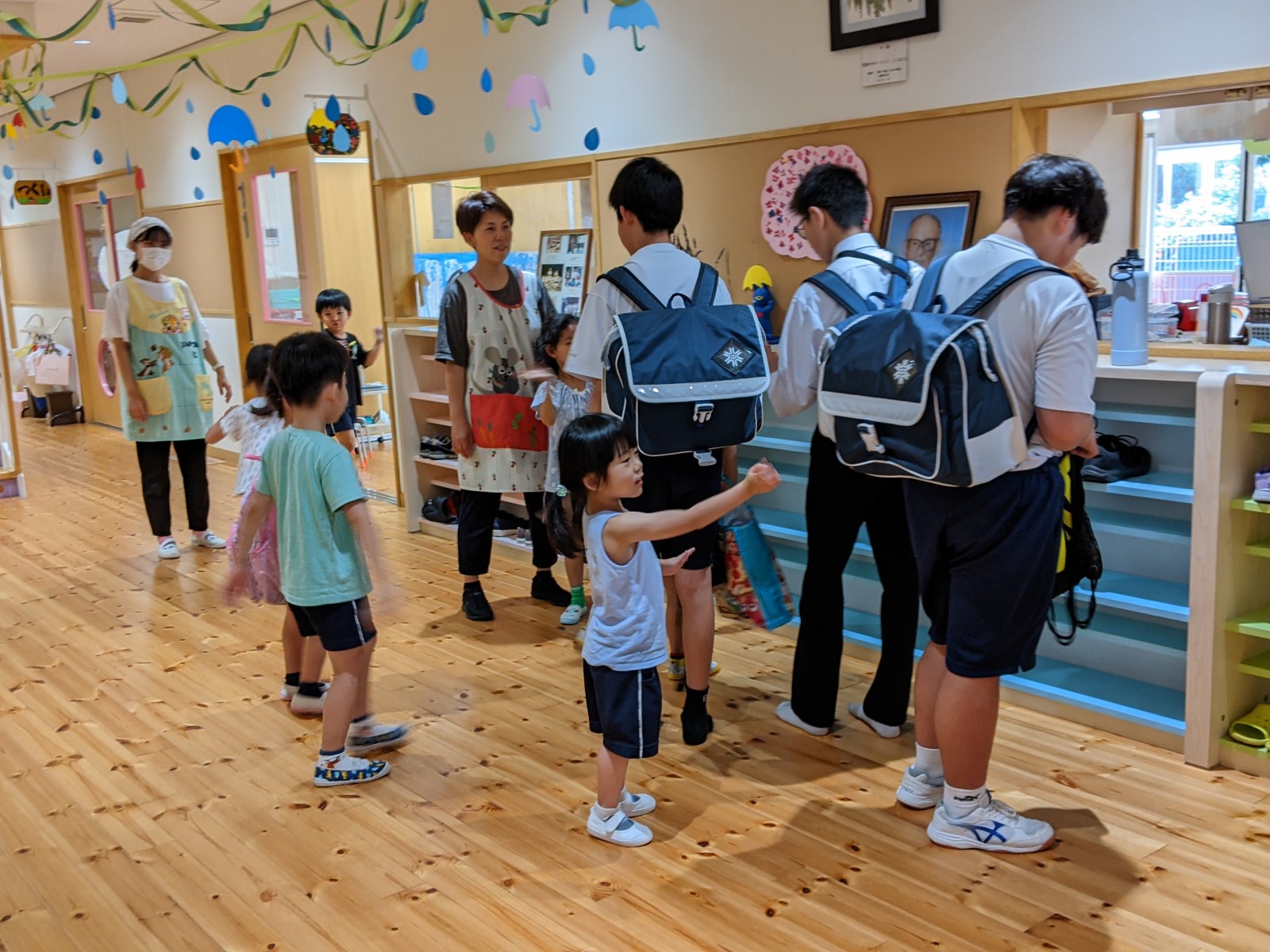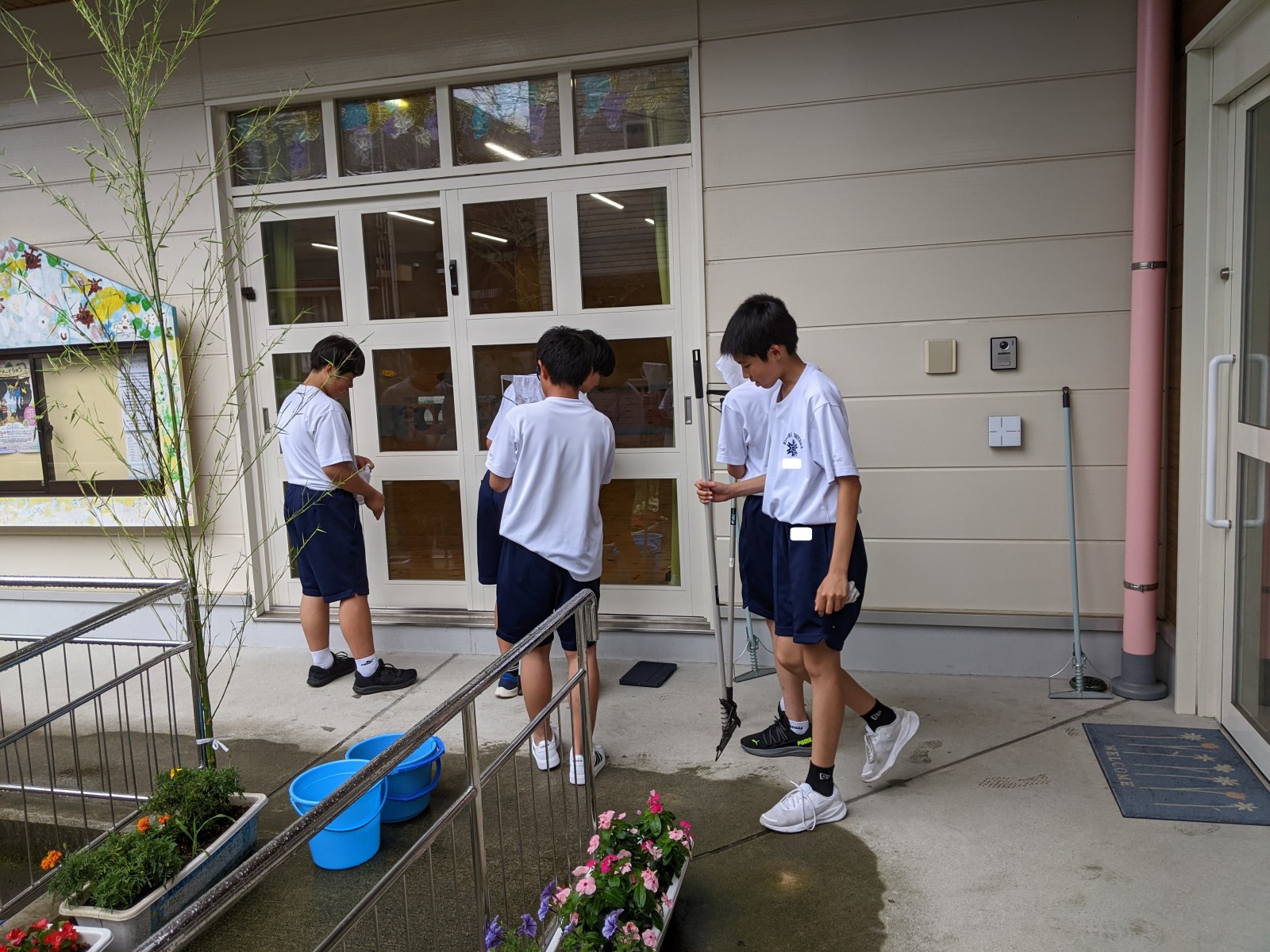 少しの時間ですが子どもたち遊び、その後普段なかなか掃除できない園舎外側の窓拭きのお手伝いをしてもらいました。