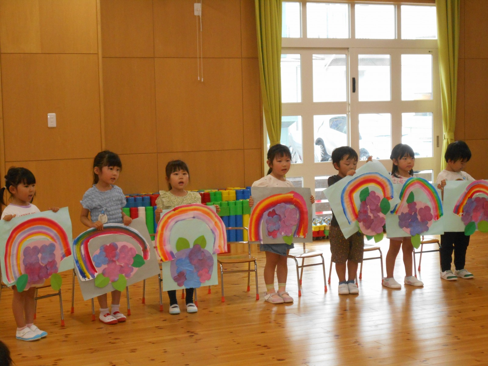 ・ばら組は ♪にじ を自分で作った虹のデザイン画を持ちながら
