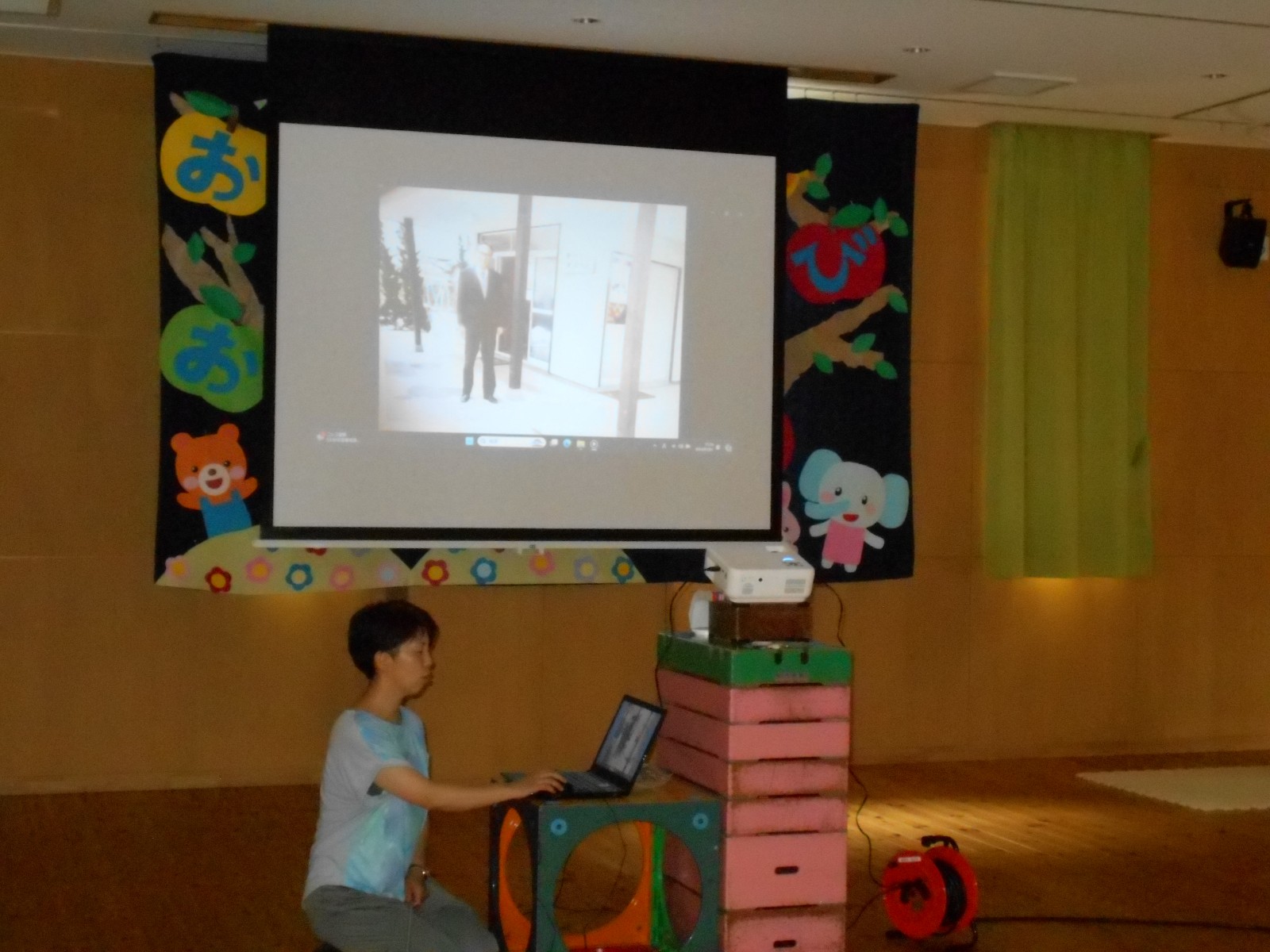 その後、幼稚園創立からの写真のスライドショーを見ました。園舎の周りが畑で何もなかったり、クリスマスツリーが今と同じだったりと園の歴史に触れることができました。