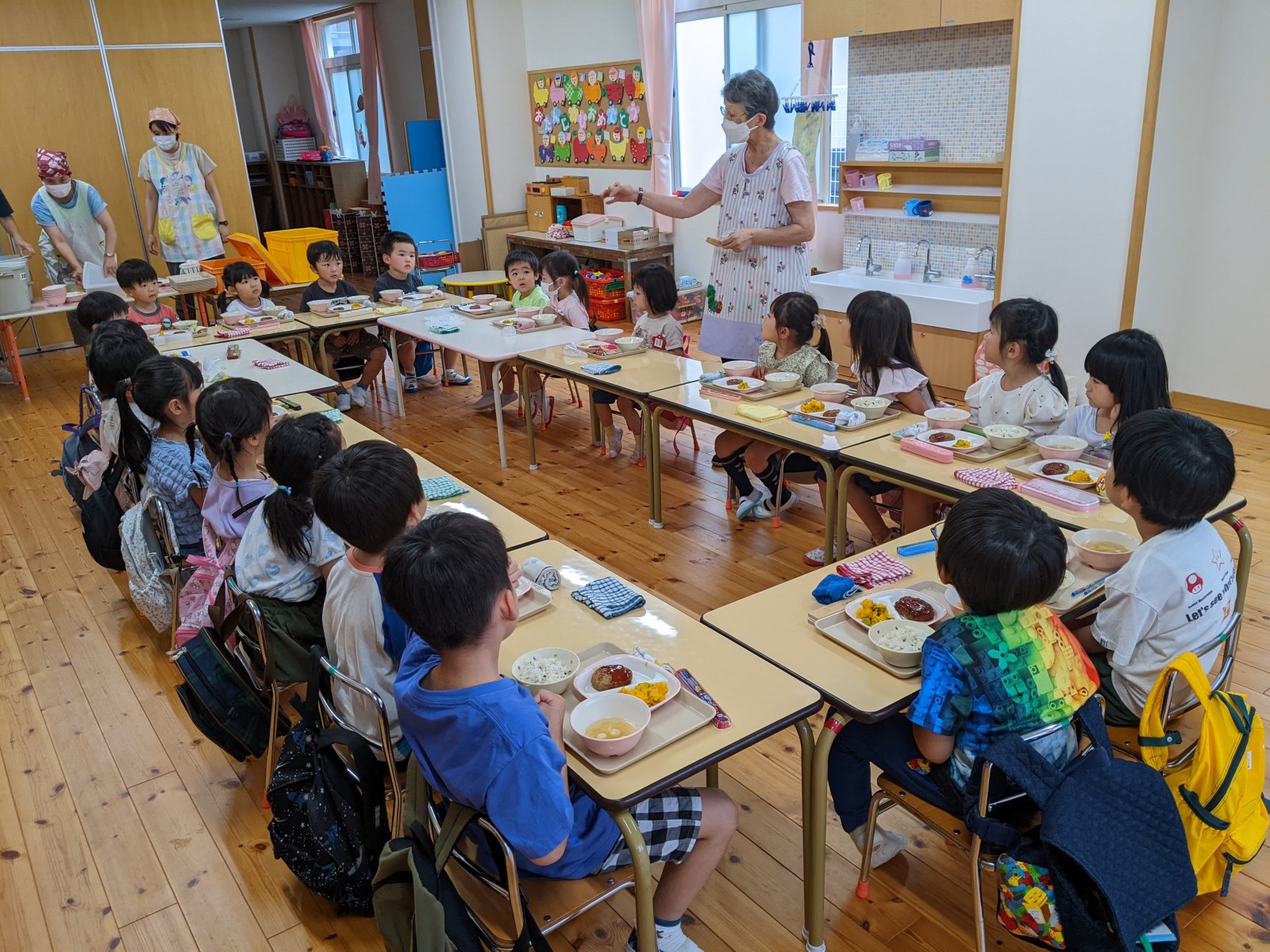 給食の時にはスペシャルデザート“バウムクーヘン”木の年輪と同じ、というバウムクーヘンのお話を園長先生からお聞きした後、全園児で給食を食べました。