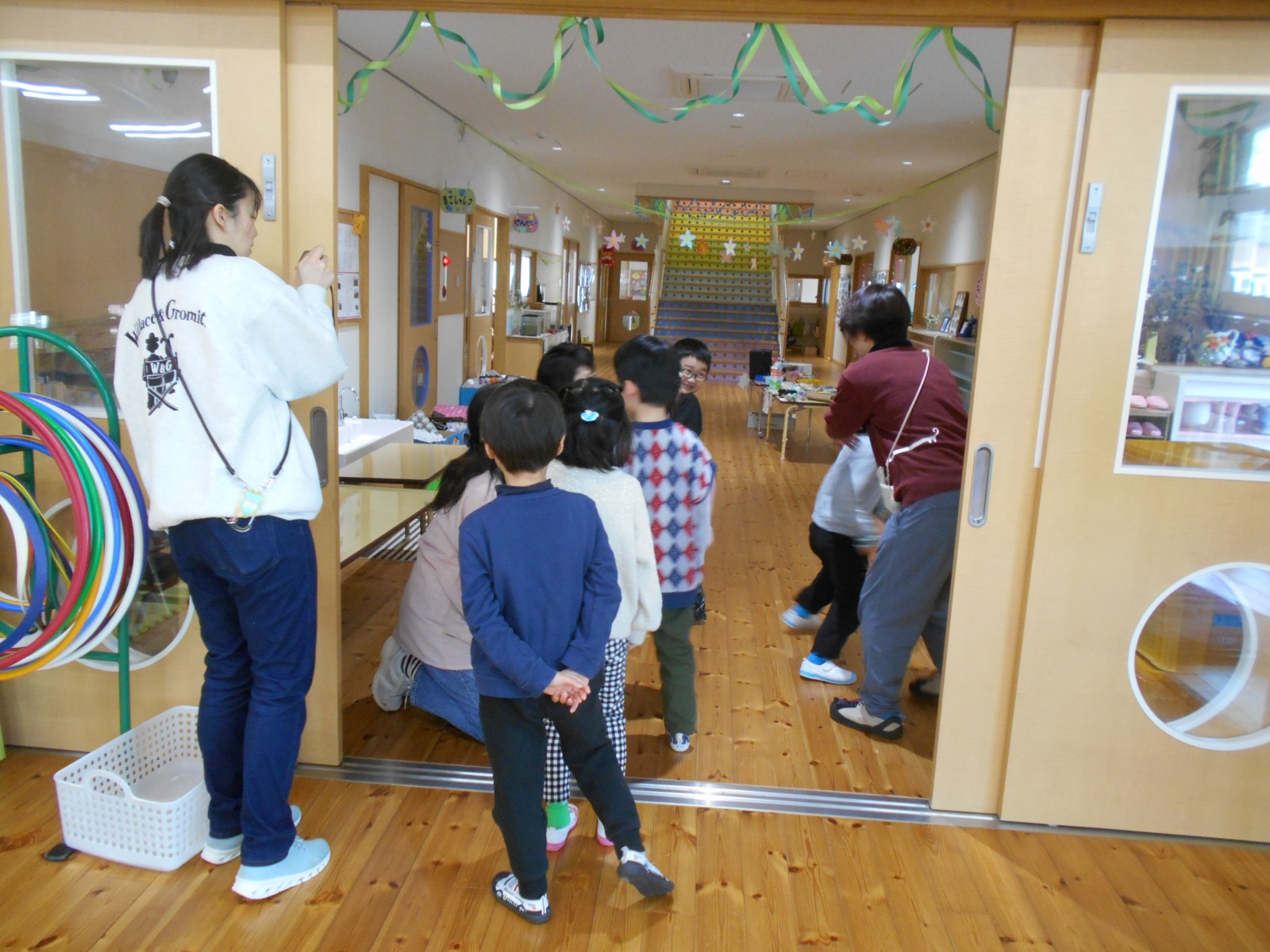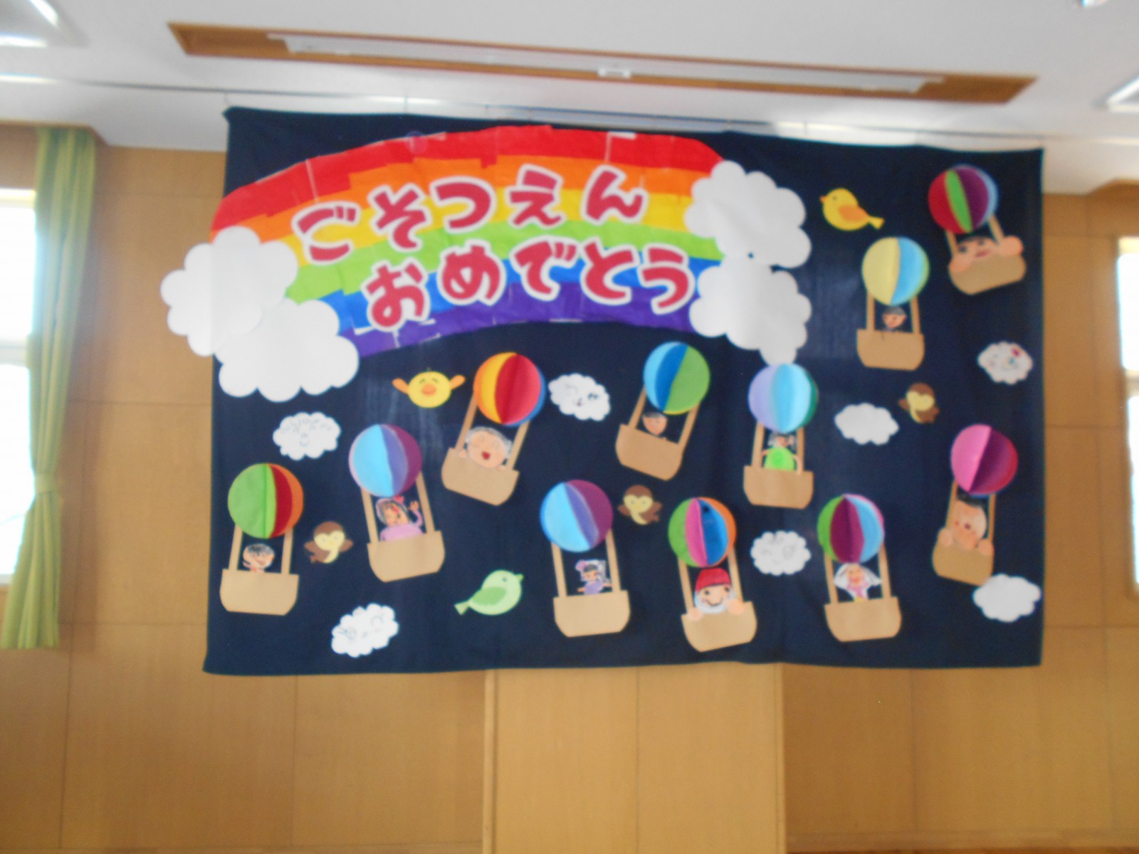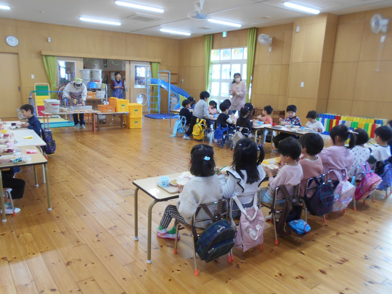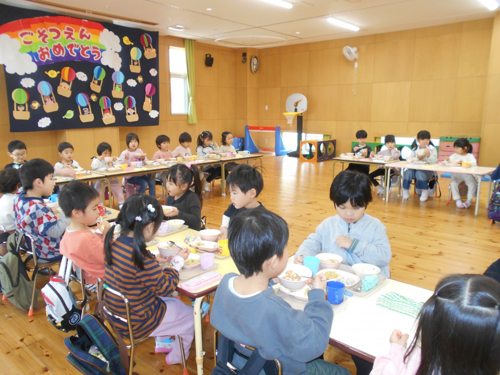 ♪おもいでのアルバムのBGMの中、うめ組の一人ひとりと握手し見送った後は、ホールでの給食の準備もばら組のみんなが力を合わせて取り組んでくれ、全園児で楽しいひと時を過ごすことができました。