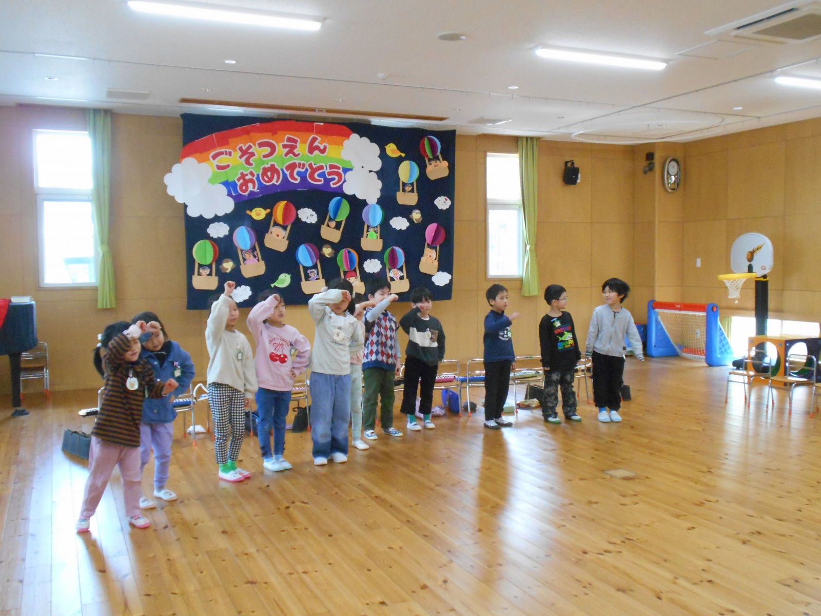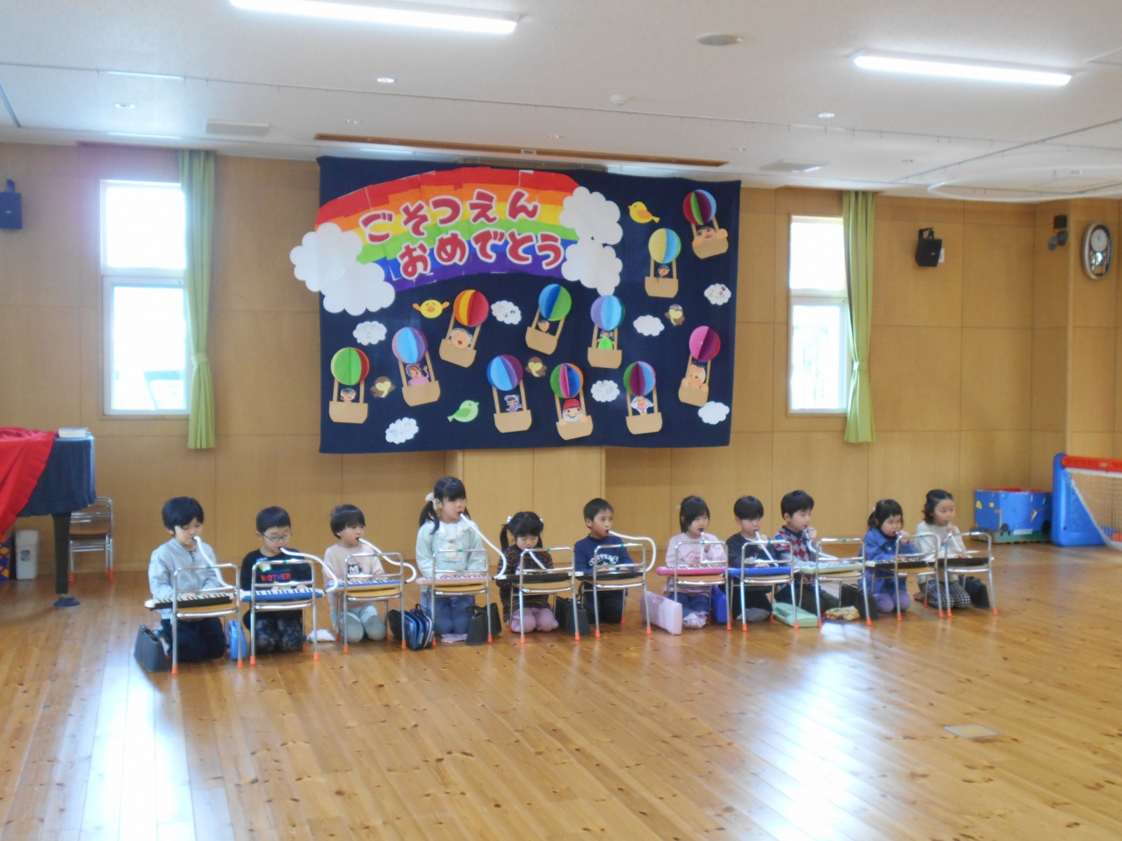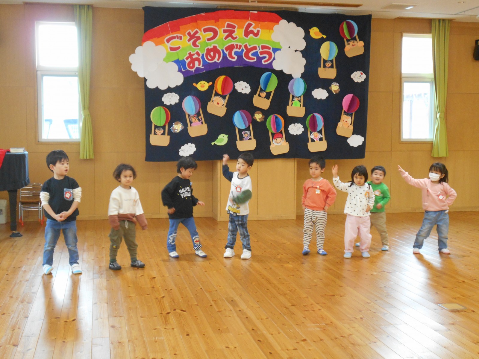 うめ組(5歳児)の卒園とばら組(4歳児)すみれ組(3歳児)ひよこ組(満3歳児)の進級をお祝い会を行いました。