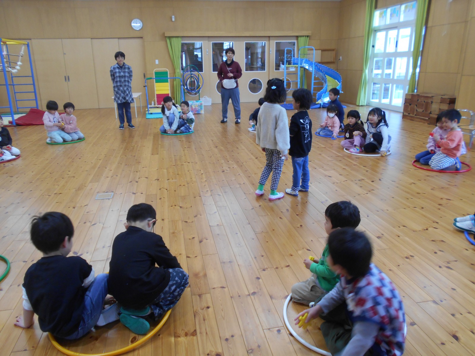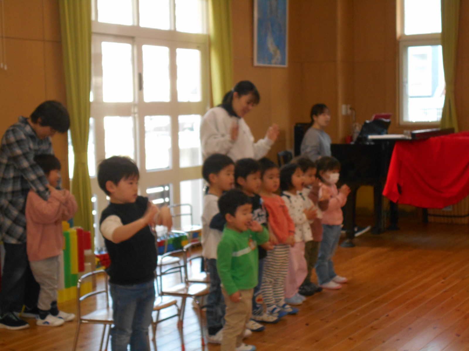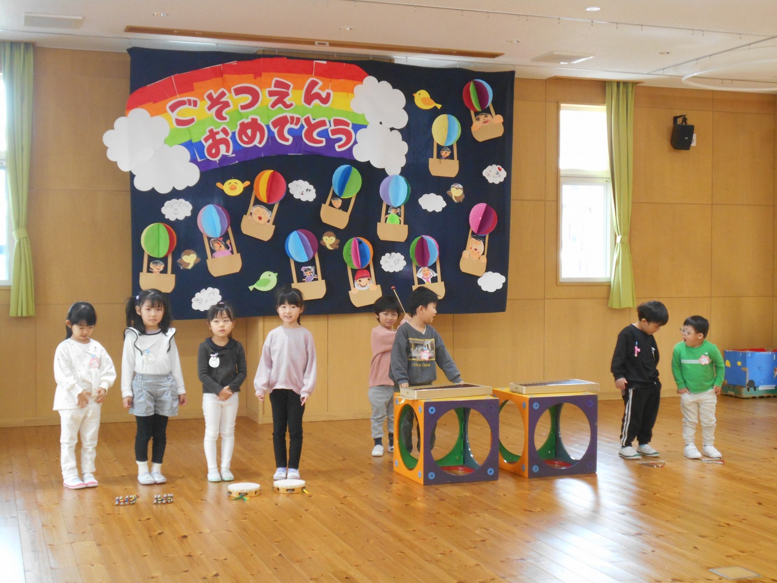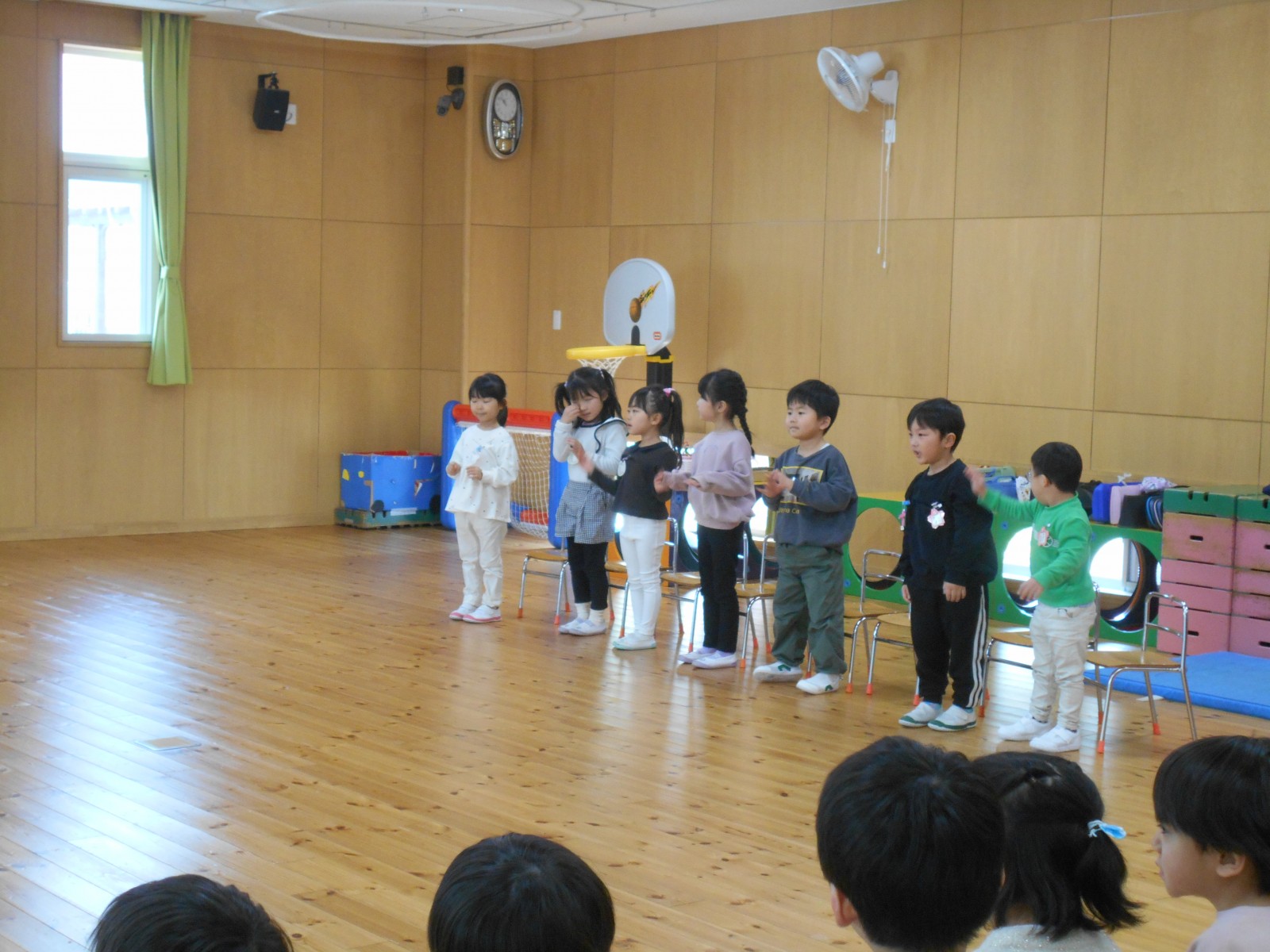 すみれ組、ひよこ組は♪にじのむこうに に合わせて表現遊び(ダンス)をばら組は♪にじ に合わせ歌と楽器でお祝いしました。