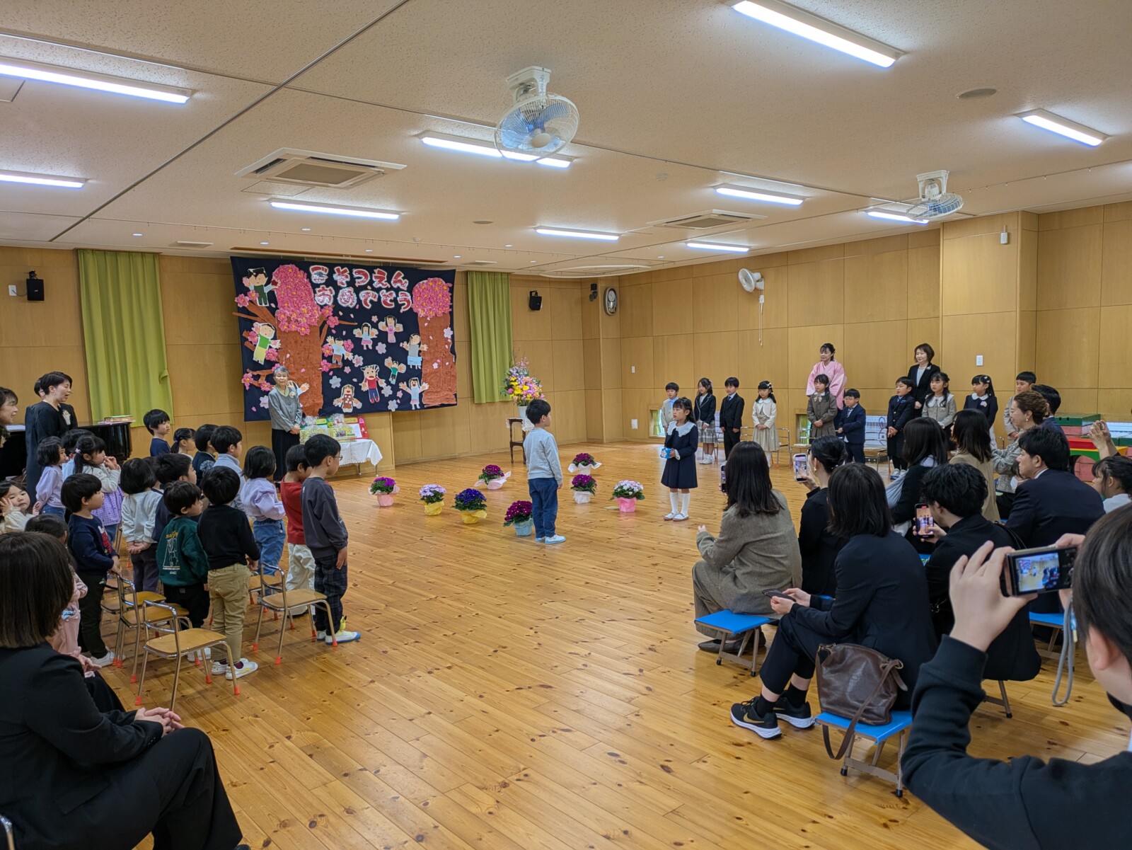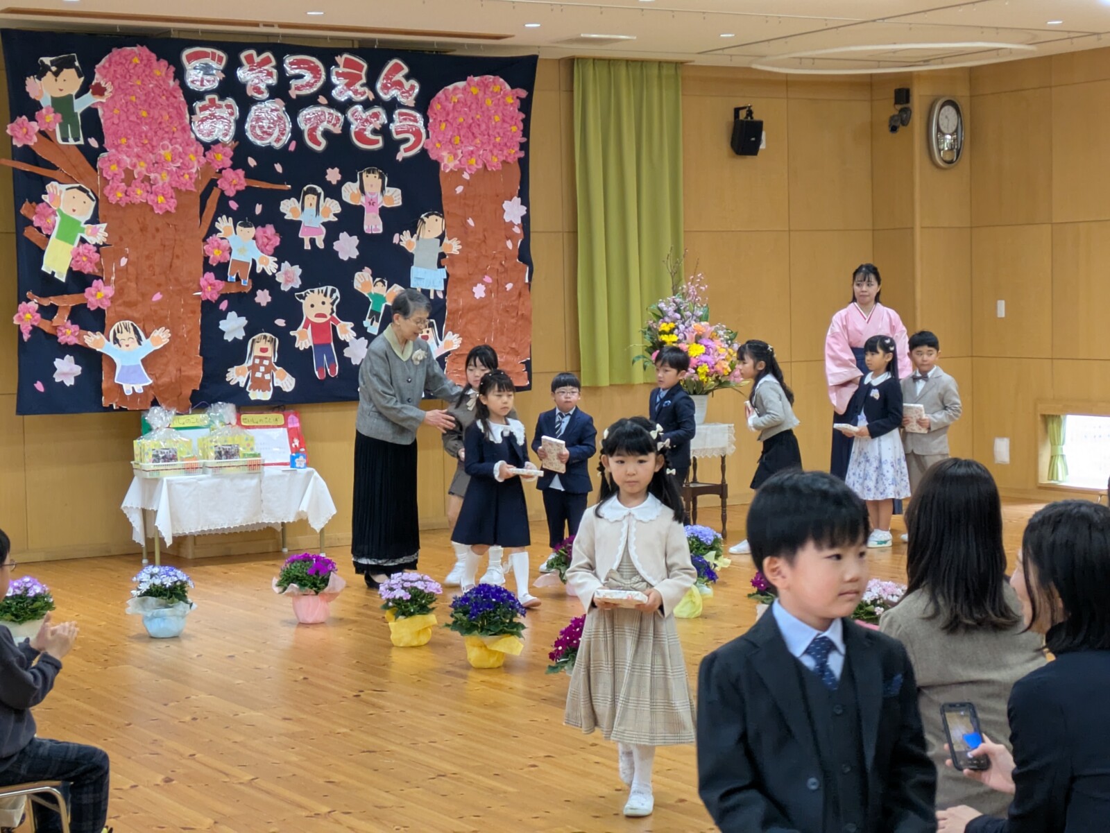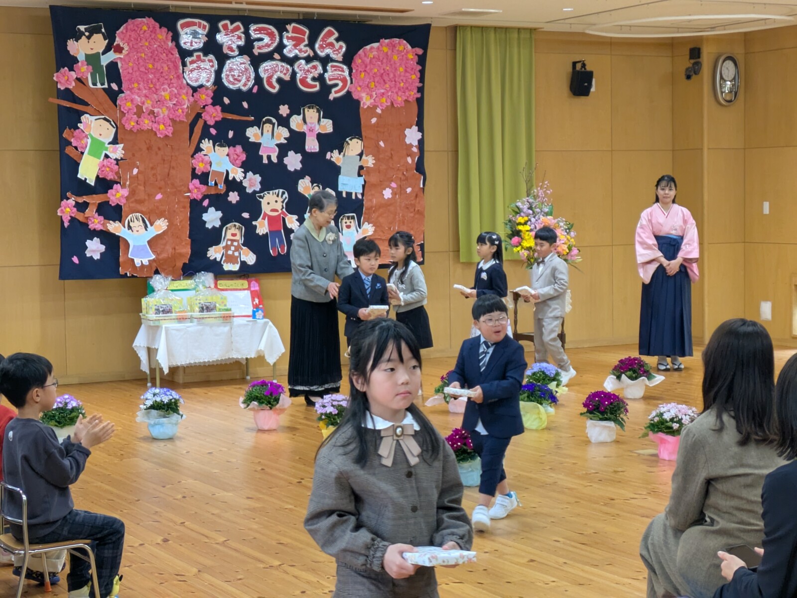 うめ組さんからばら組、すみれ組、ひよこ組のお友達への言葉とプレゼントがあり、みんなからうめ組さんへのプレゼントと言葉があり、保護者の代表の方からあたたかい謝辞をいただき、こころのこもった思い出深い卒園式となりました。