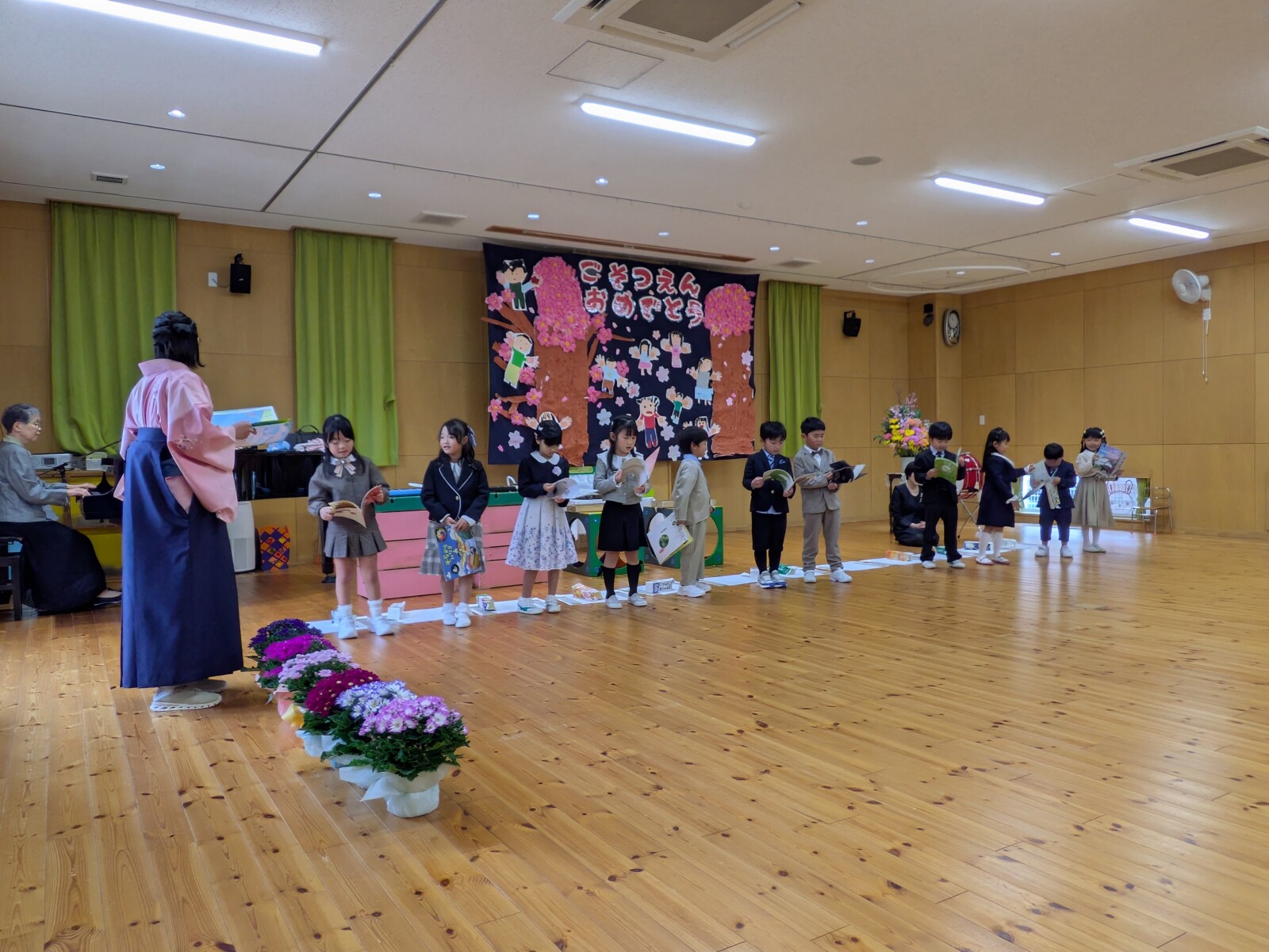 主任のみゆき先生の司会で、園長先生から聖書の言葉をいただきました。園長先生からは、お祝いのお話の代わりに、歌とピアノのプレゼントをいただきました。新しい一歩を踏み出す励ましの歌でした。