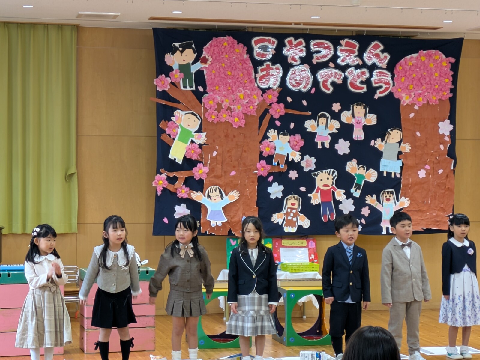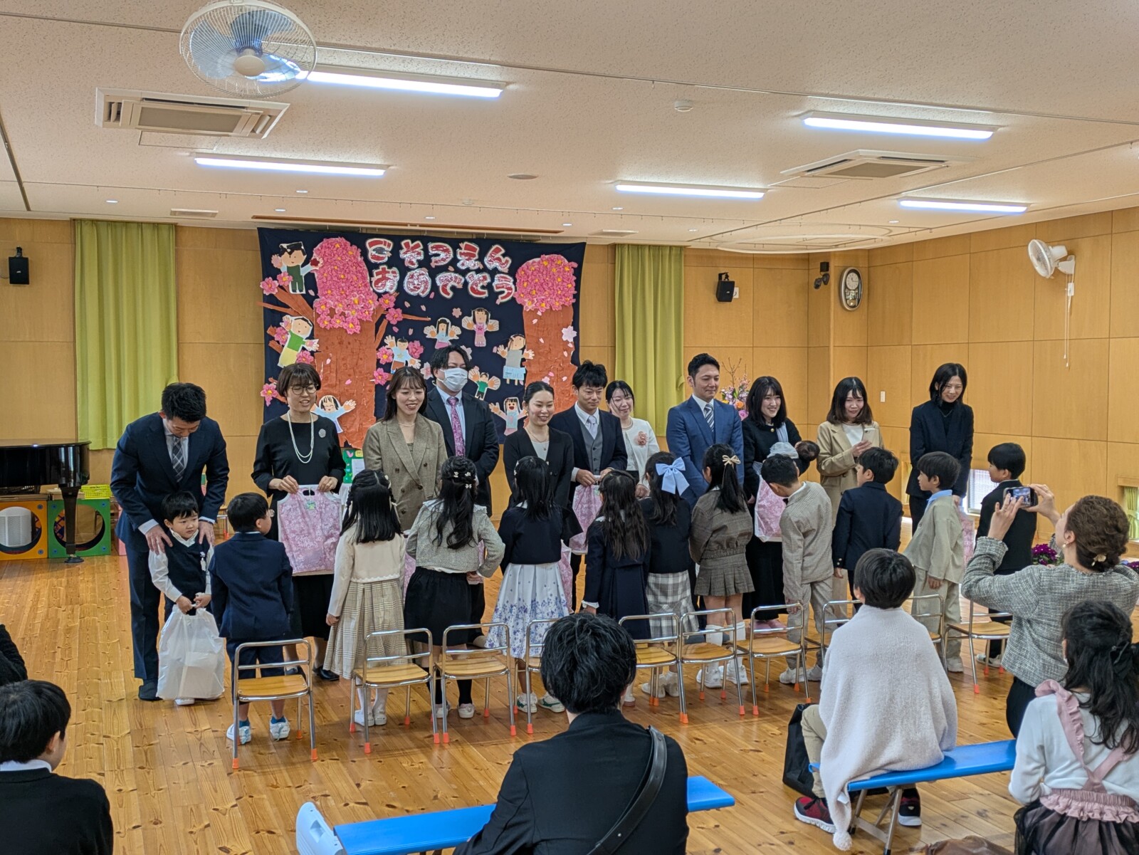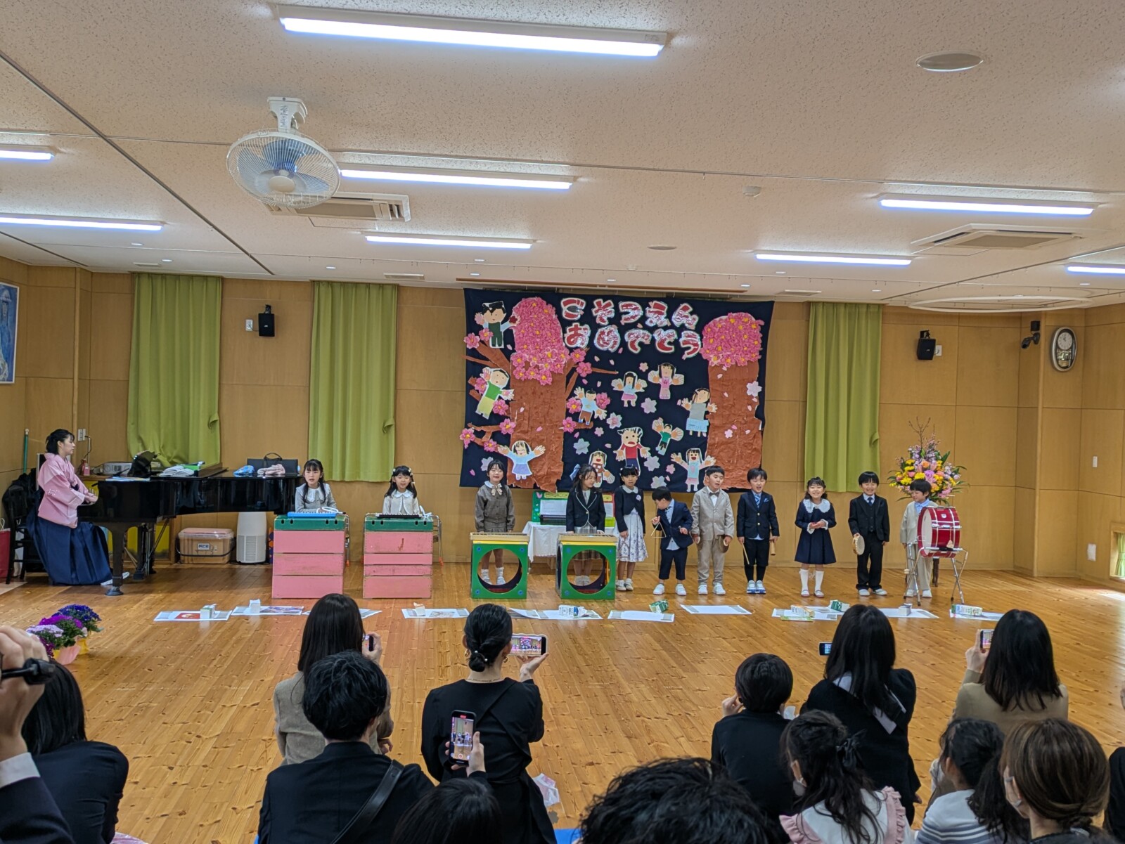 式の後は、お祝い会で、歌と合奏の発表と記念品のプレゼントがあり、先生からは劇と讃美歌のプレゼントがありました。