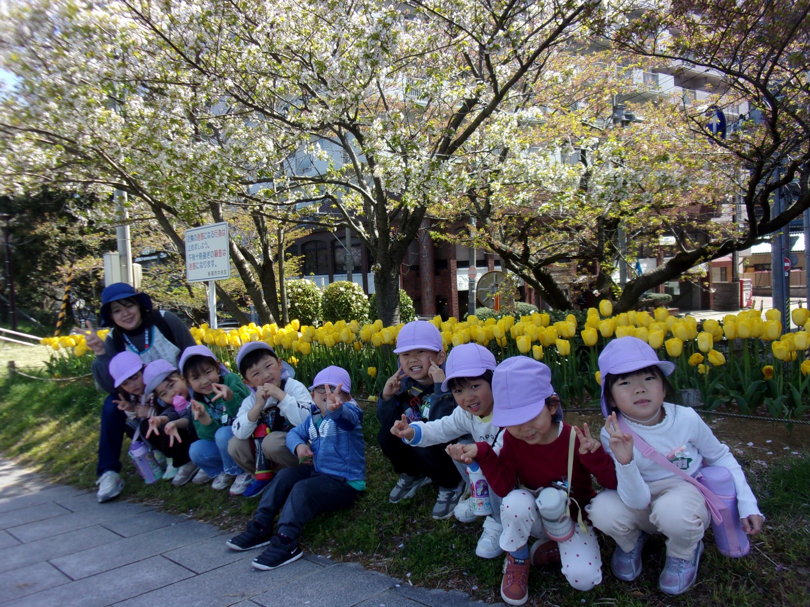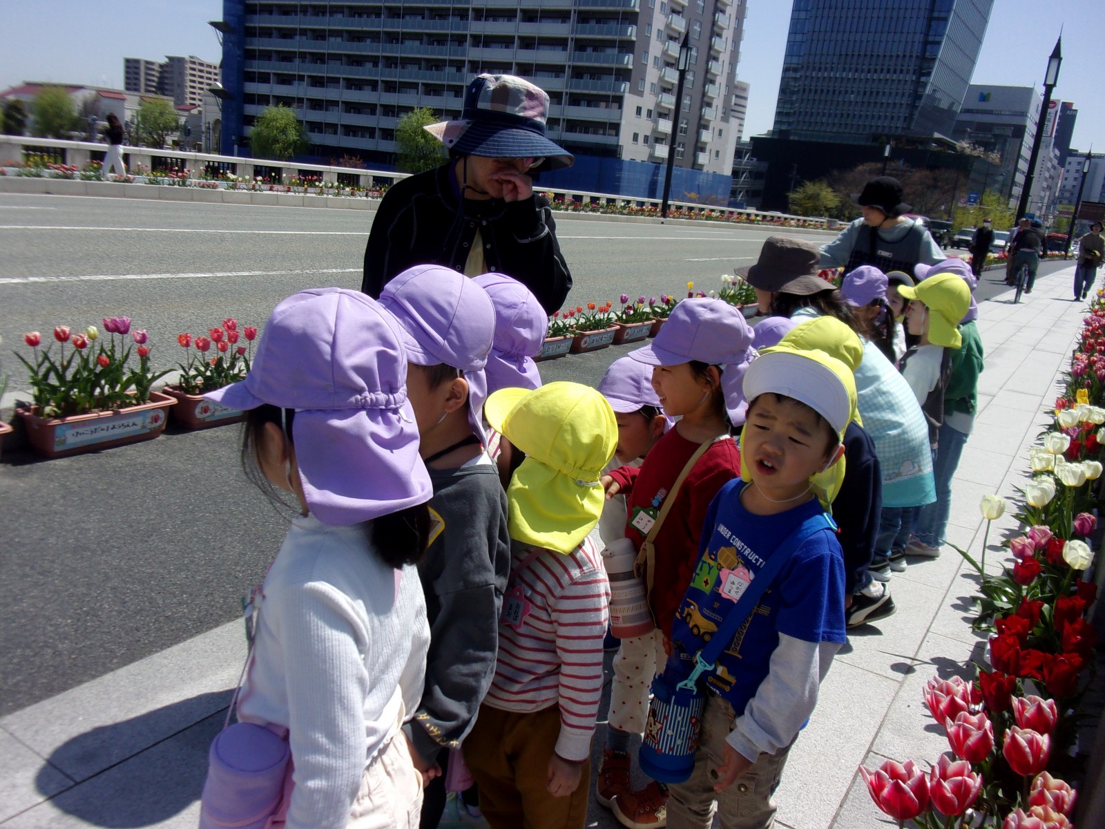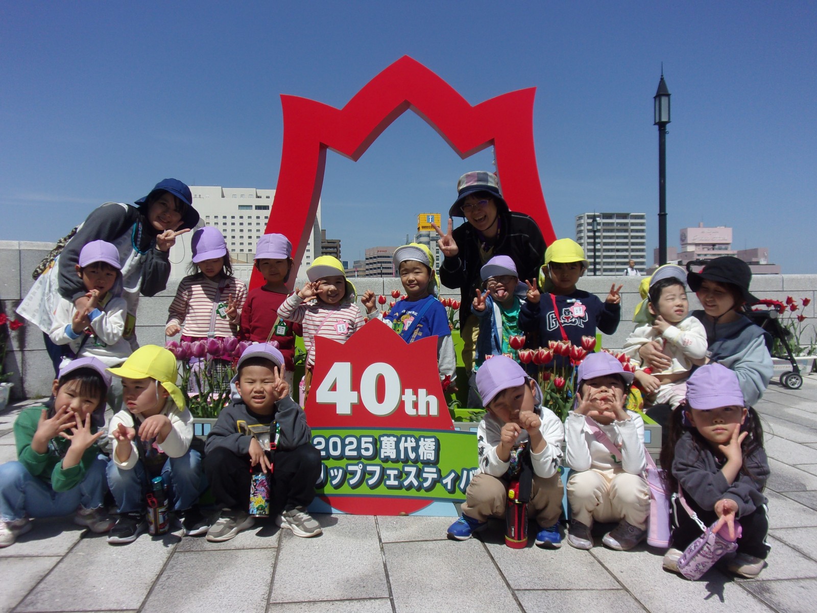 うめ組(5歳児)・ばら組(4歳児)の子どもたちが園バスに乗り、萬代橋チューリップフェスティバル見学に行ってきました。少し暑さを感じるくらいのとてもよいお天気でした。うめ組さんはNST前から萬代橋を歩きやすらぎ提でよもぎつみをしました。ばら組さんは萬代橋のたもとからうめ組さんと合流し、手をつないでチューリップ見学をしました。昨年みんなで植えたチューリップはちょうど見頃で、とてもきれいでした。