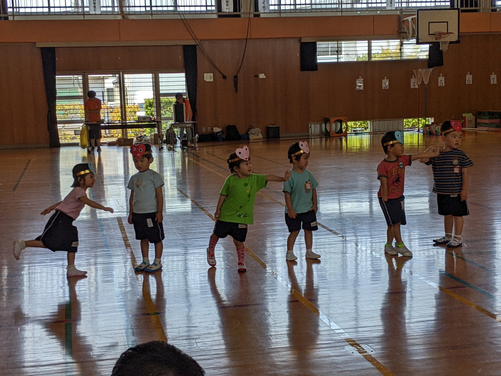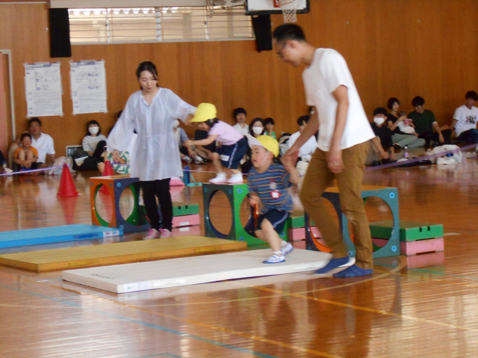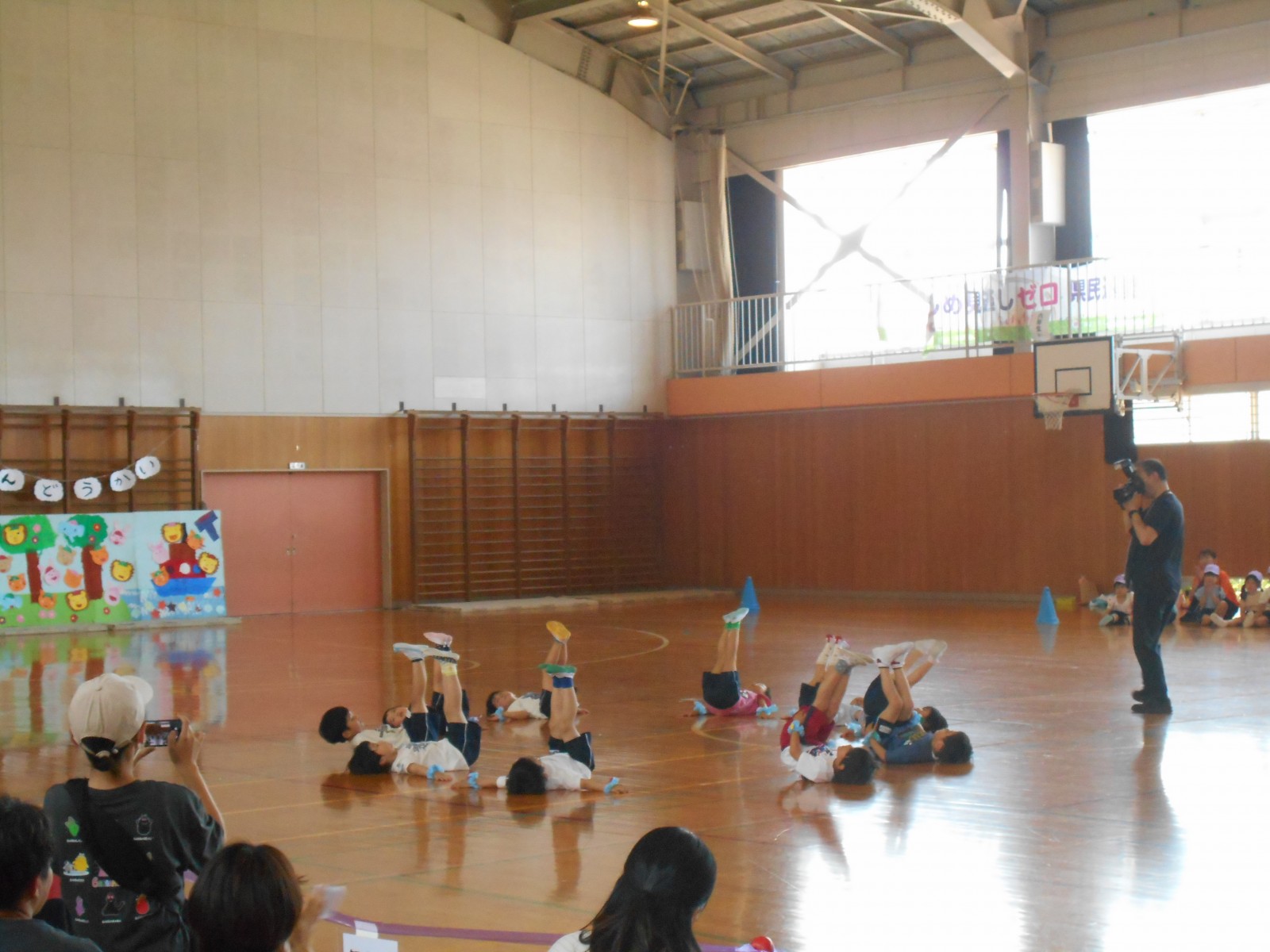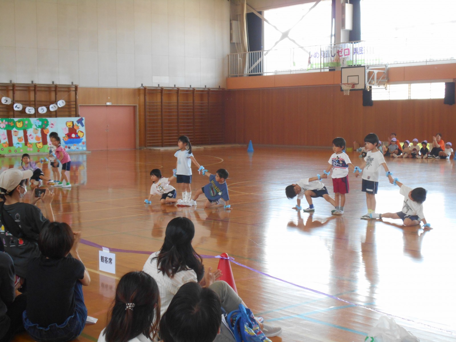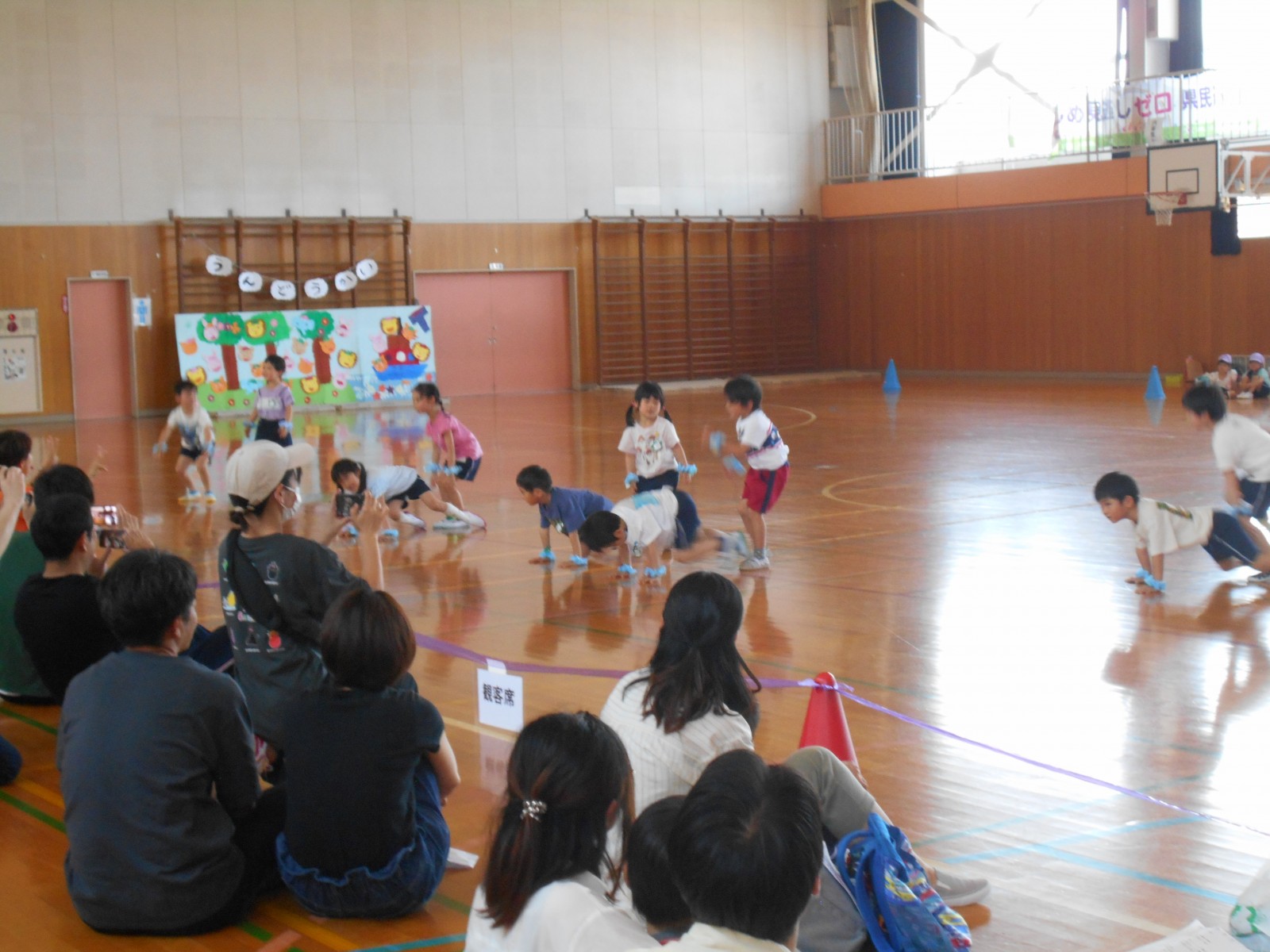 いつもと違う場所、広い体育館、たくさんのお家の方・・・始めは少し戸惑い気味の子どもたちでしたがプログラムが進むにつれ雰囲気にも慣れていき、園で楽しんでいる姿そのままをご覧いただけました。