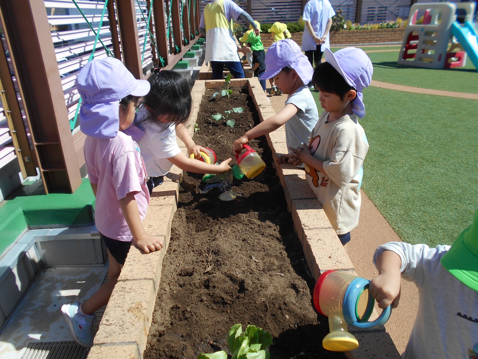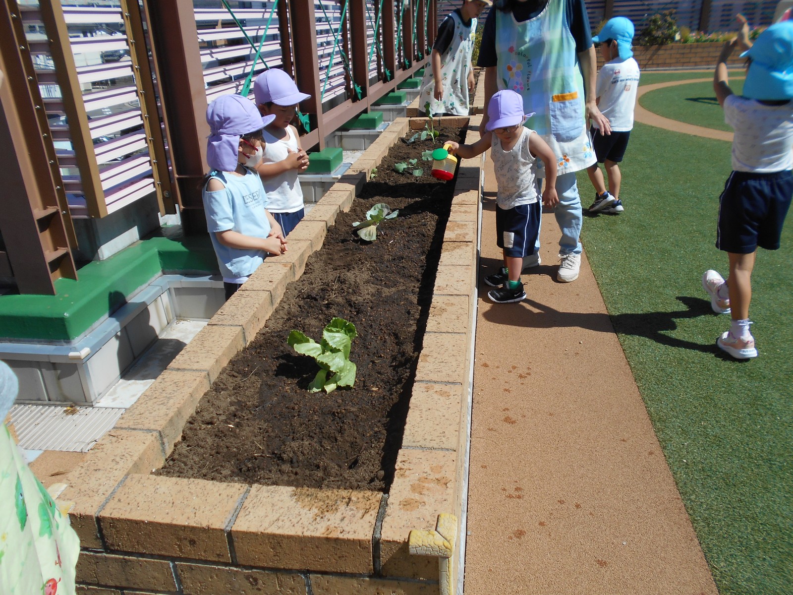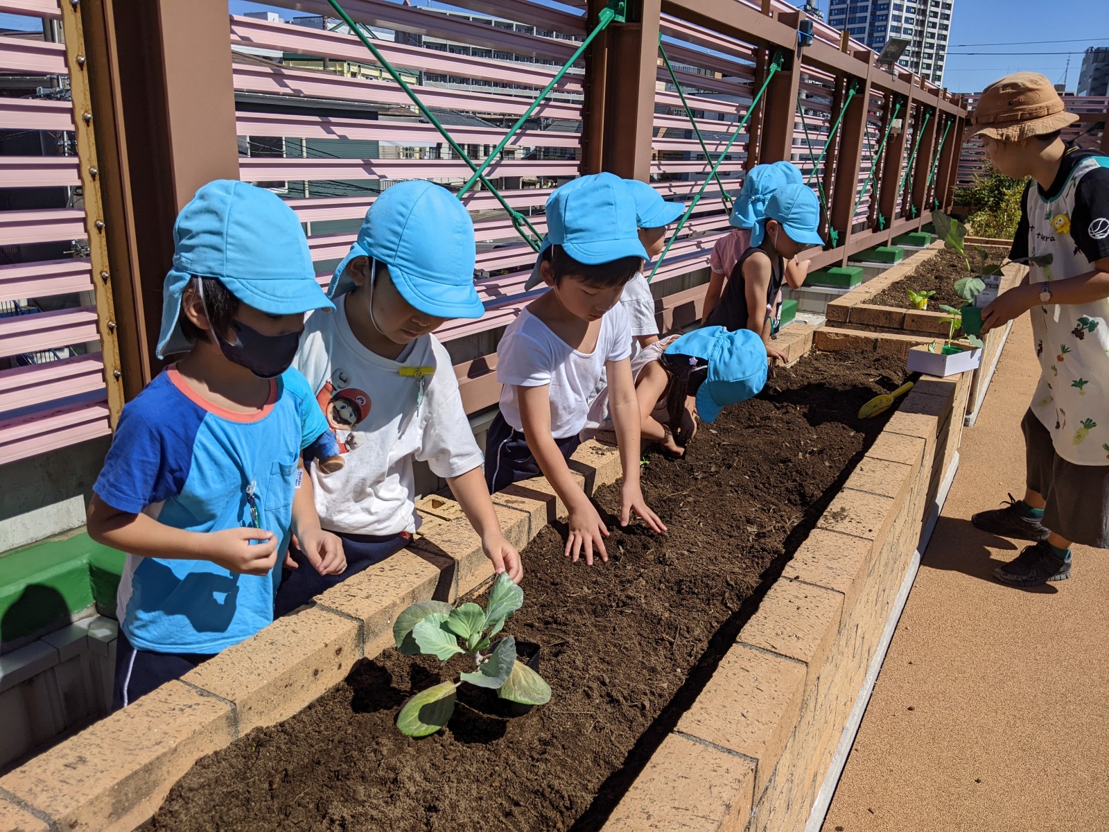 うめ組(5歳児)はブロッコリーと大根、ばら組(4歳児)はキャベツとレタス、すみれ組・ひよこ組(3歳児・満3歳児)はにんじんと白菜を育てます。