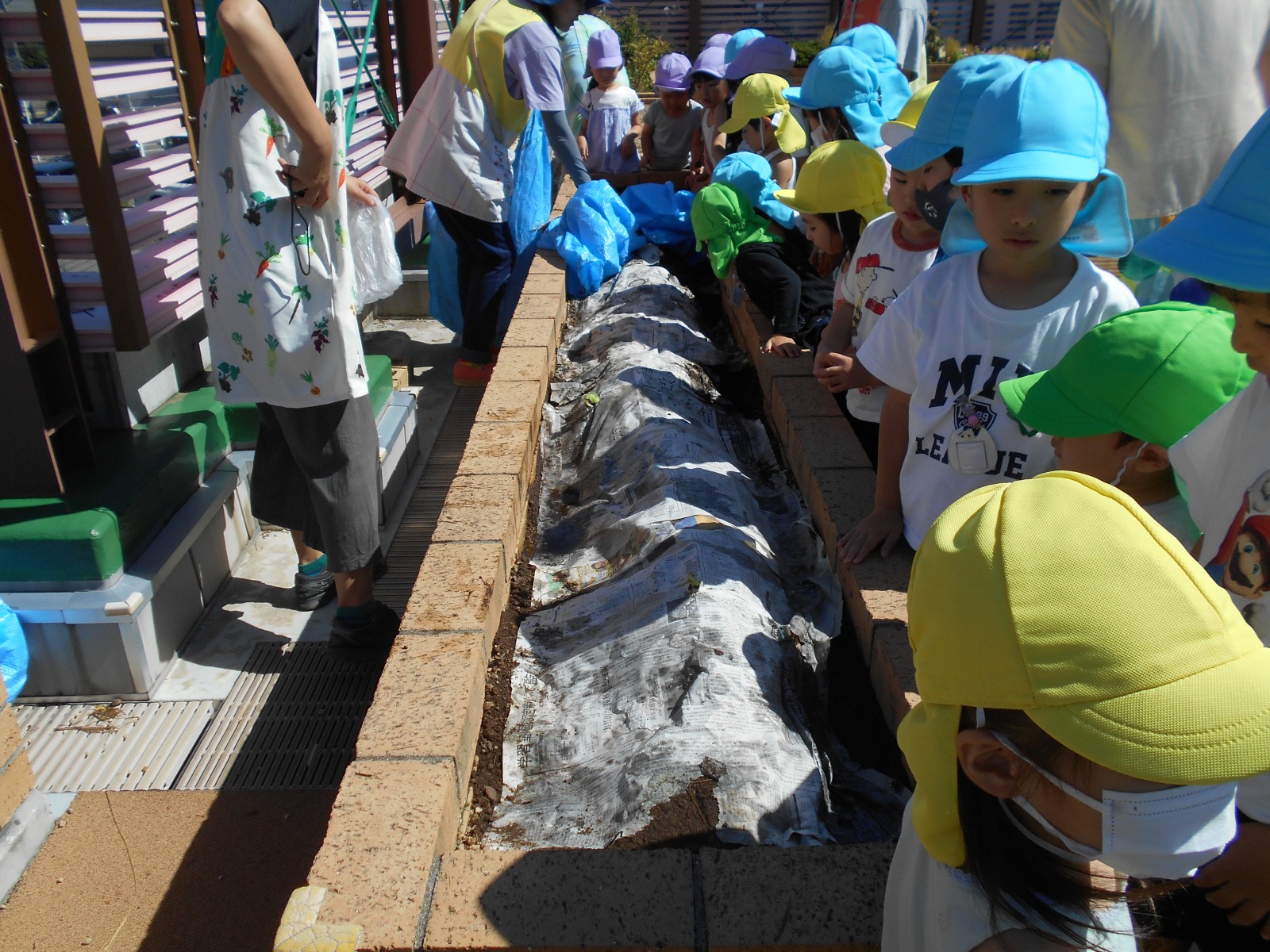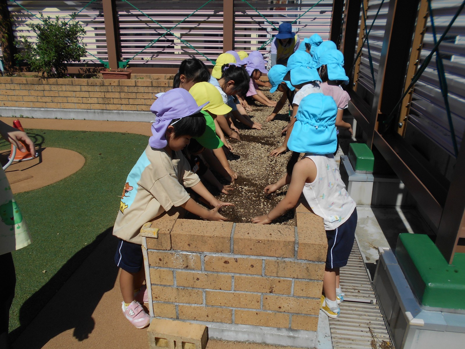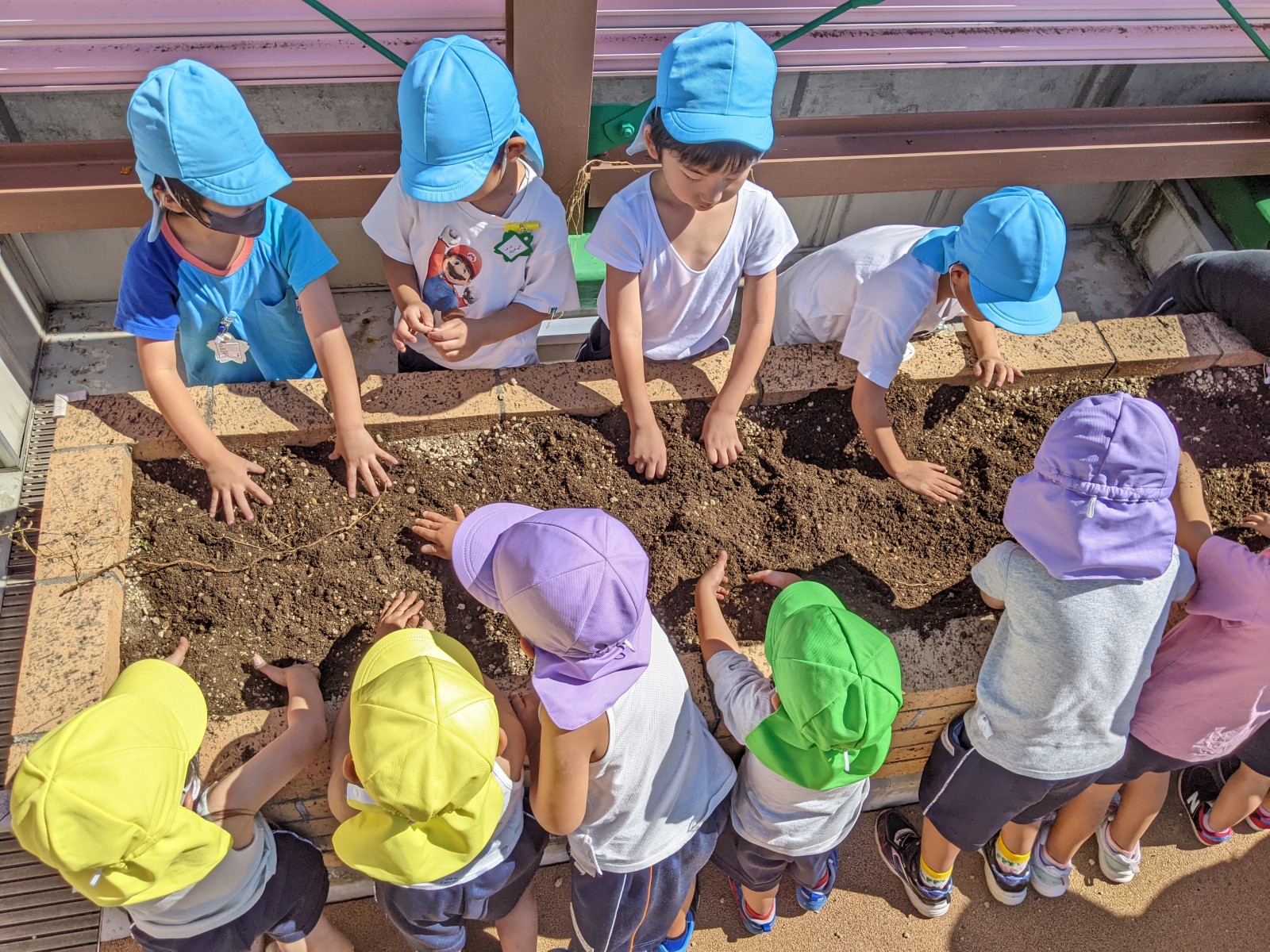 うめ組(5歳児)はブロッコリーと大根、ばら組(4歳児)はキャベツとレタス、すみれ組・ひよこ組(3歳児・満3歳児)はにんじんと白菜を育てます。