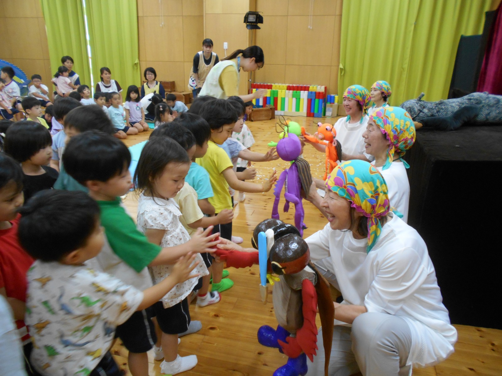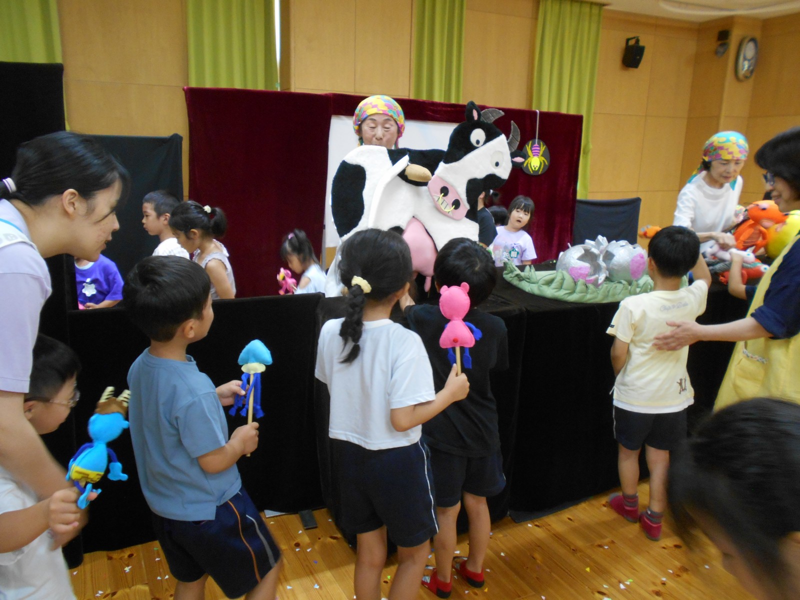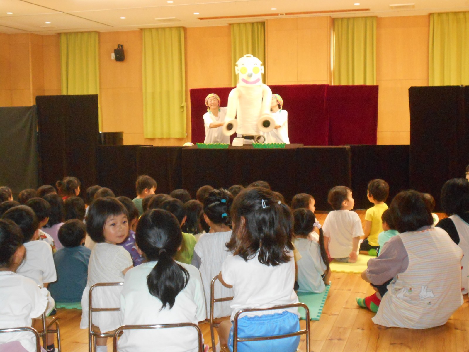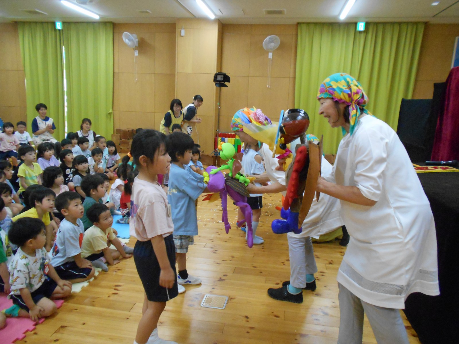 第一園のホールでちょうちん座の人形劇を見ました。今年のお話は『ちょうちんボードビル“のはらにハイホー”』『ふんまんじゅうの謎』です。ストーリー、音楽、人形、小道具等全てがちょうちん座のオリジナルで毎年子どもたちに大人気の人形劇です。観劇後は年長児のみ舞台裏探検をして人形との触れ合いを楽しみました。