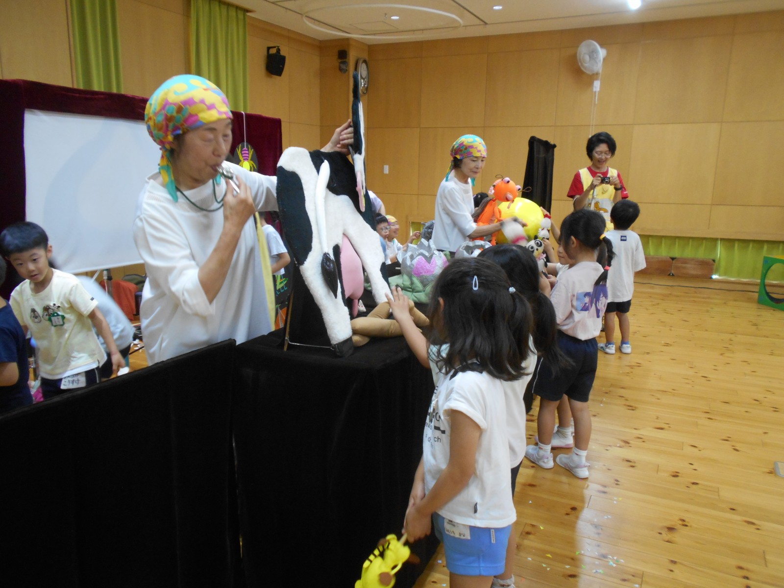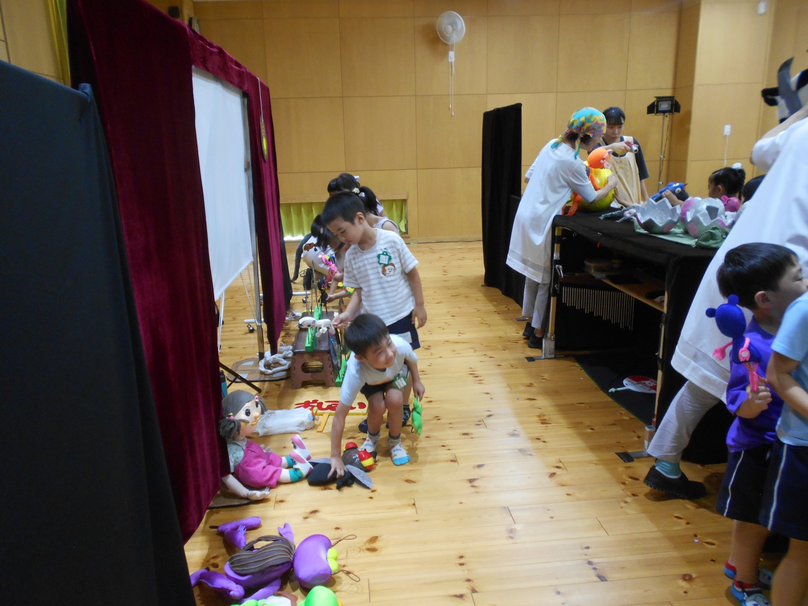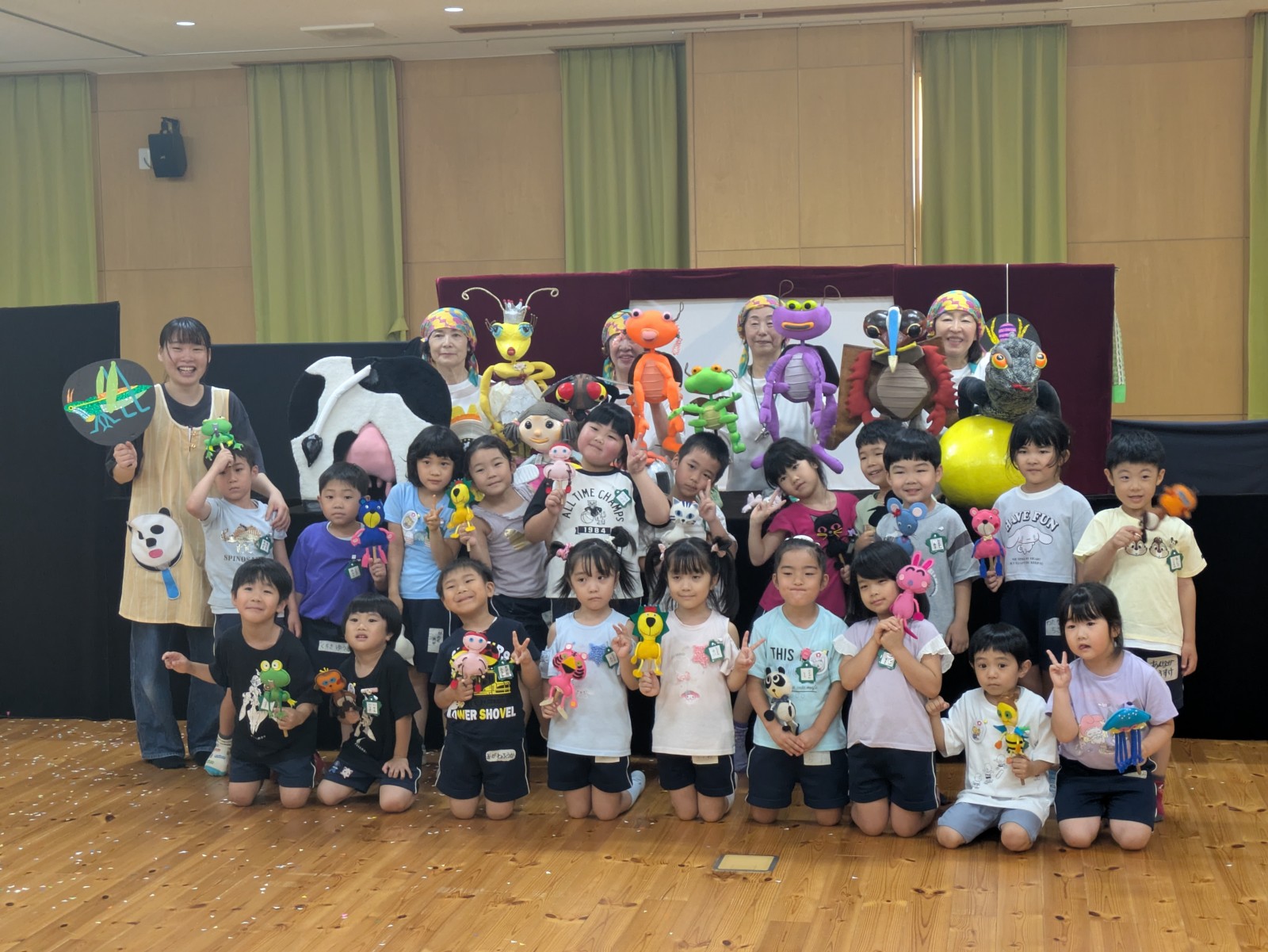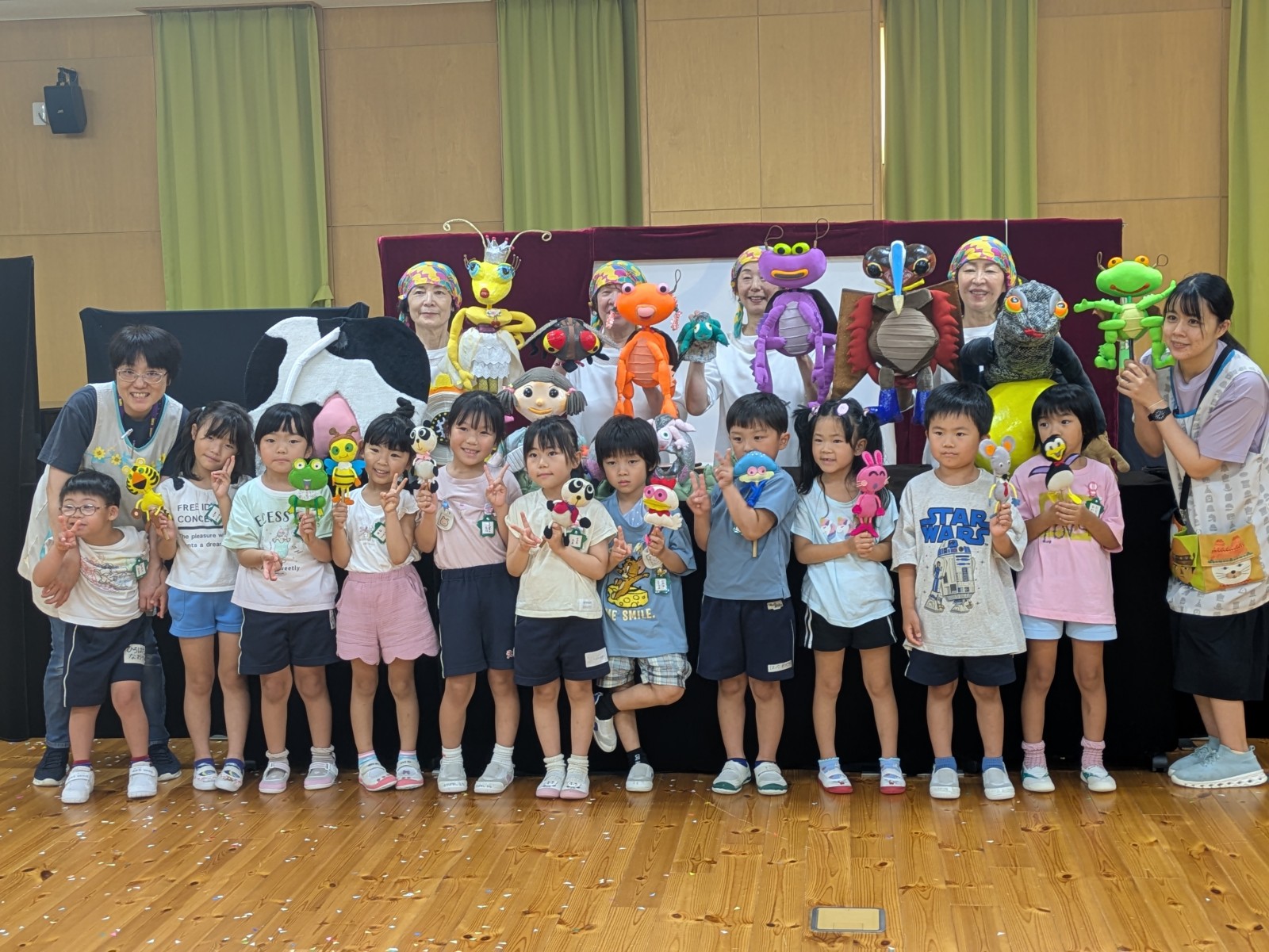 第一園のホールでちょうちん座の人形劇を見ました。今年のお話は『ちょうちんボードビル“のはらにハイホー”』『ふんまんじゅうの謎』です。ストーリー、音楽、人形、小道具等全てがちょうちん座のオリジナルで毎年子どもたちに大人気の人形劇です。観劇後は年長児のみ舞台裏探検をして人形との触れ合いを楽しみました。