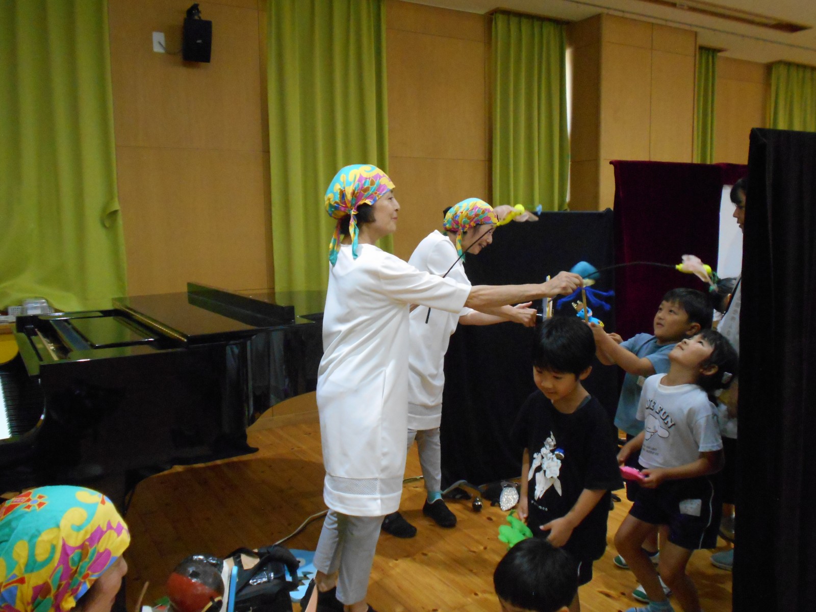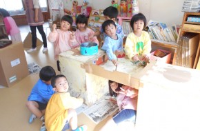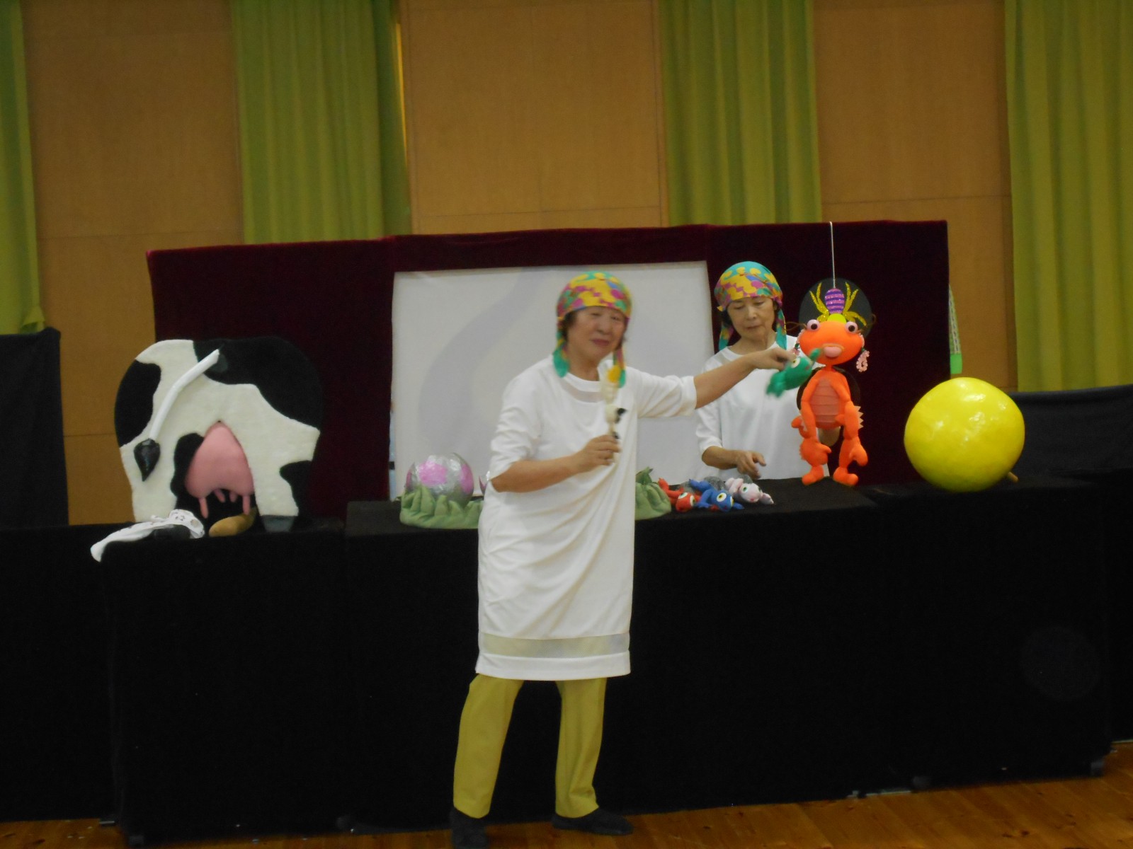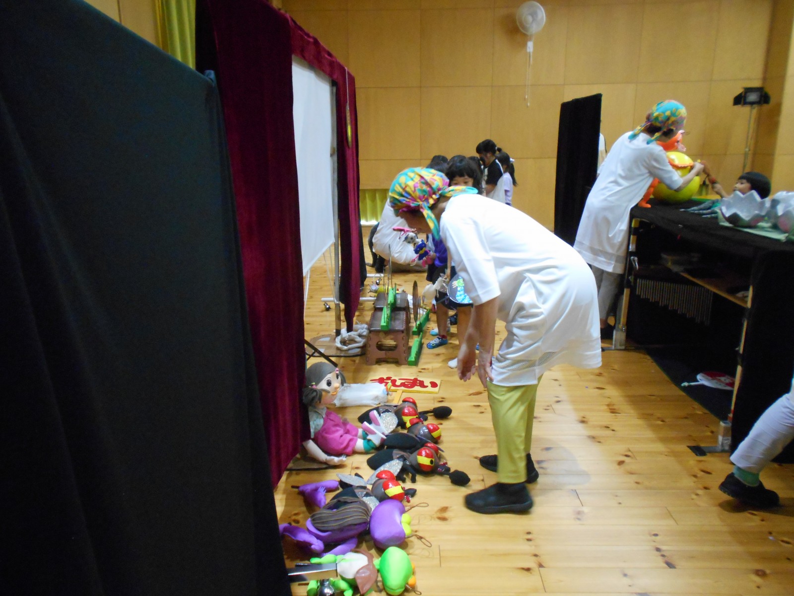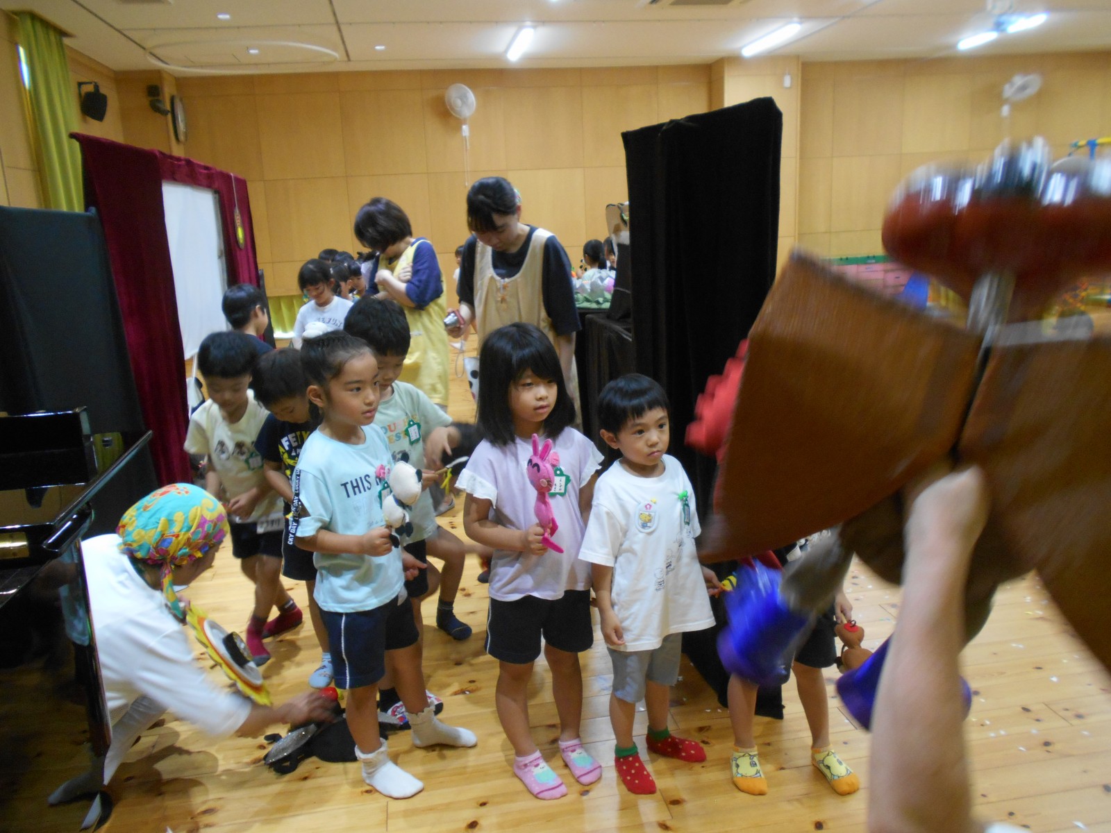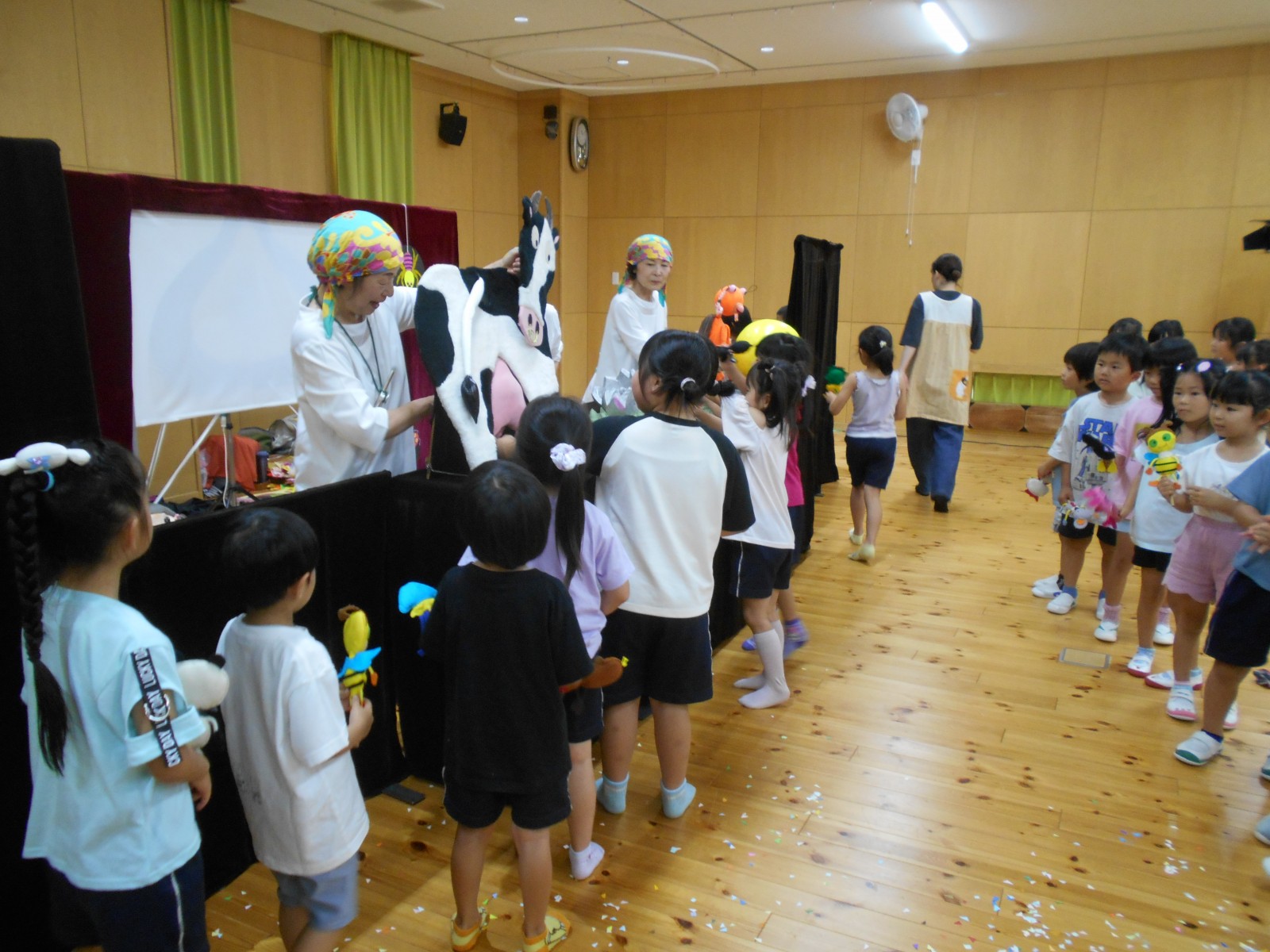 第一園のホールでちょうちん座の人形劇を見ました。今年のお話は『ちょうちんボードビル“のはらにハイホー”』『ふんまんじゅうの謎』です。ストーリー、音楽、人形、小道具等全てがちょうちん座のオリジナルで毎年子どもたちに大人気の人形劇です。観劇後は年長児のみ舞台裏探検をして人形との触れ合いを楽しみました。