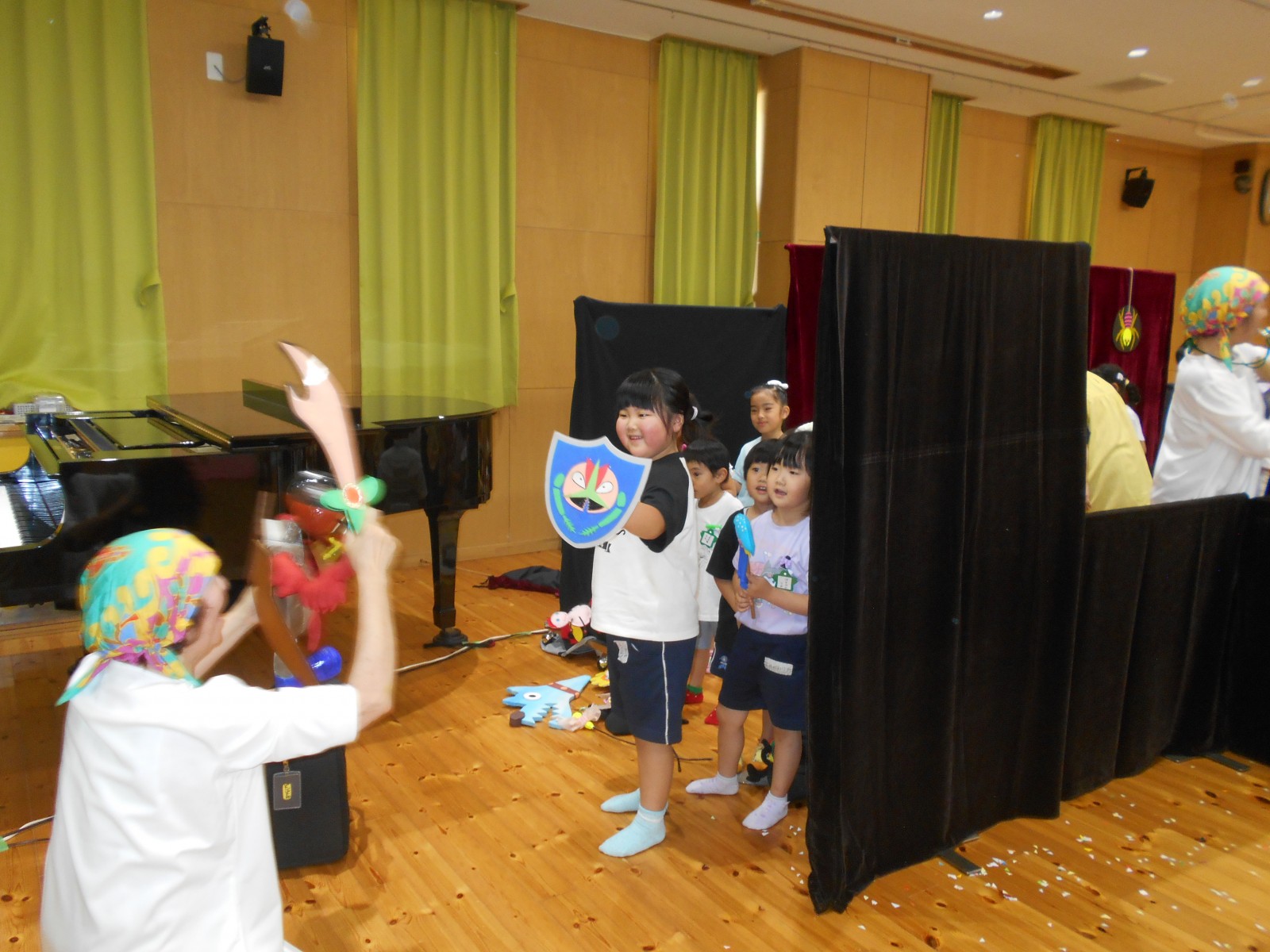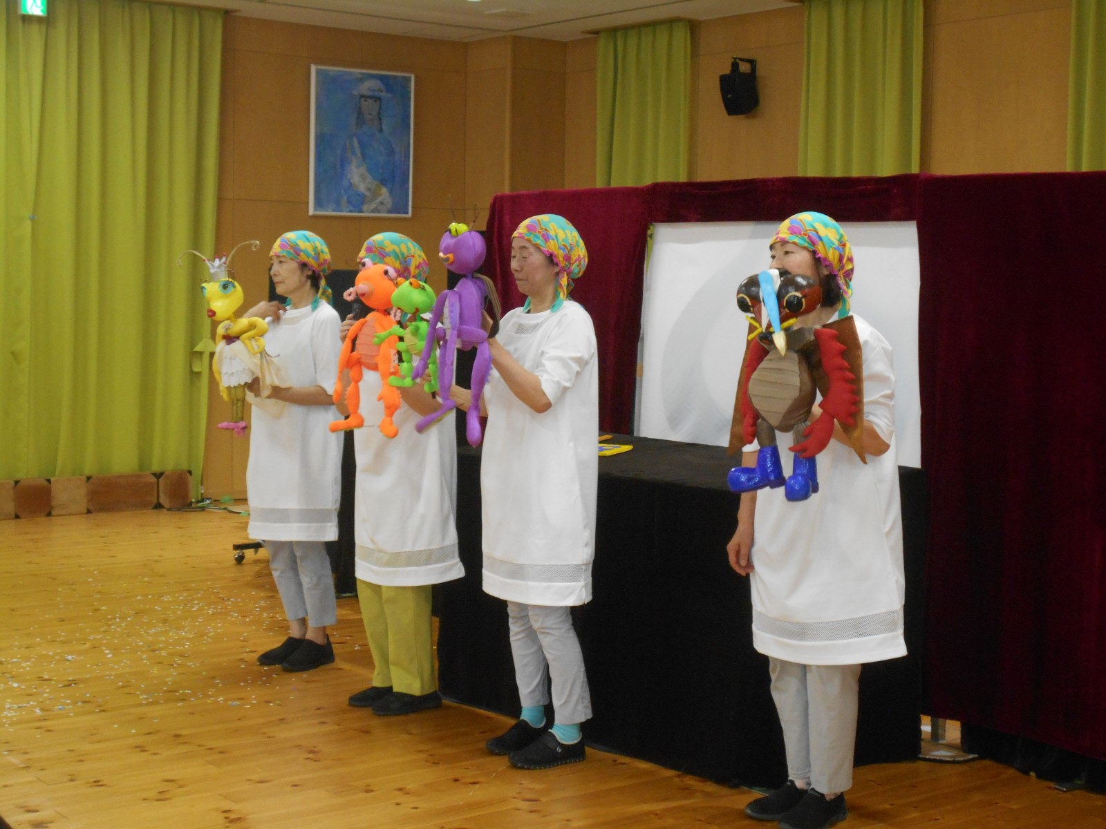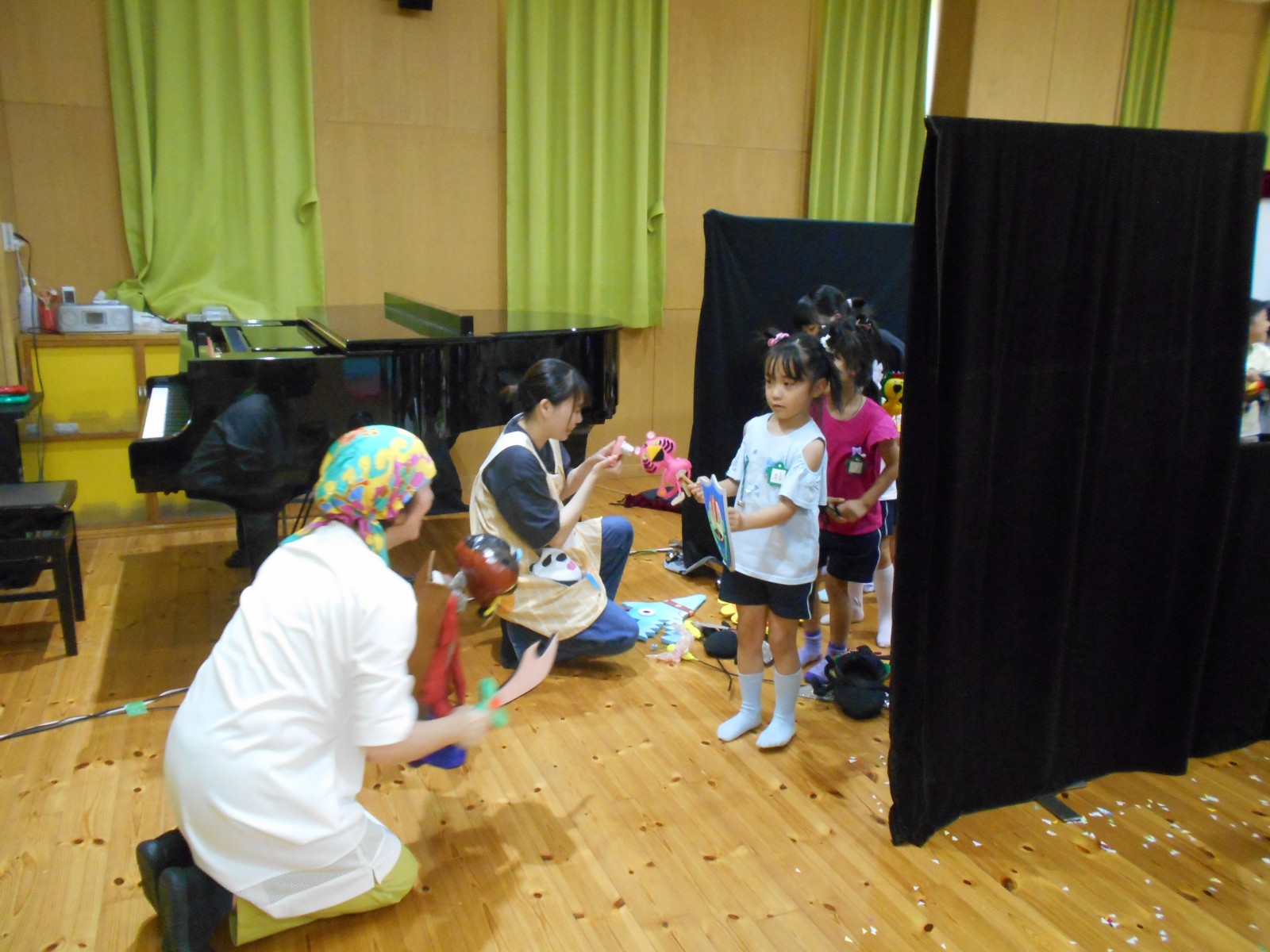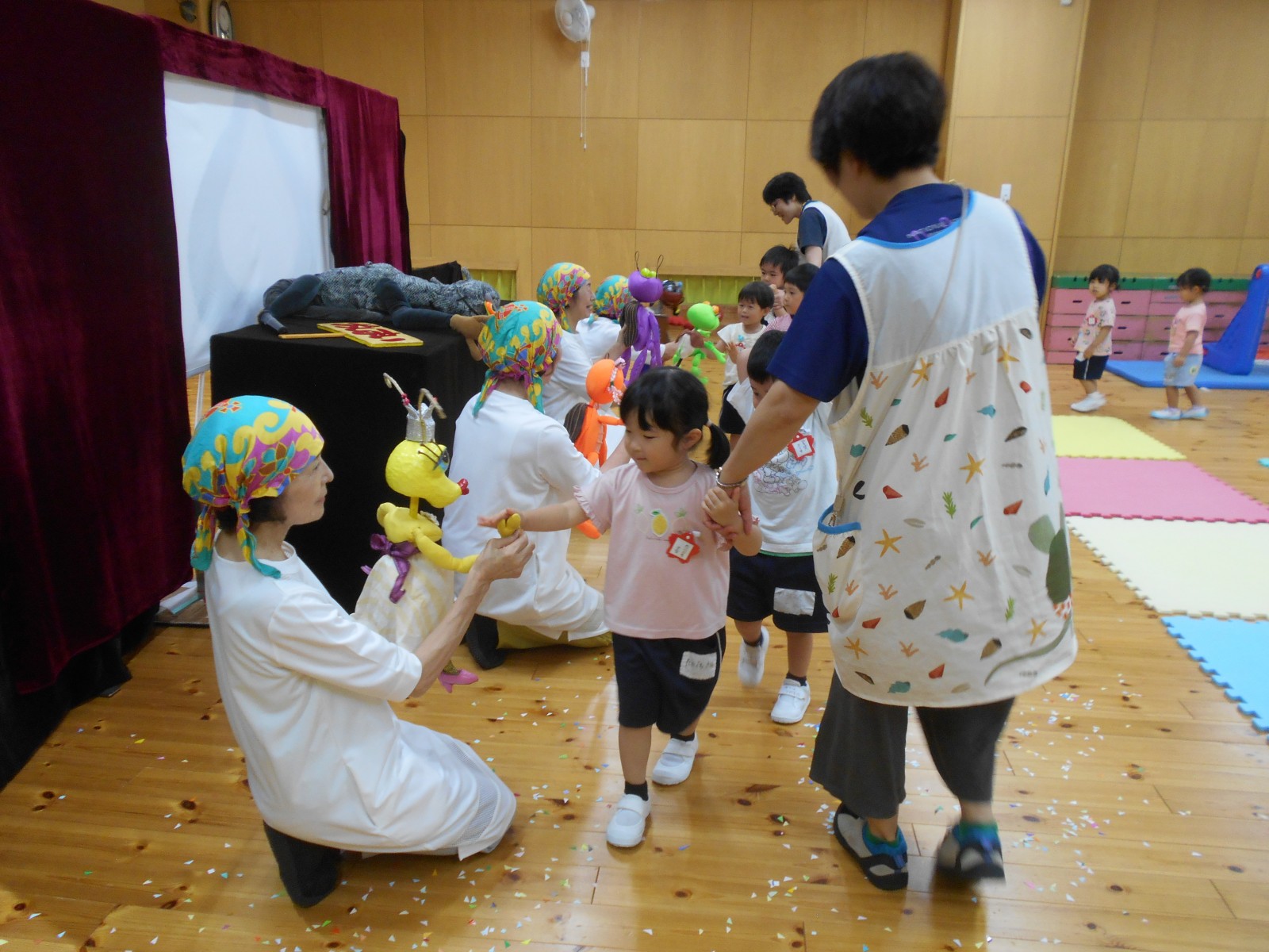 第一園のホールでちょうちん座の人形劇を見ました。今年のお話は『ちょうちんボードビル“のはらにハイホー”』『ふんまんじゅうの謎』です。ストーリー、音楽、人形、小道具等全てがちょうちん座のオリジナルで毎年子どもたちに大人気の人形劇です。観劇後は年長児のみ舞台裏探検をして人形との触れ合いを楽しみました。