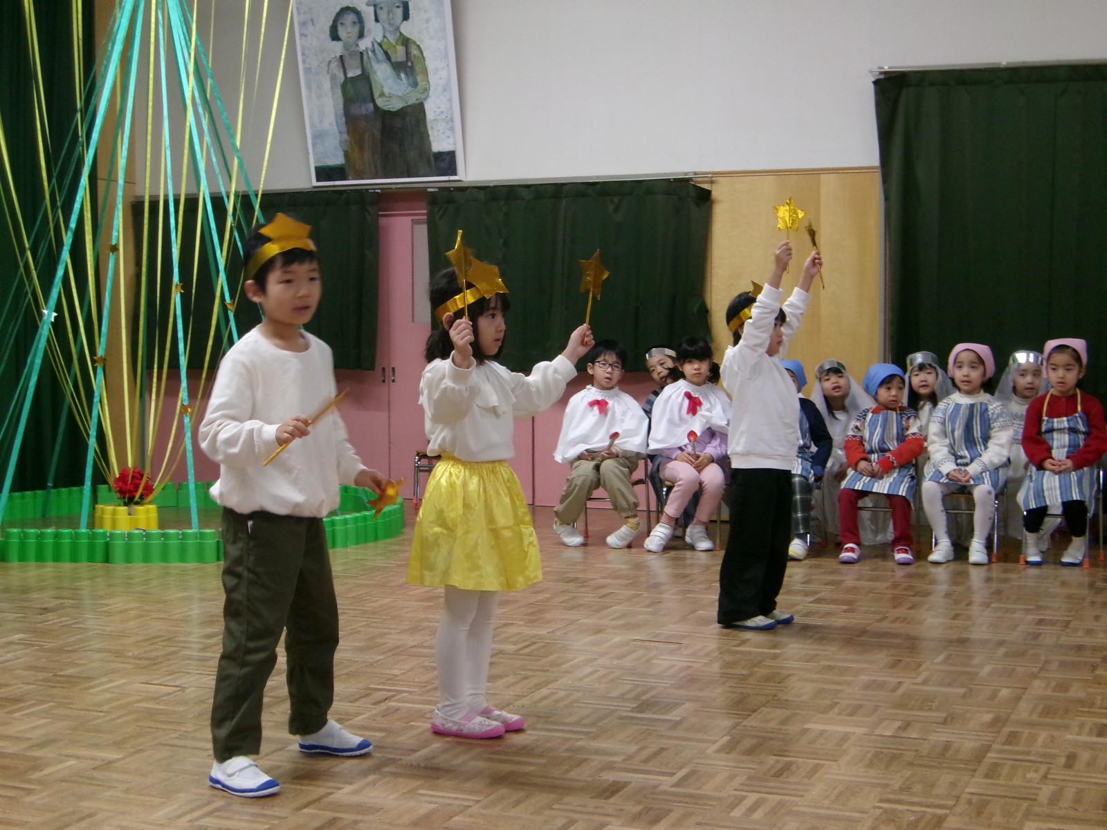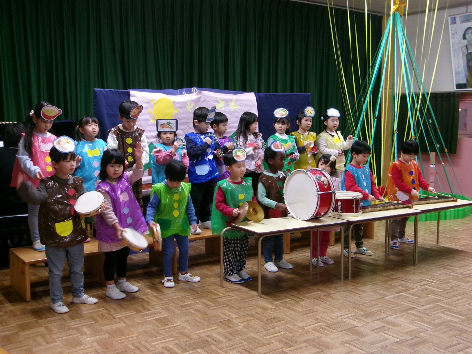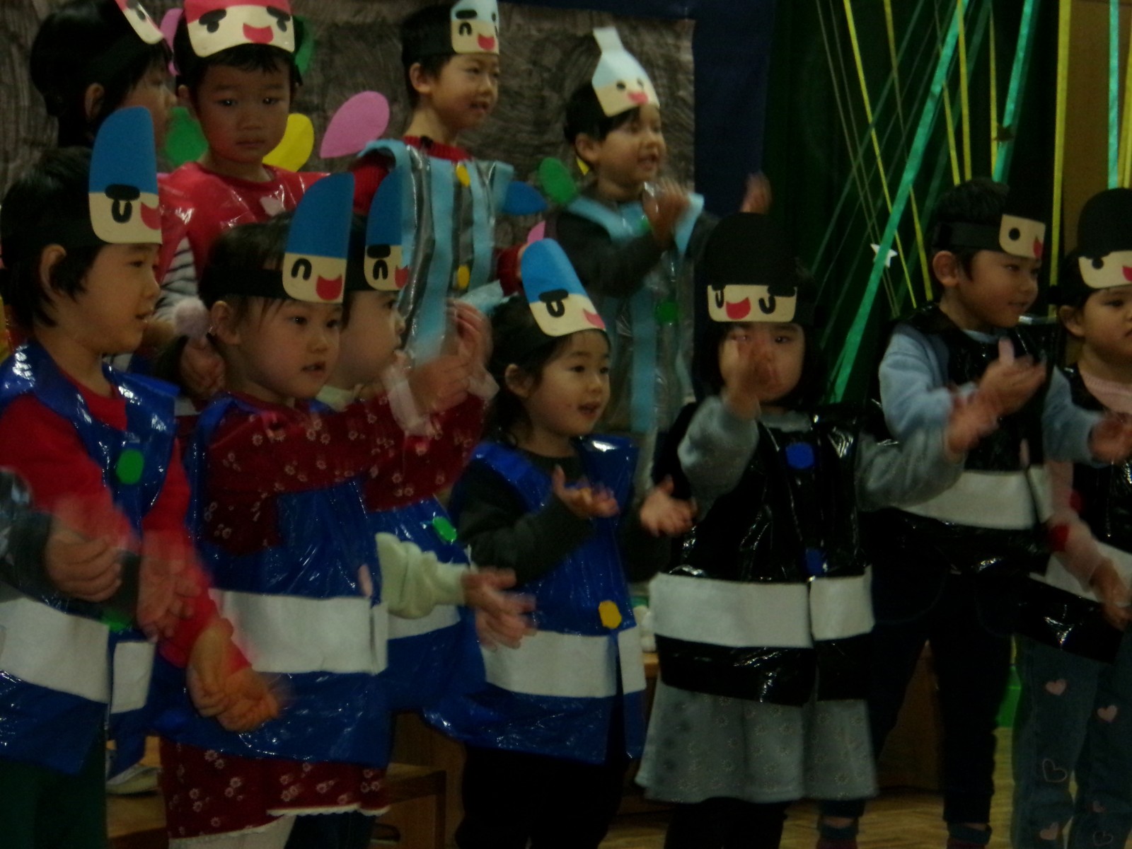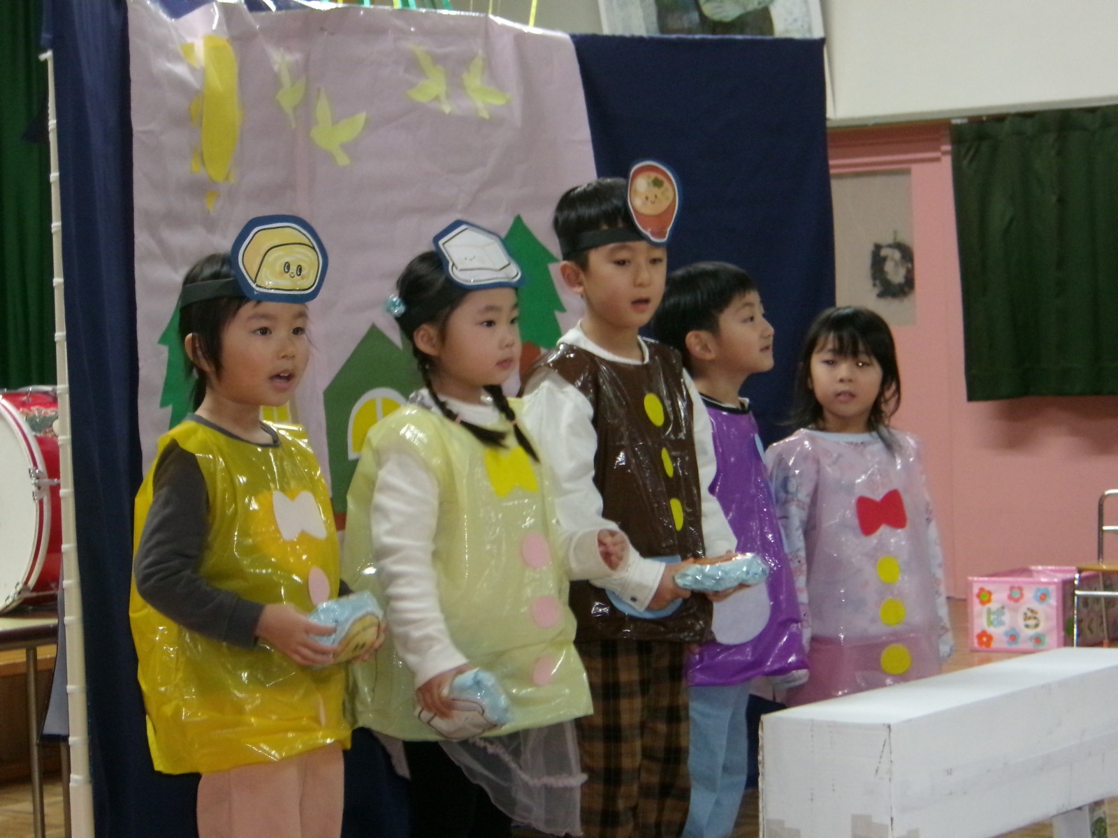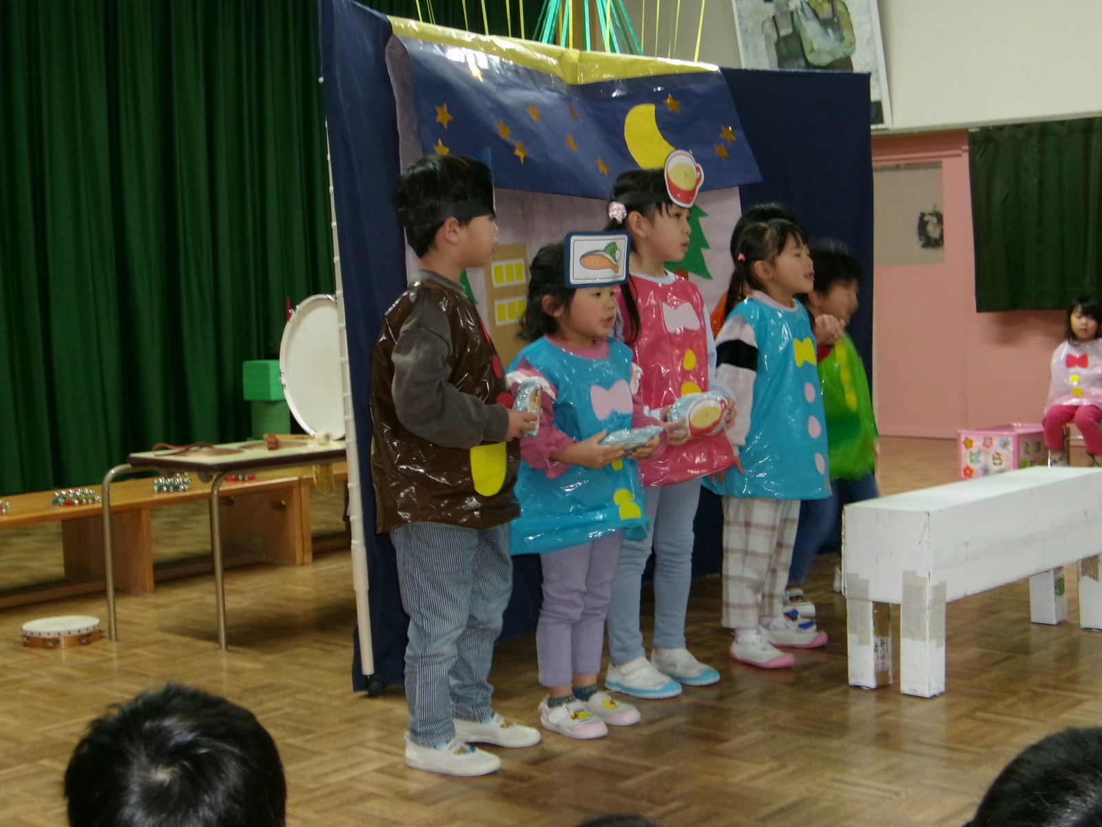 祝会第一部は、すみれ組さんの劇「くれよんのくろくん」、ダンス「サンタが町にやってくる」、ばら組さんの劇ごっこ「いただきまーす!ごはんのマーチ」、合奏「♪メリークリスマス」はどれもすべて元気いっぱい上手に発表できました。みんなが劇も歌も大好きで仲良く楽しんでいることが伝わってきました。